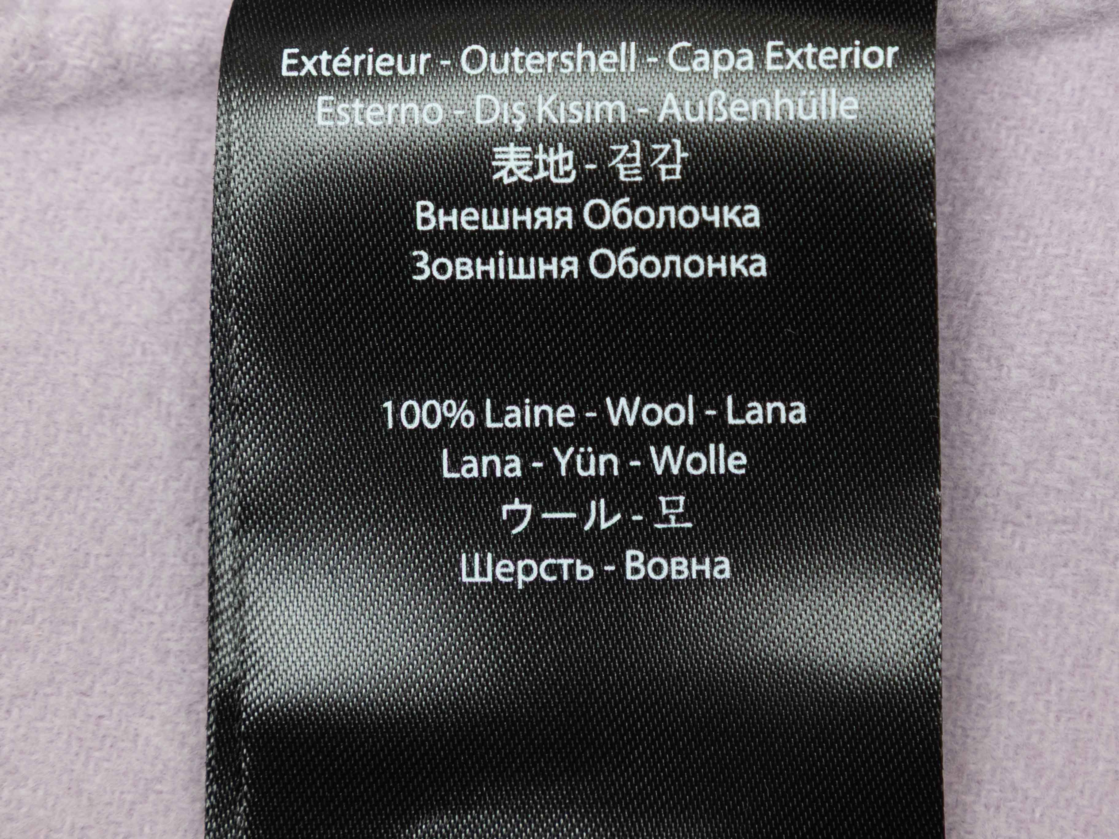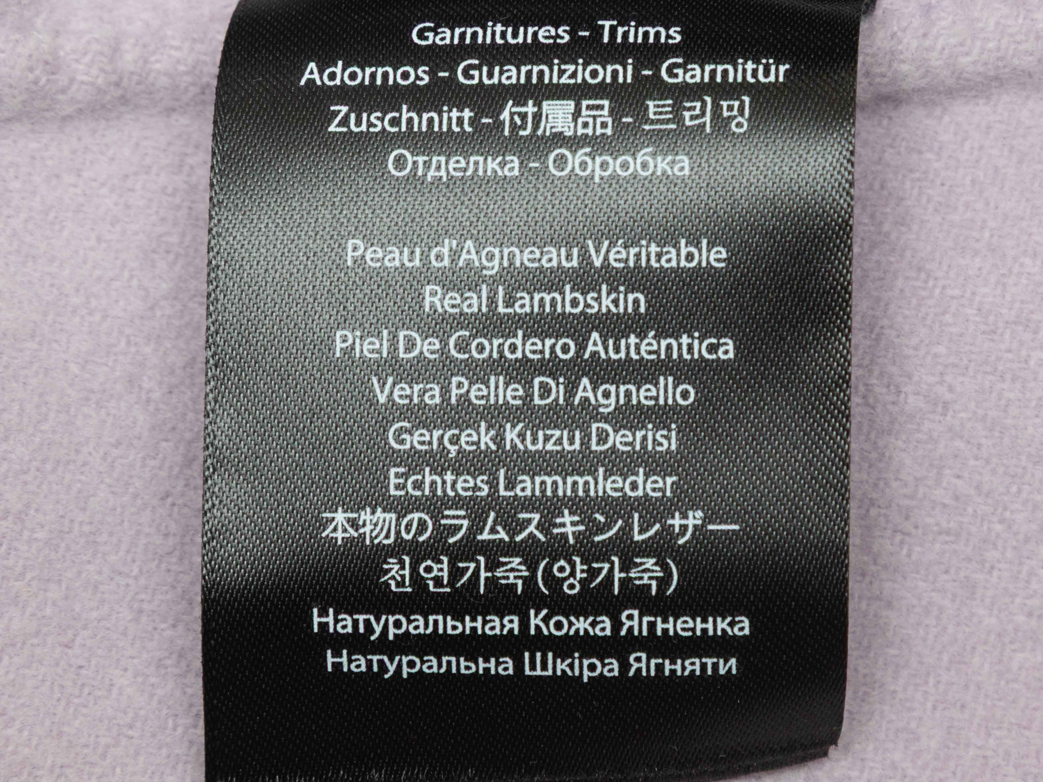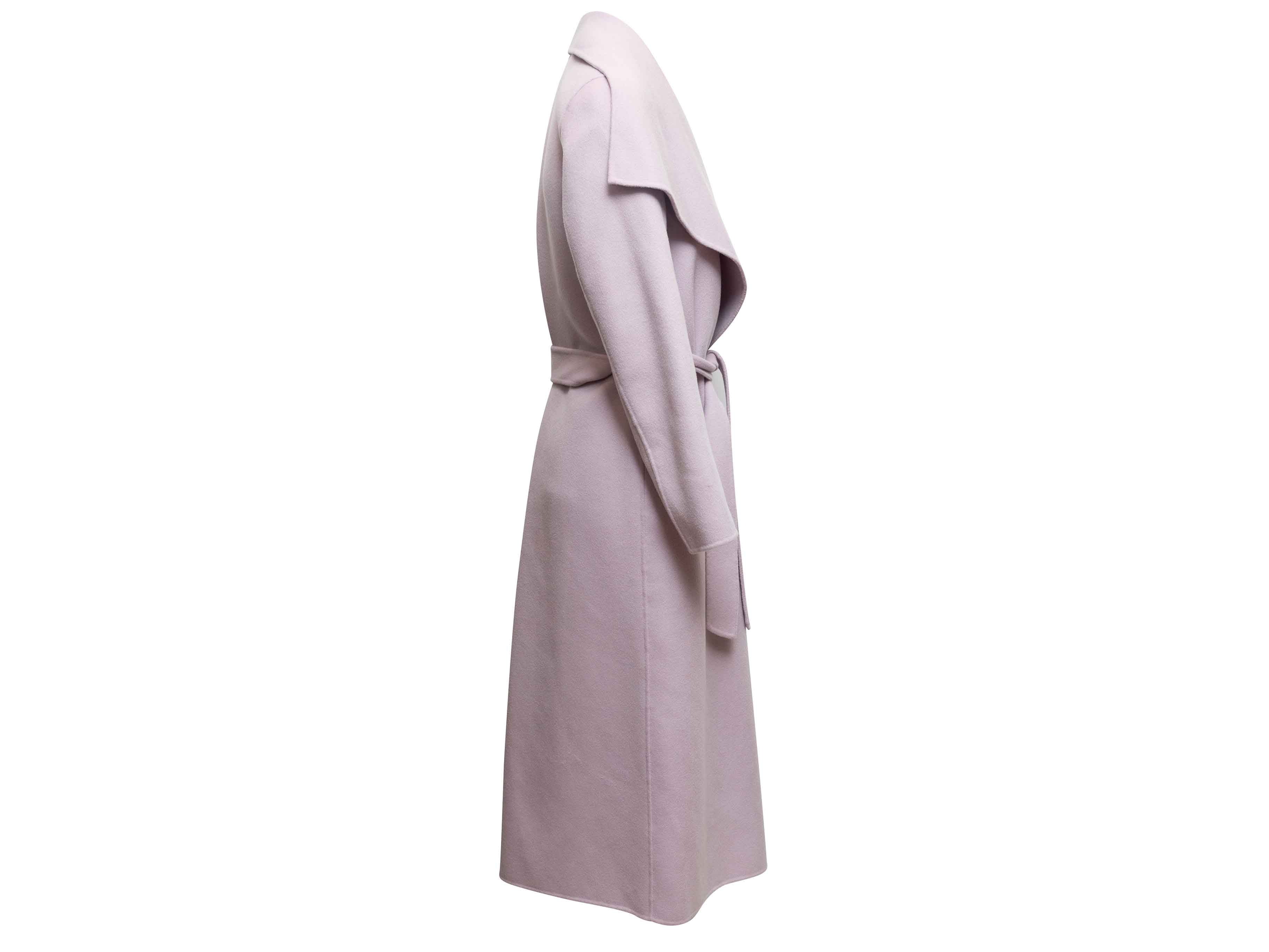 Product Details: Lilac wool leather-trimmed long coat by Mackage. Oversized collar. Dual hip pockets. Sash tie closure at waist. 34" bust, 17" shoulder width, 24" sleeve length, 50" length.