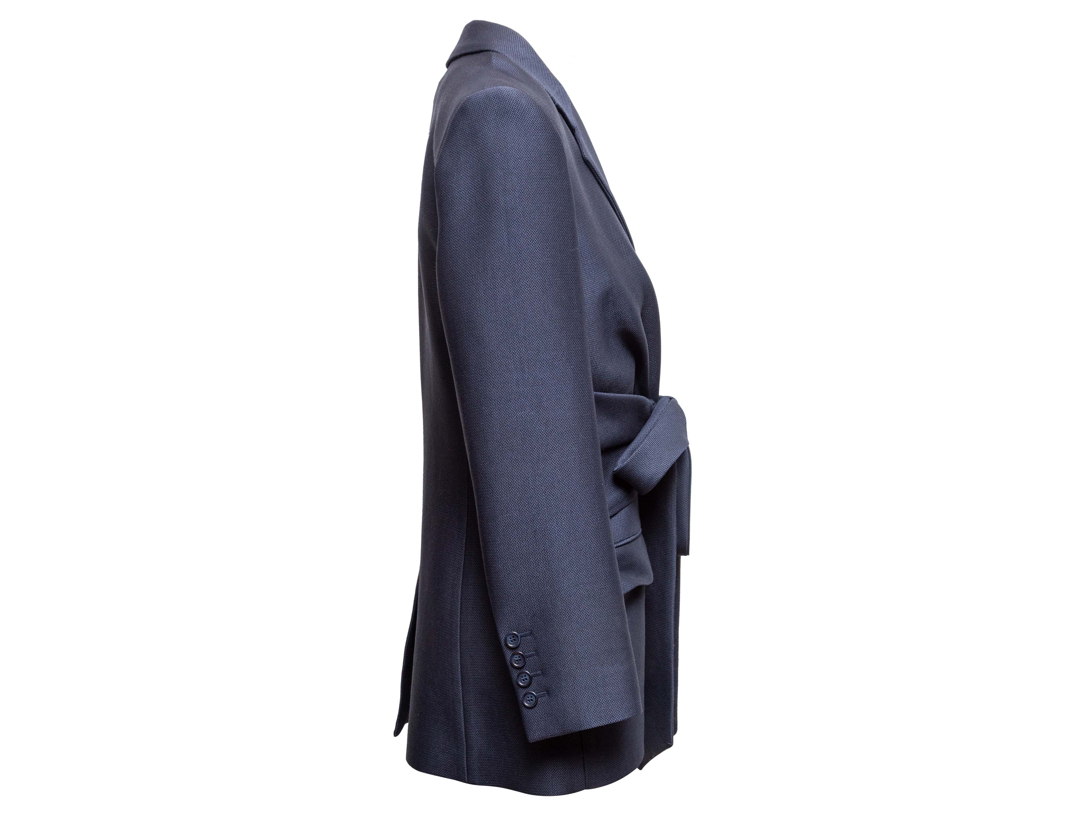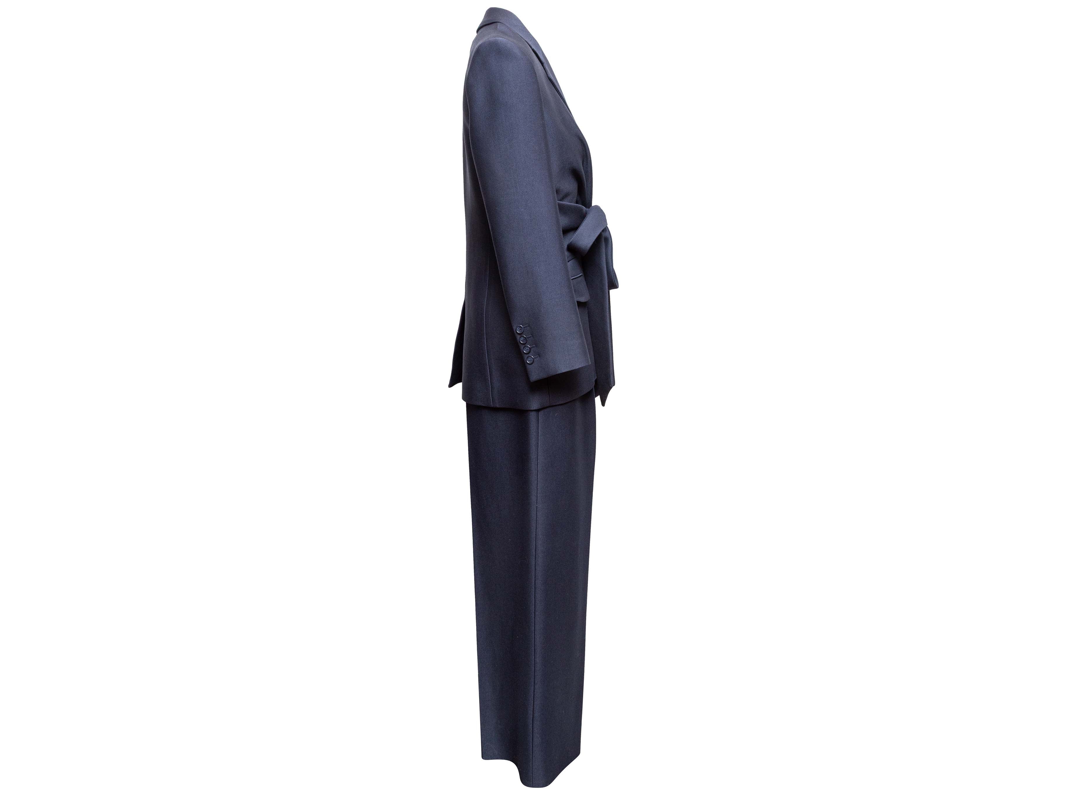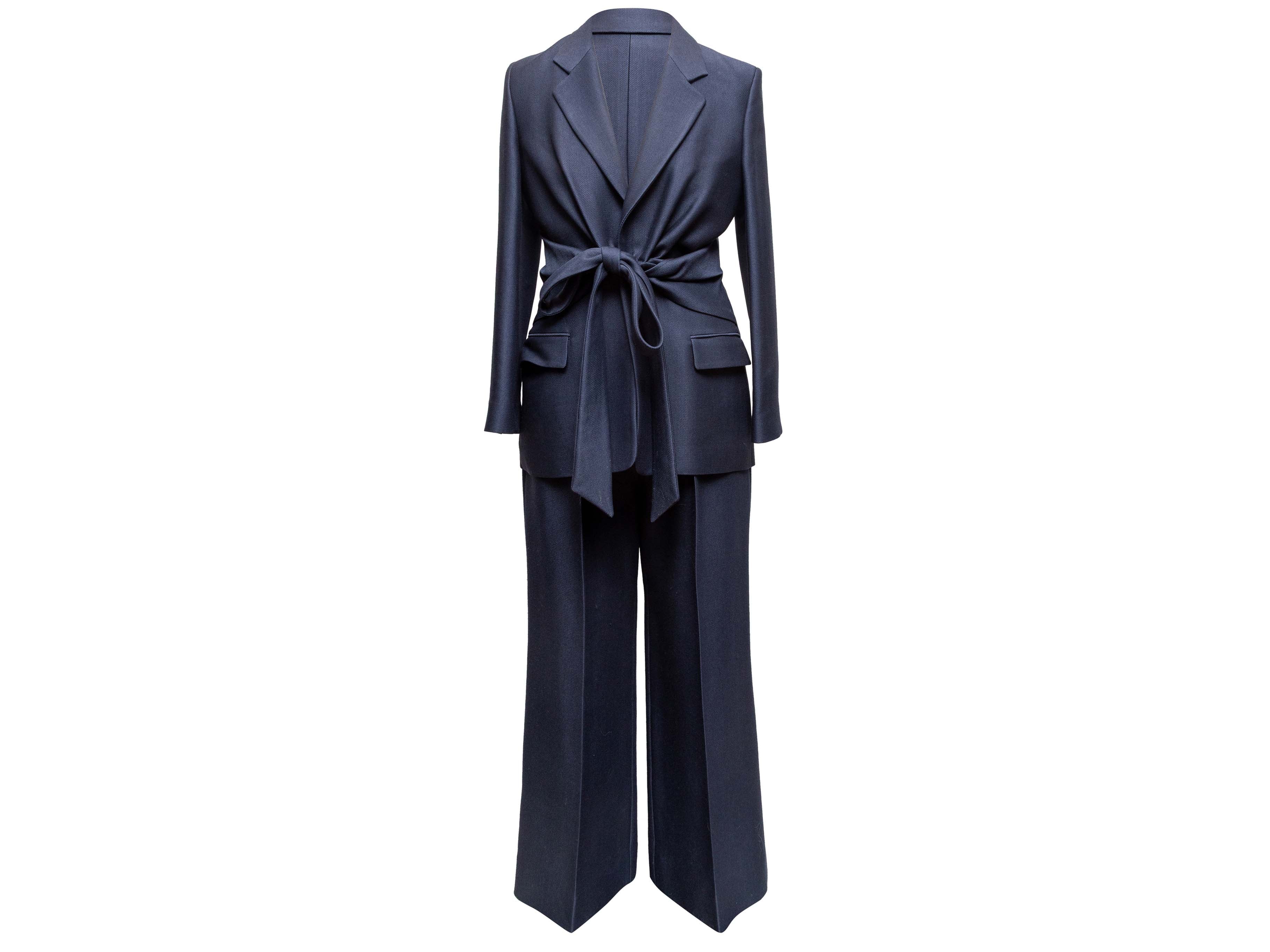 Product Details: Navy virgin wool and silk-blend pant suit by Gabriela Hearst. Blazer features notched collar, dual hip pockets, and sash tie closure at waist. Pants feature pleated wide legs, belt at waist, four pockets, and front zip closure. Blazer- 42" bust, 16.5" shoulder width, 24" sleeve length, 28" length; Pants- 30" waist, 36" hips, 29.5" inseam, 14" rise, 42" length.