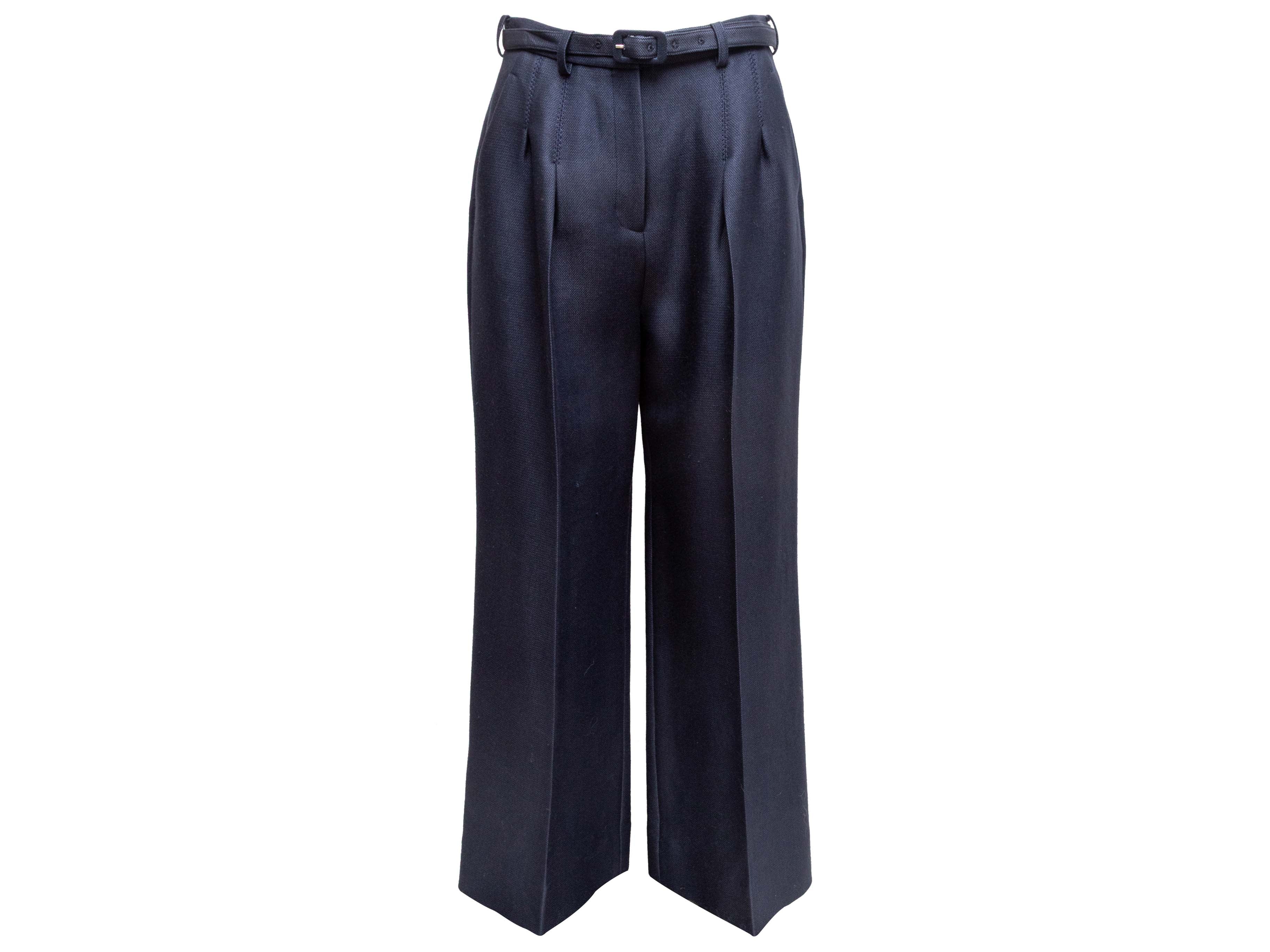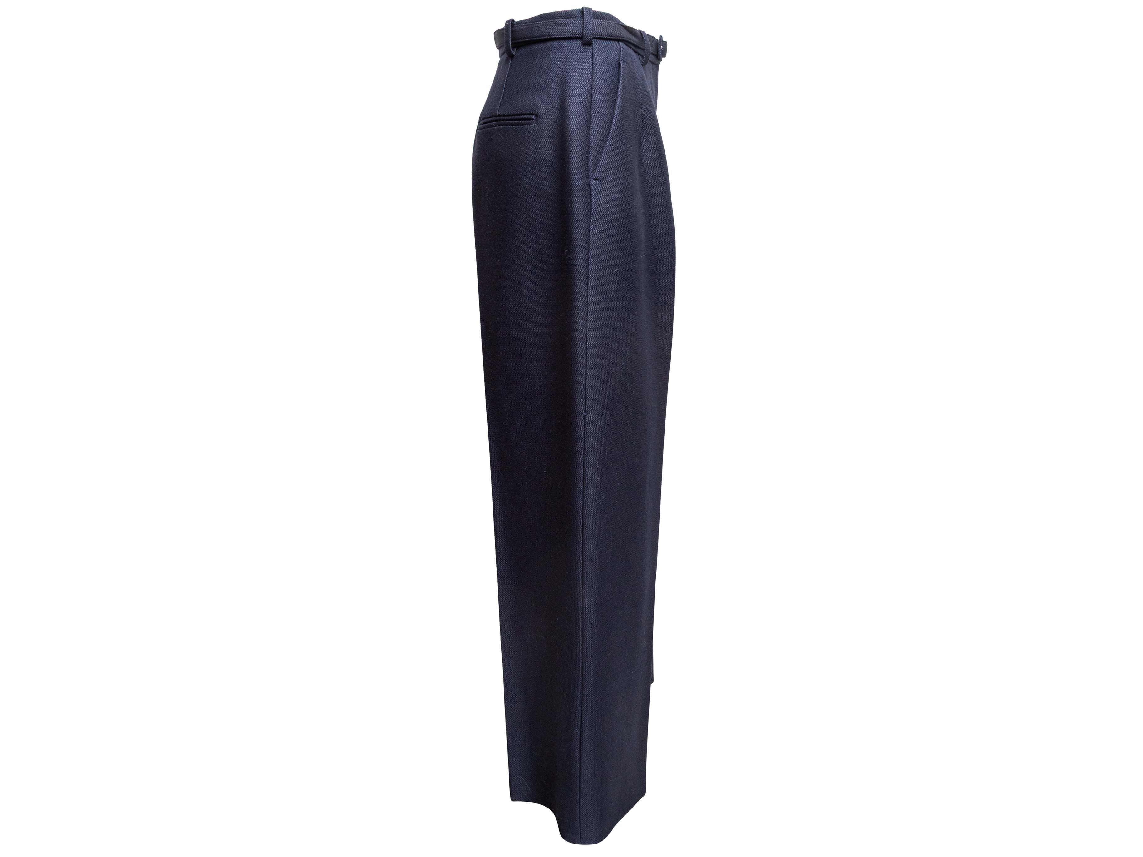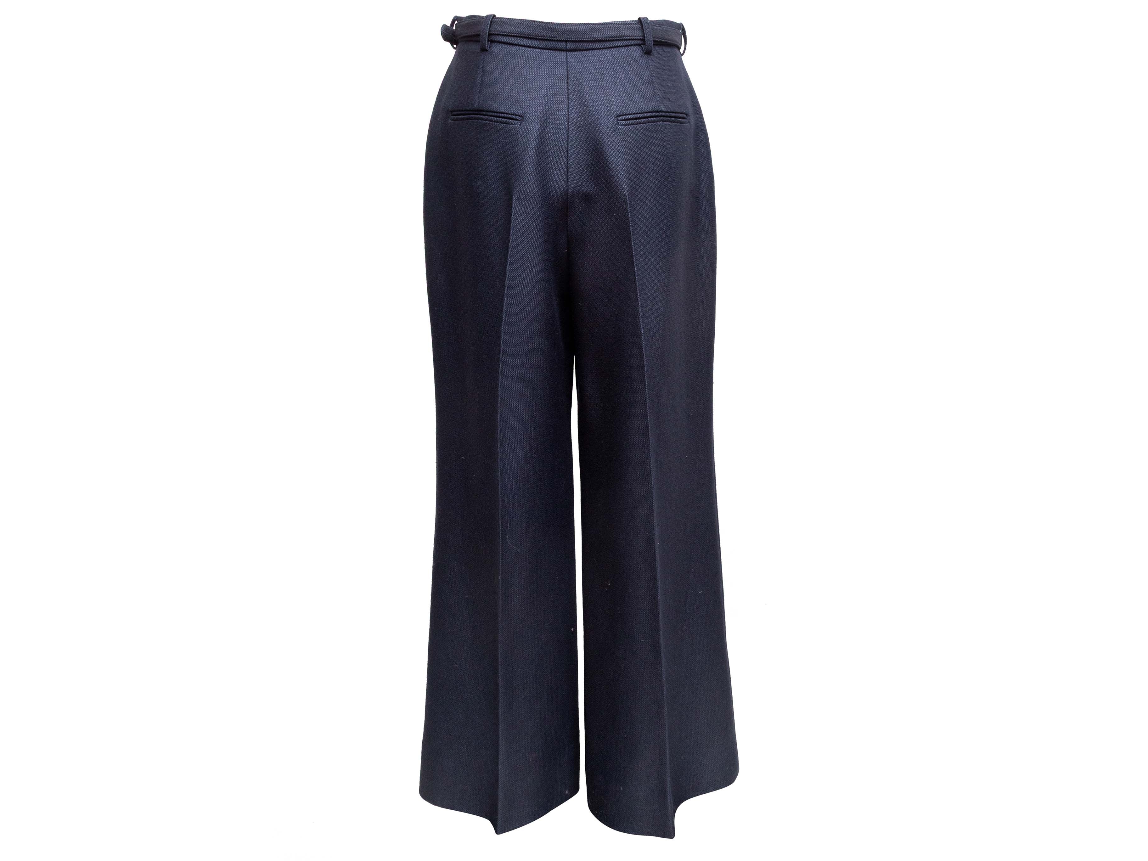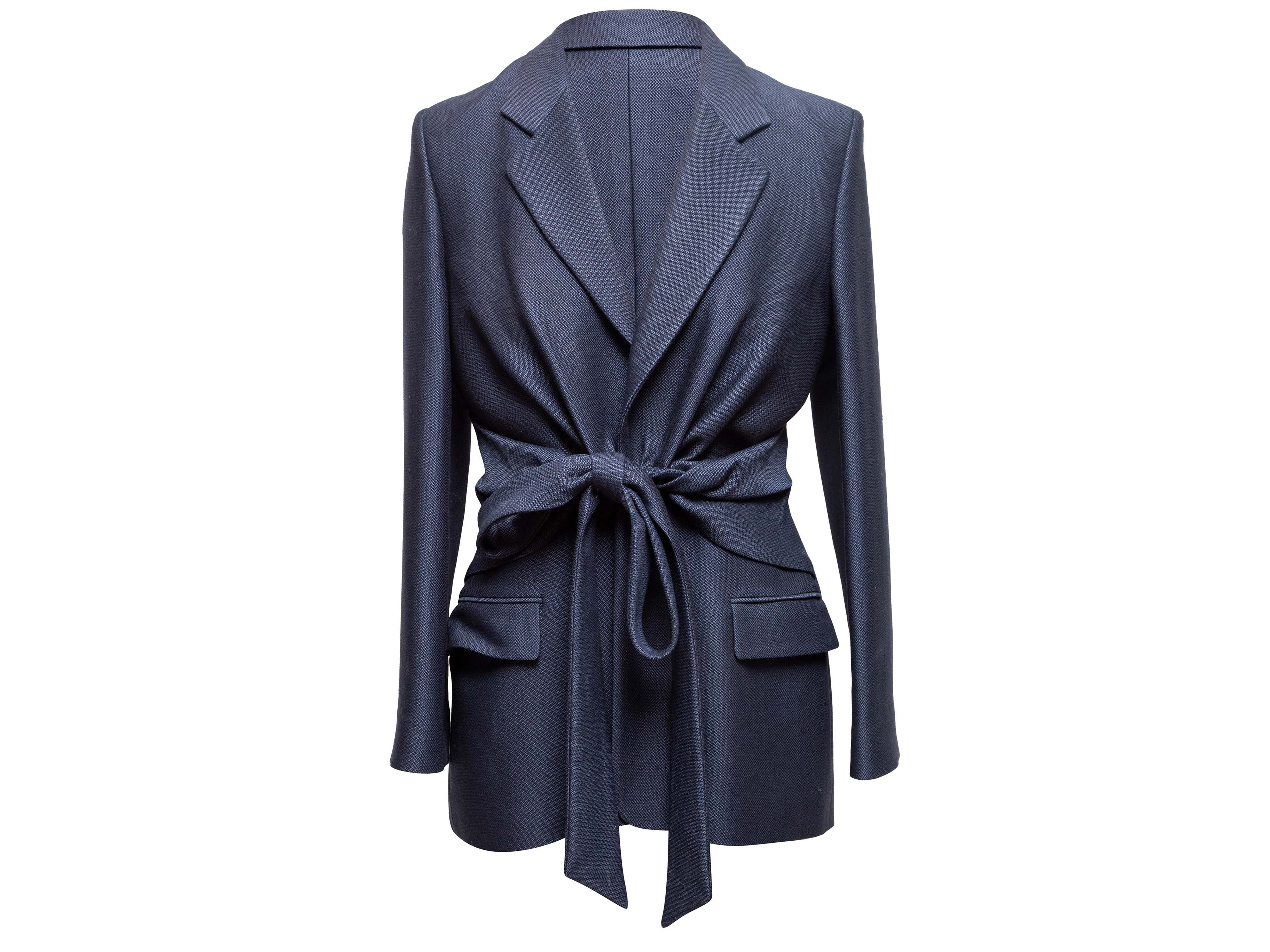Product Details: Navy virgin wool and silk-blend pant suit by Gabriela Hearst. Blazer features notched collar, dual hip pockets, and sash tie closure at waist. Pants feature pleated wide legs, belt at waist, four pockets, and front zip closure. Blazer- 42" bust, 16.5" shoulder width, 24" sleeve length, 28" length; Pants- 30" waist, 36" hips, 29.5" inseam, 14" rise, 42" length.