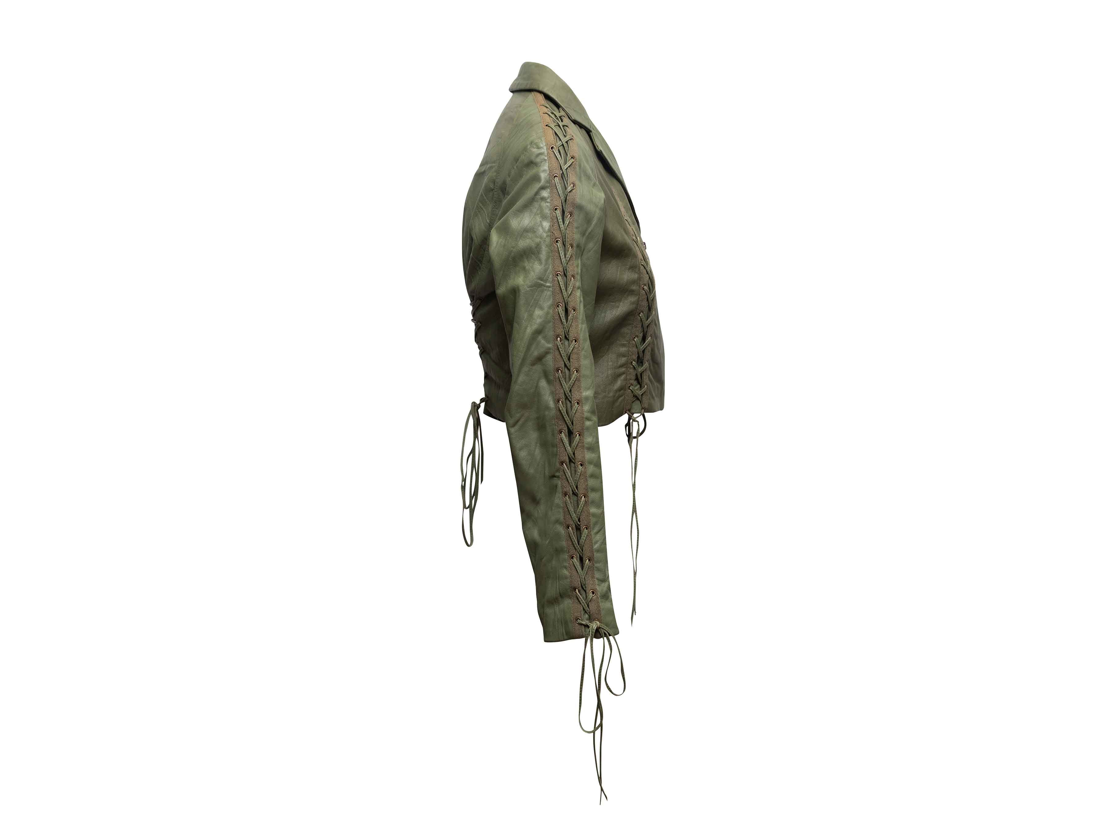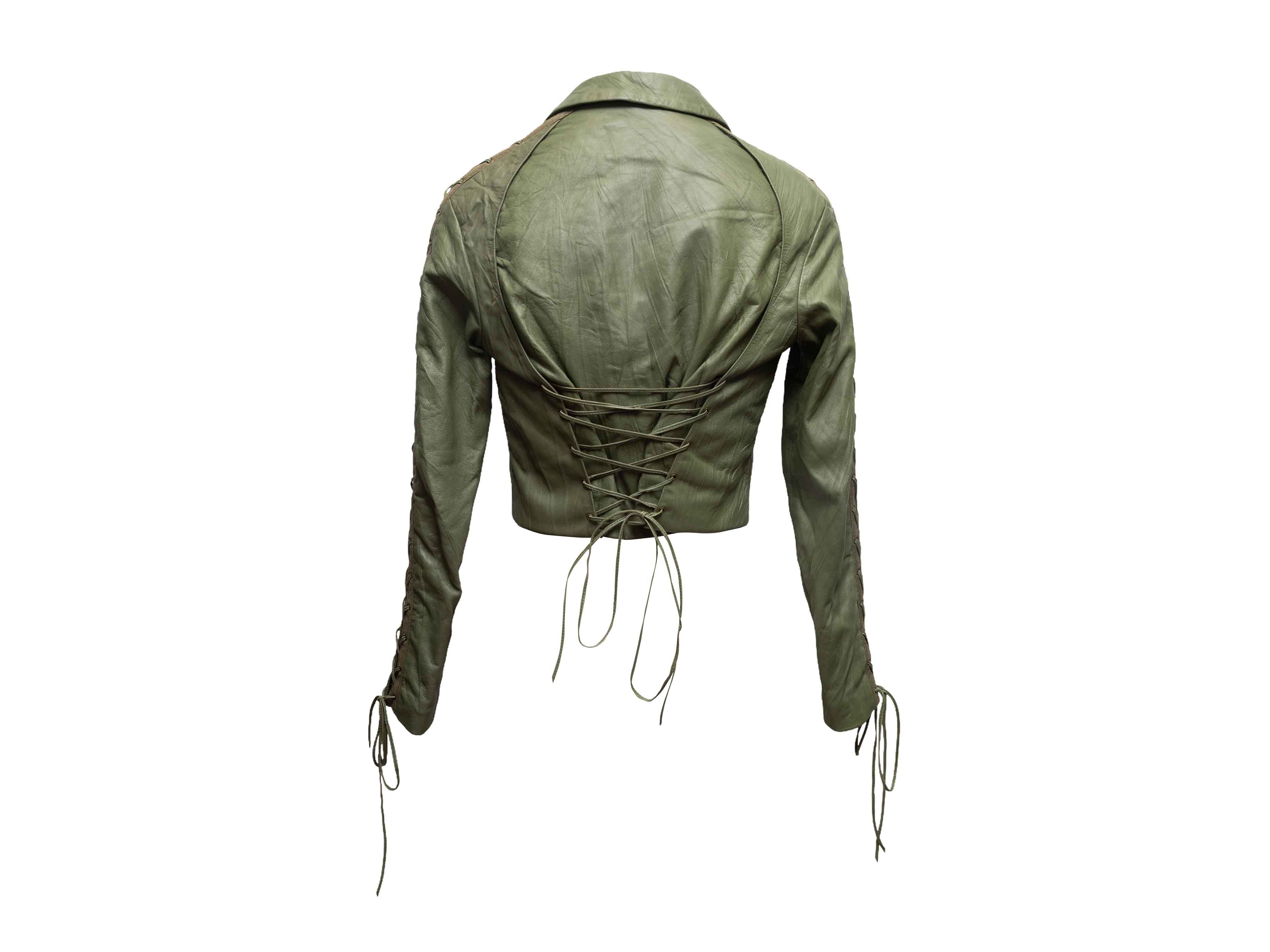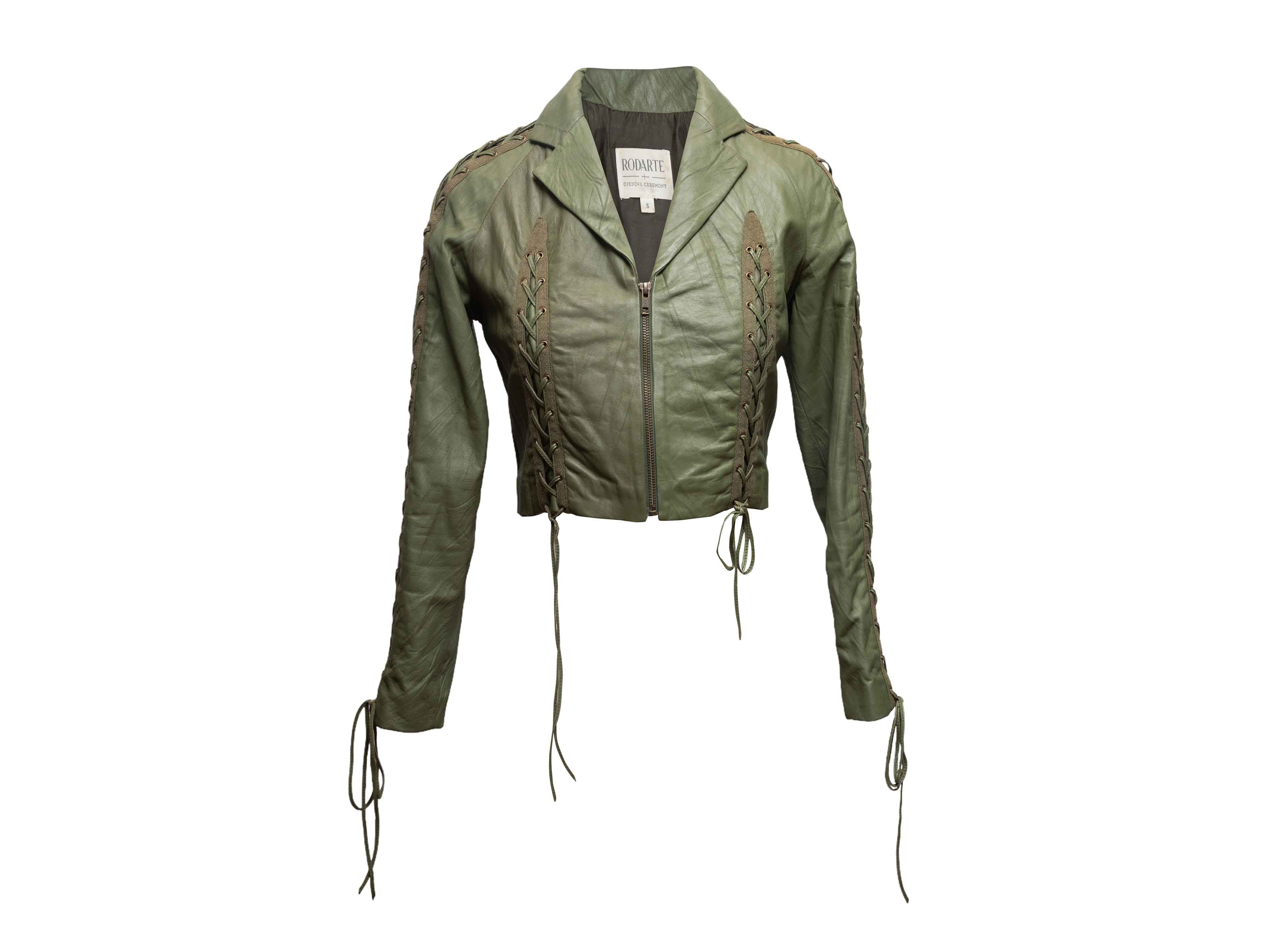 Product Details: Olive leather jacket by Rodarte for Opening Ceremony. Notched collar. V-neck. Lace-up tie detailing at front, sleeves, and back. Zip closure at front. 35" bust, 22" shoulder width, 25" sleeve length, 18" length.