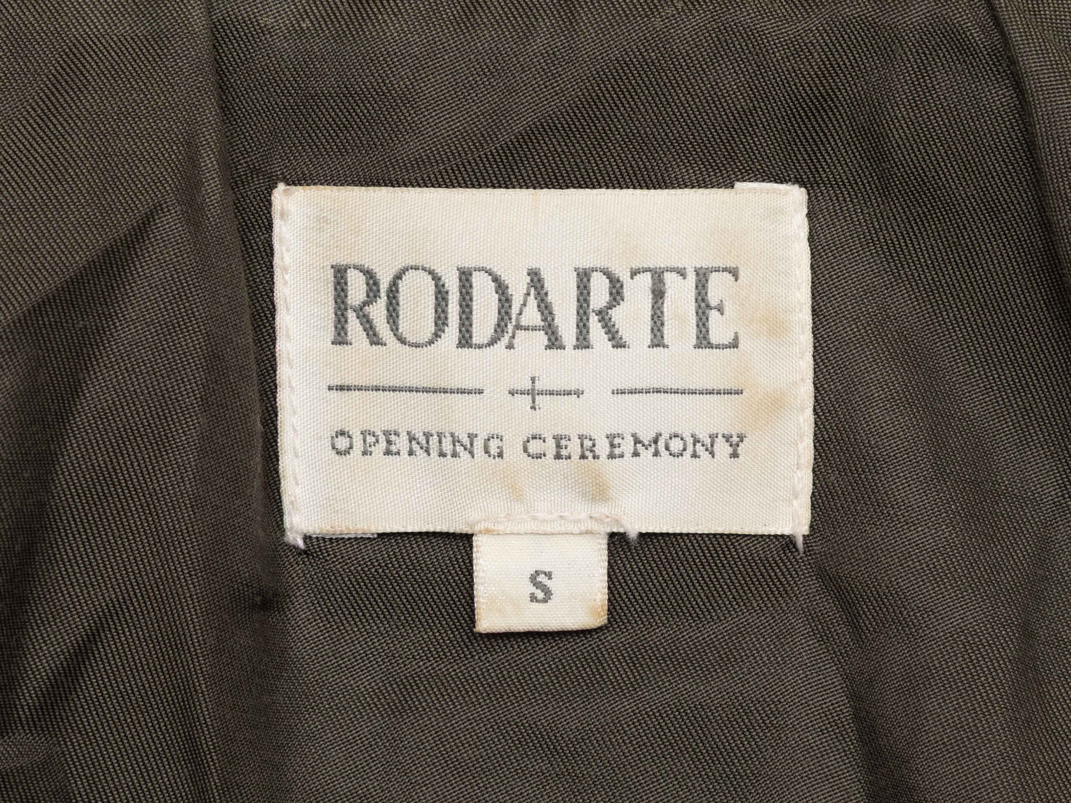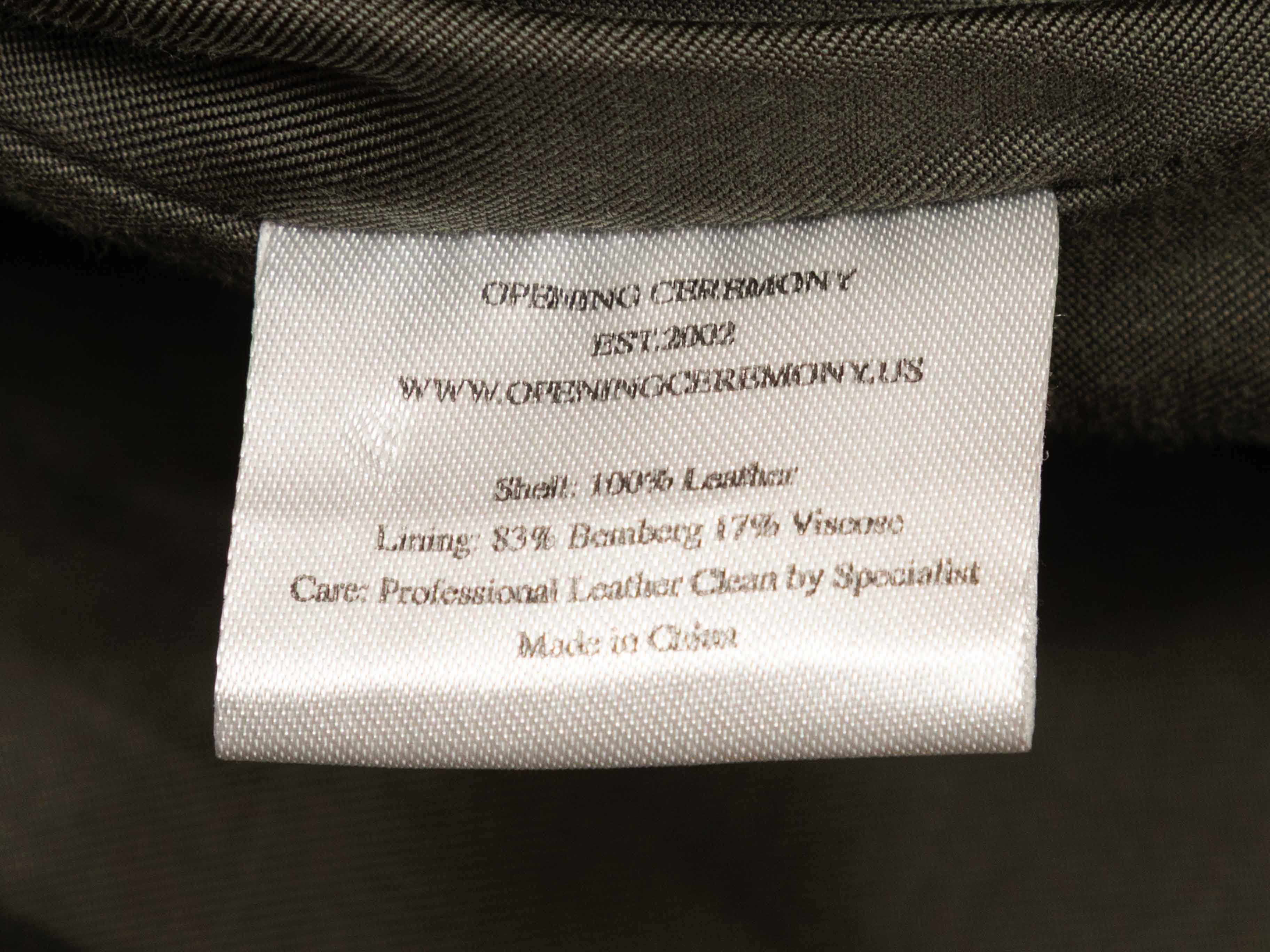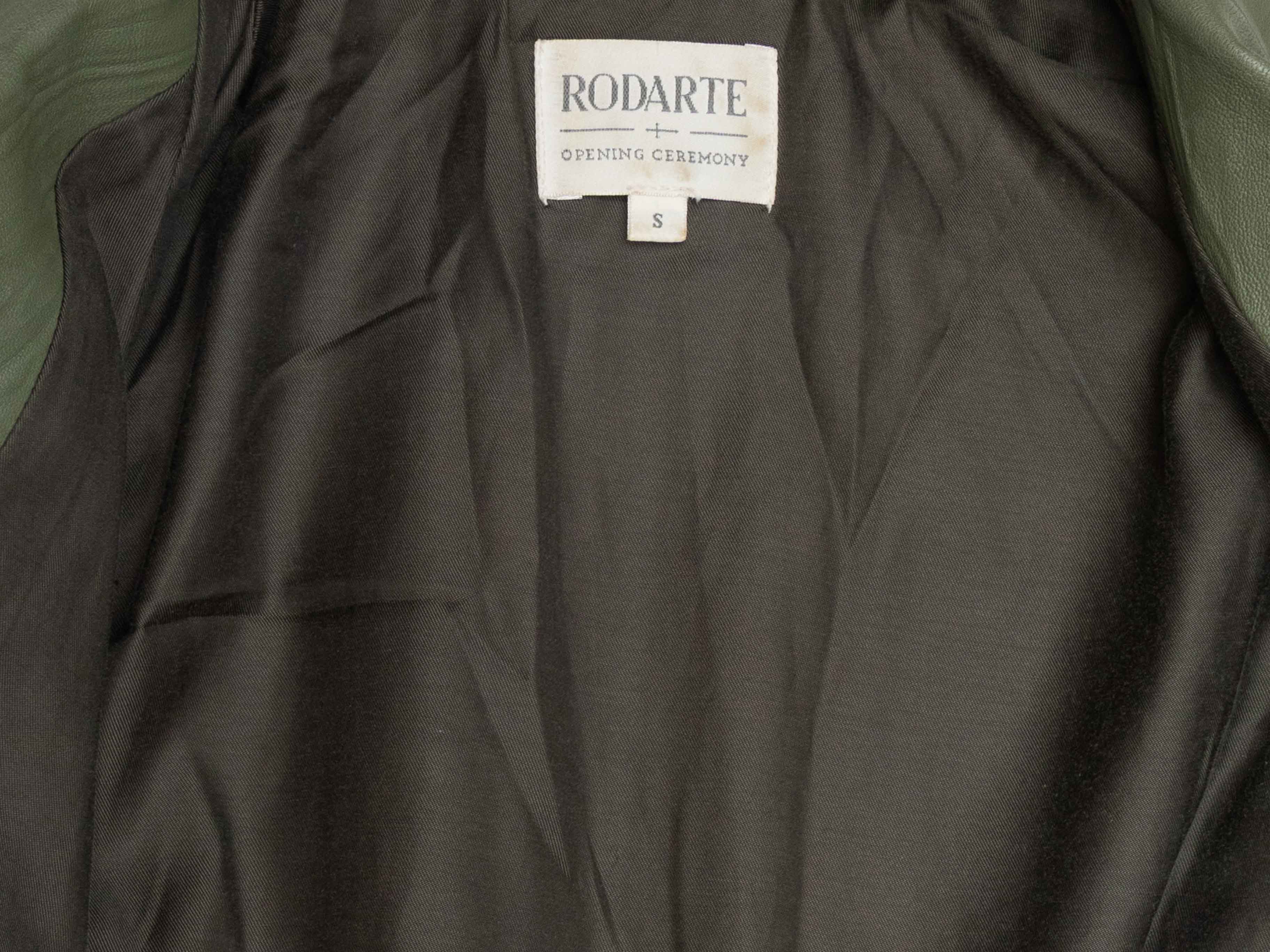 Product Details: Olive leather jacket by Rodarte for Opening Ceremony. Notched collar. V-neck. Lace-up tie detailing at front, sleeves, and back. Zip closure at front. 35" bust, 22" shoulder width, 25" sleeve length, 18" length.