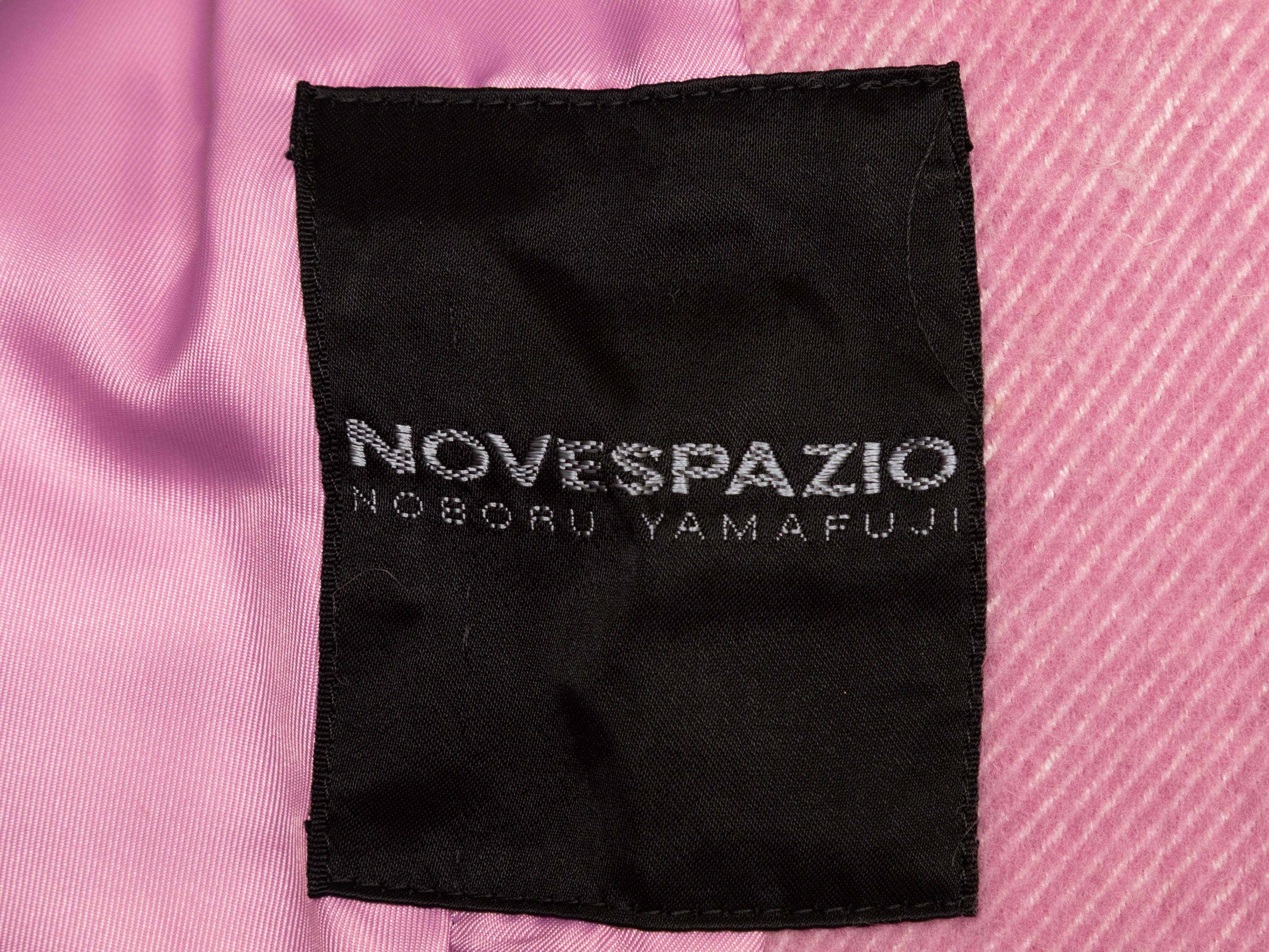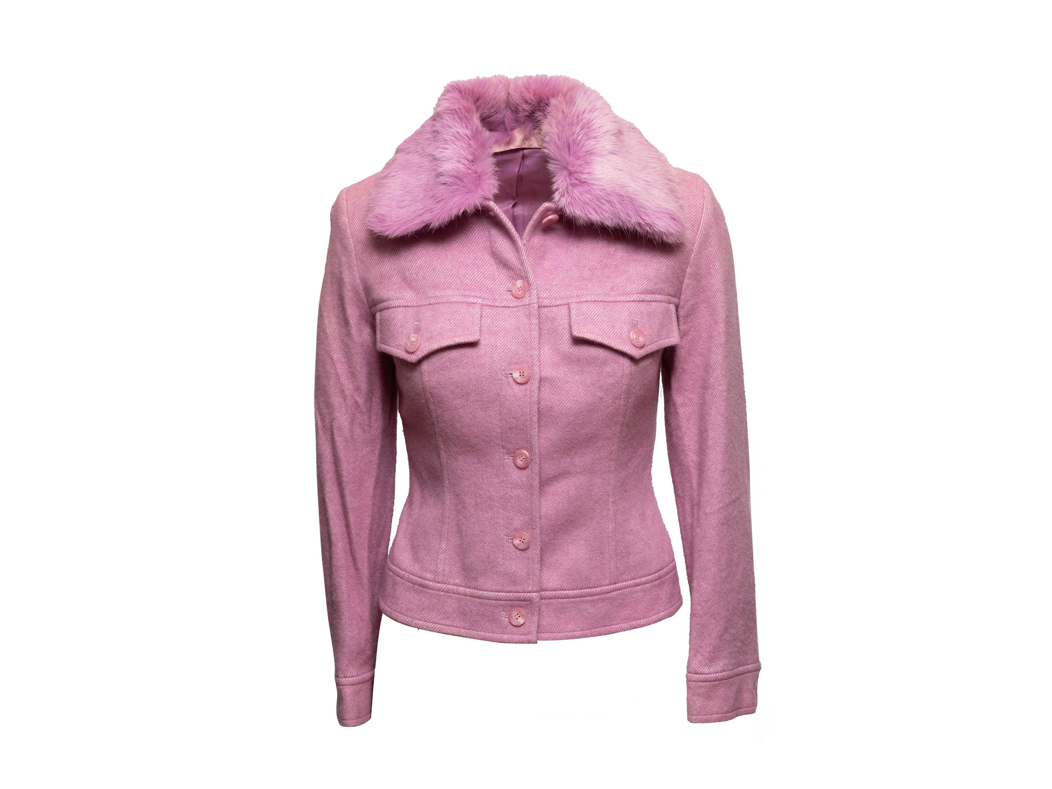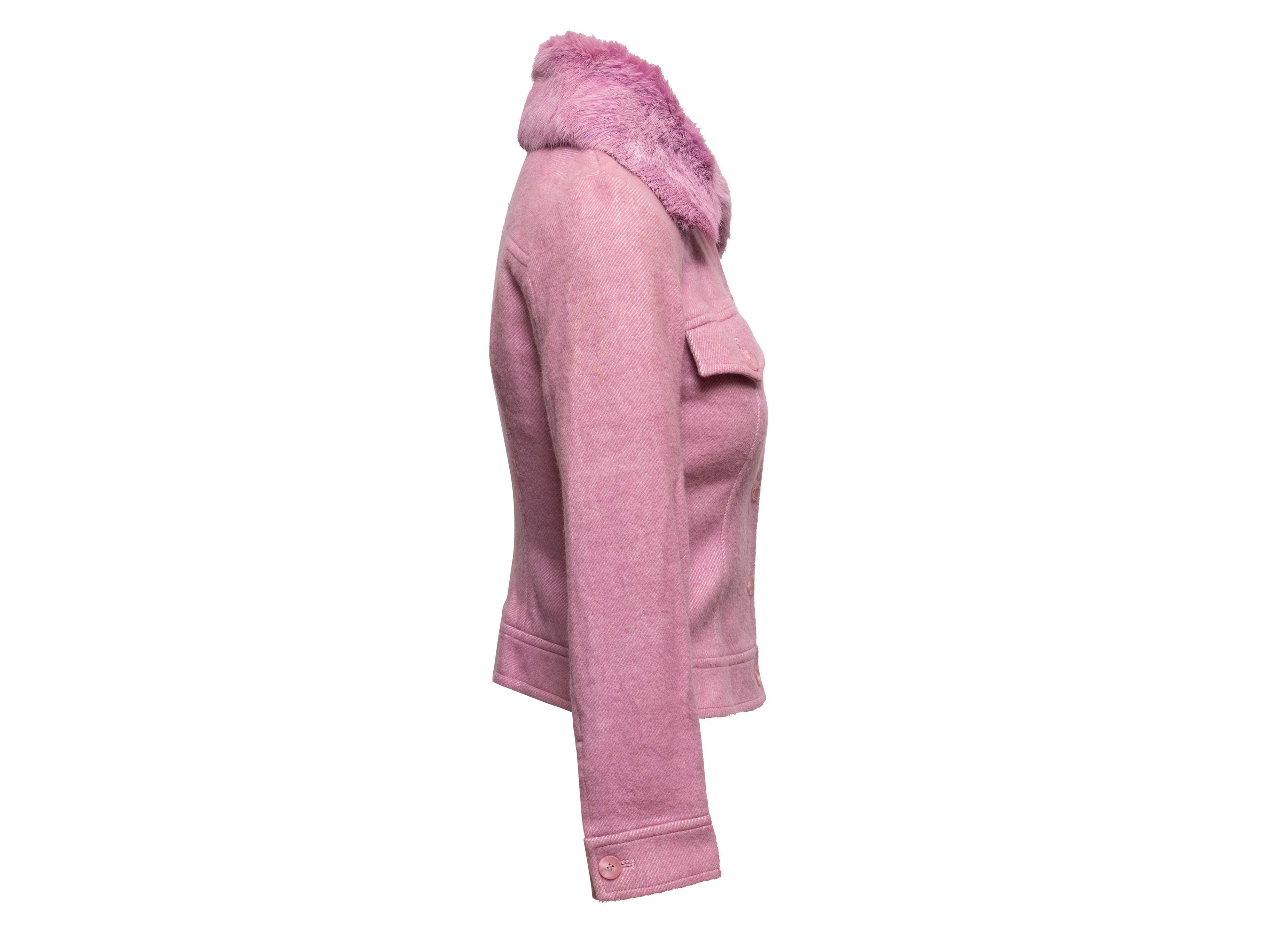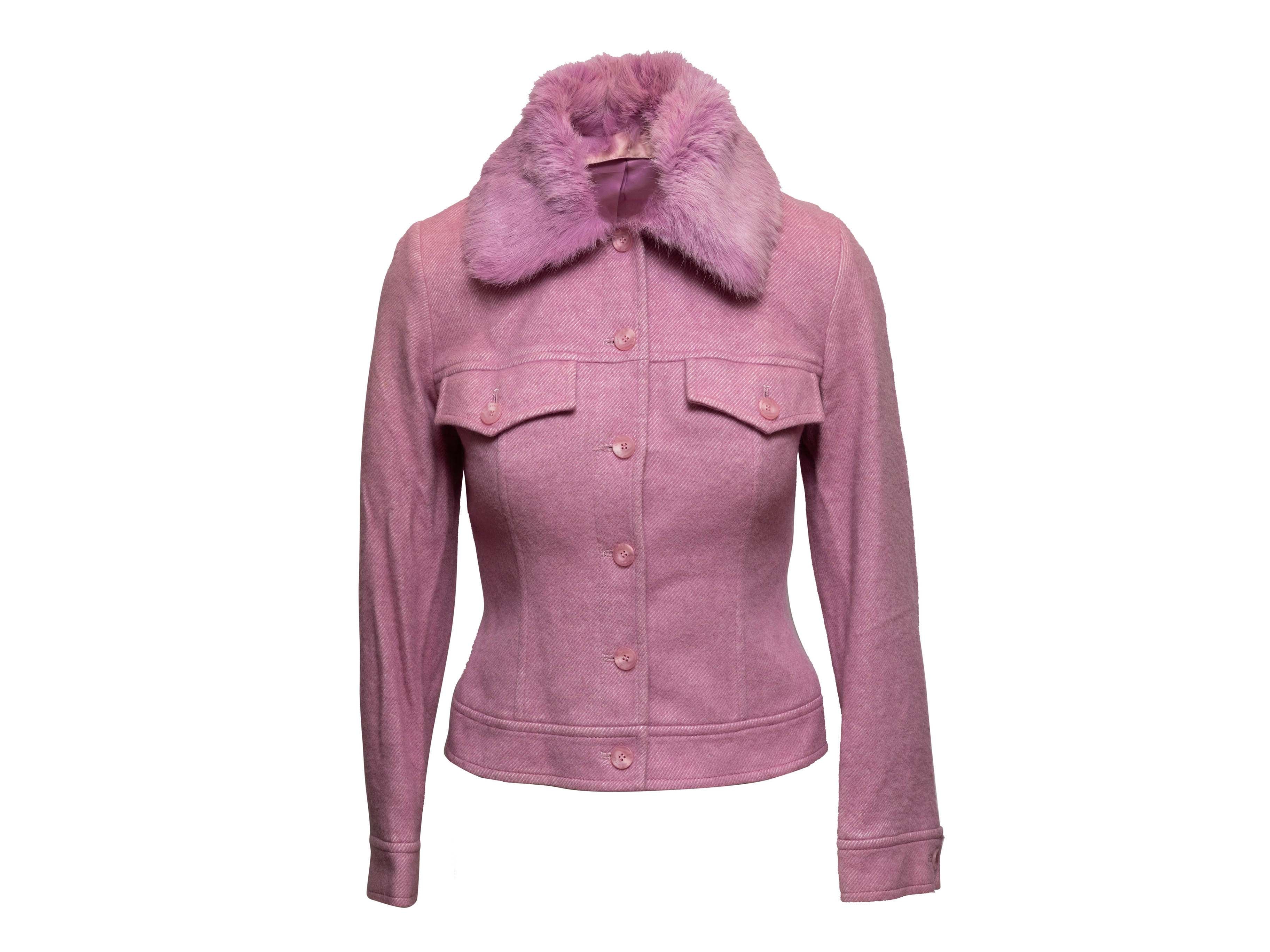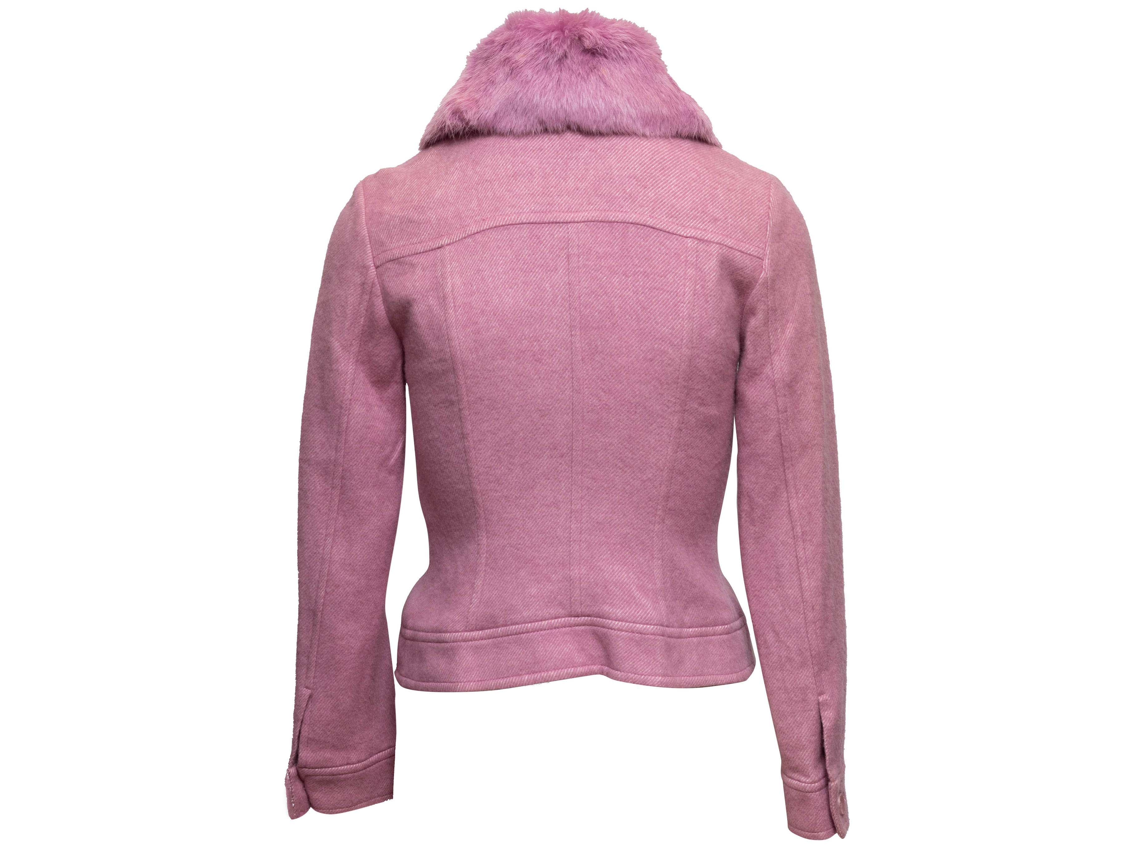 Product Details: Pink herringbone wool jacket with rabbit fur collar by Novespazio. Dual bust pockets. Front button closures. 29" bust, 14.5" shoulder width, 22.5" sleeve length, 22.5" length.