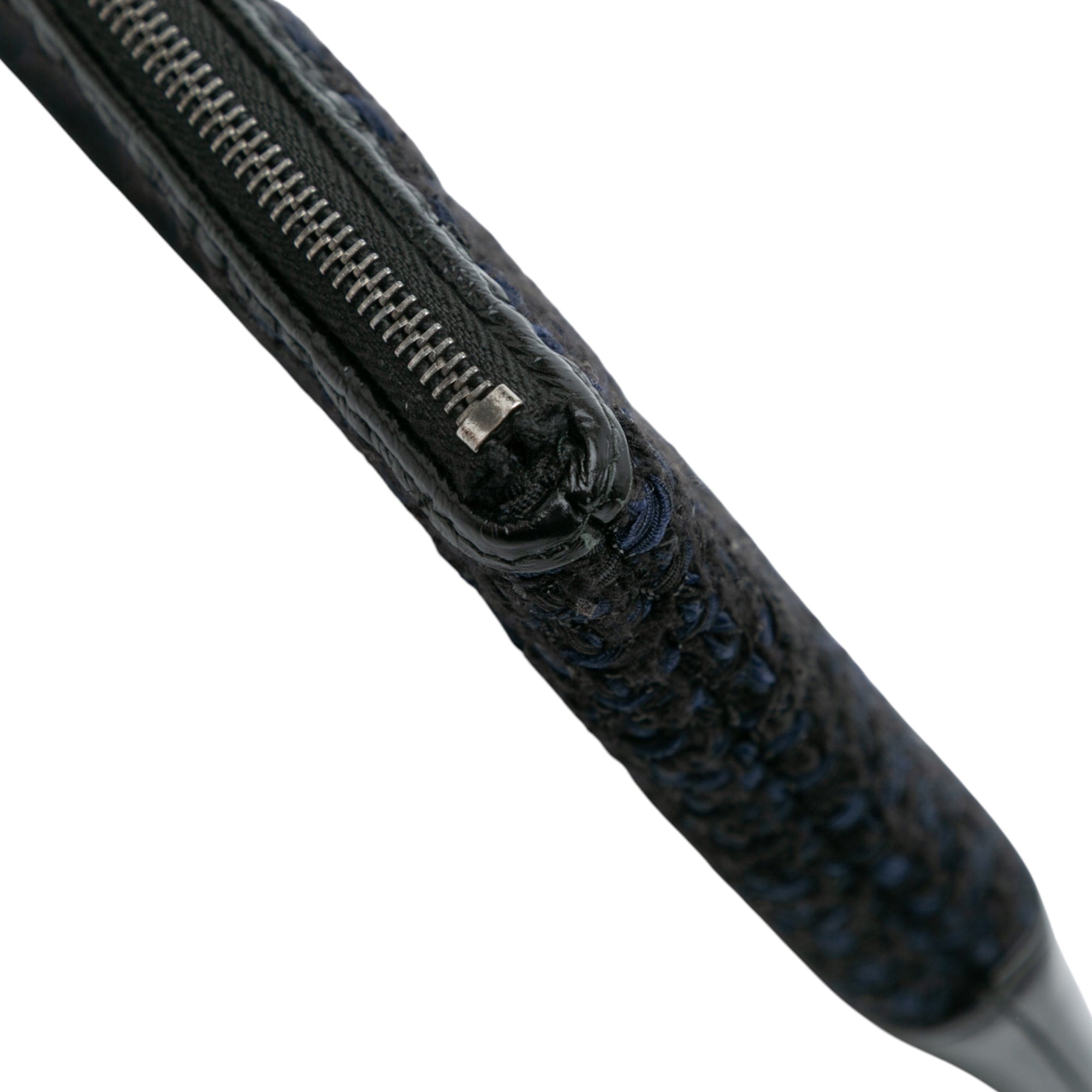 Product Details: Blue Chanel Medium Tweed and Calfskin Gabrielle O Case Clutch. This clutch bag features a quilted tweed and leather body, a top zip closure, and an interior zip pocket. 7.9" L x 11.4" W x 0.4" D. Serial number 25565836.
