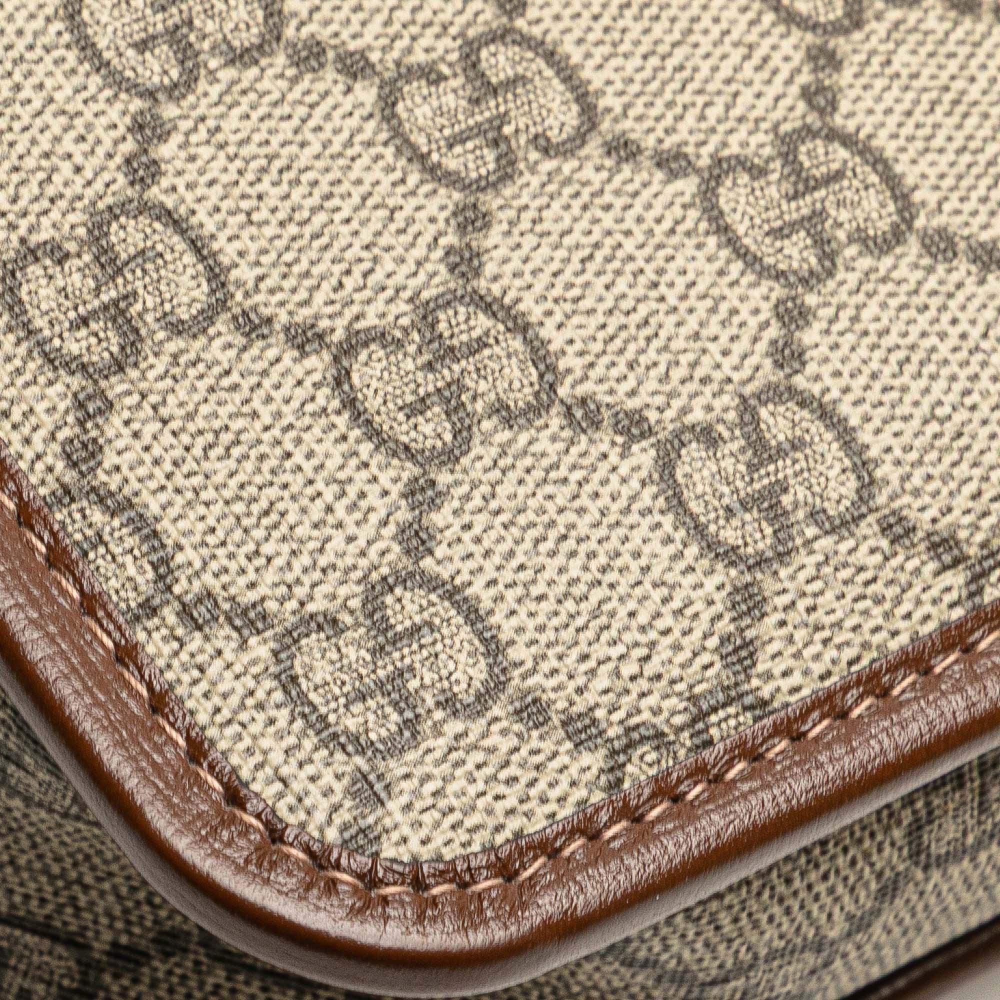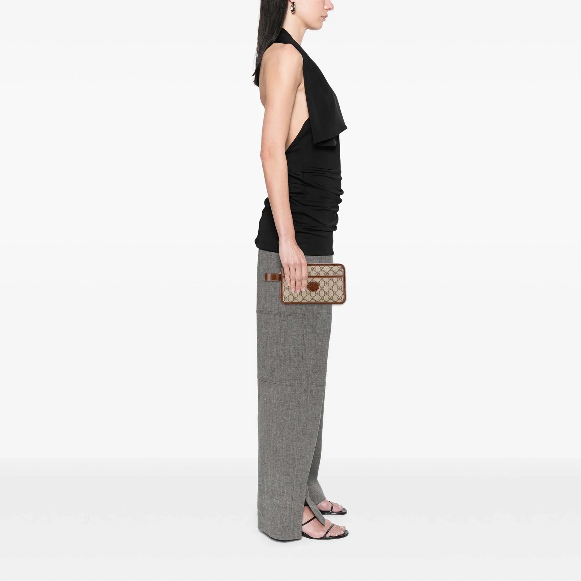 Product Details: Tan Gucci GG Supreme Interlocking G Clutch. This clutch bag features a coated canvas body with leather trim, a flat leather wrist strap, a top zip closure, and an exterior front slip pocket. 5.5" L x 8.7" W x 2.2" D, 2" drop. Serial number 625764 2067.