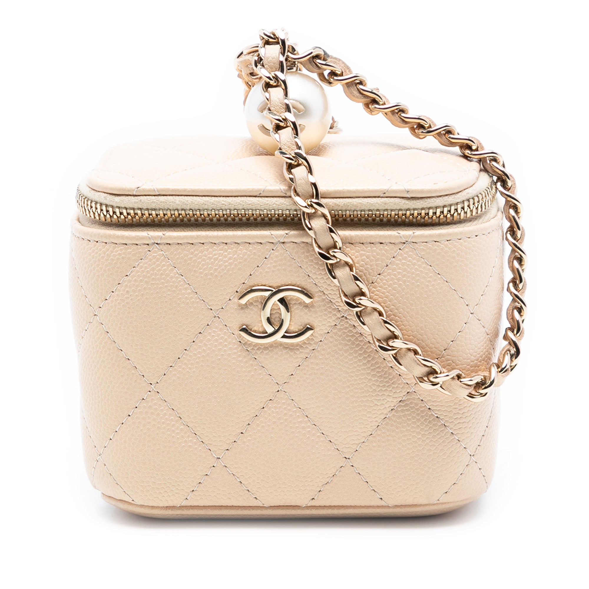 Product Details: Beige Chanel Mini Quilted Iridescent Caviar Pearl On Top Vanity Case With Chain Clutch Bag. This vanity bag features a quilted caviar leather body, a leather-woven chain strap, and a top zip-around closure. 3.5" L x 3.9" W x 2.8" D, 9.3" drop. Serial number 31316205.