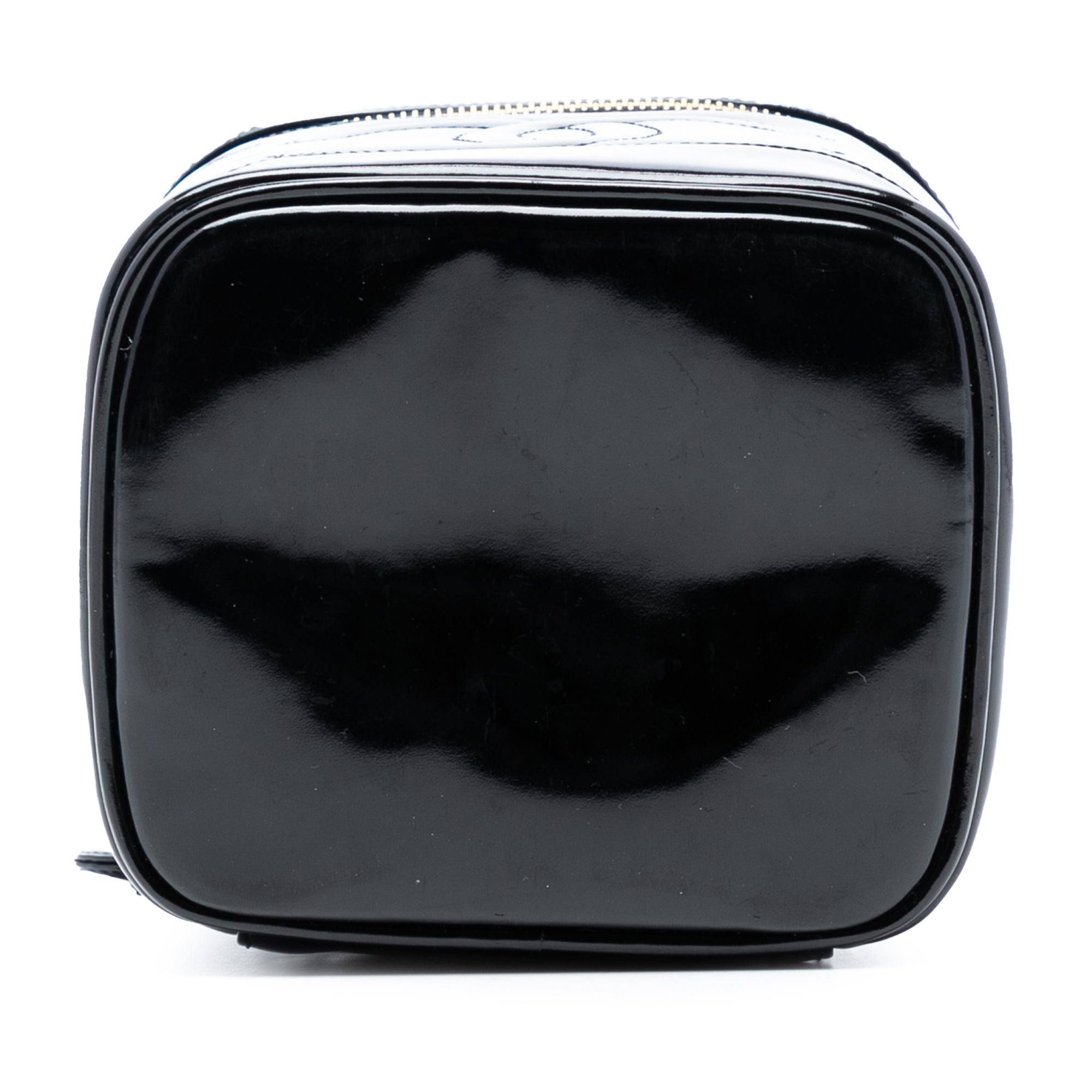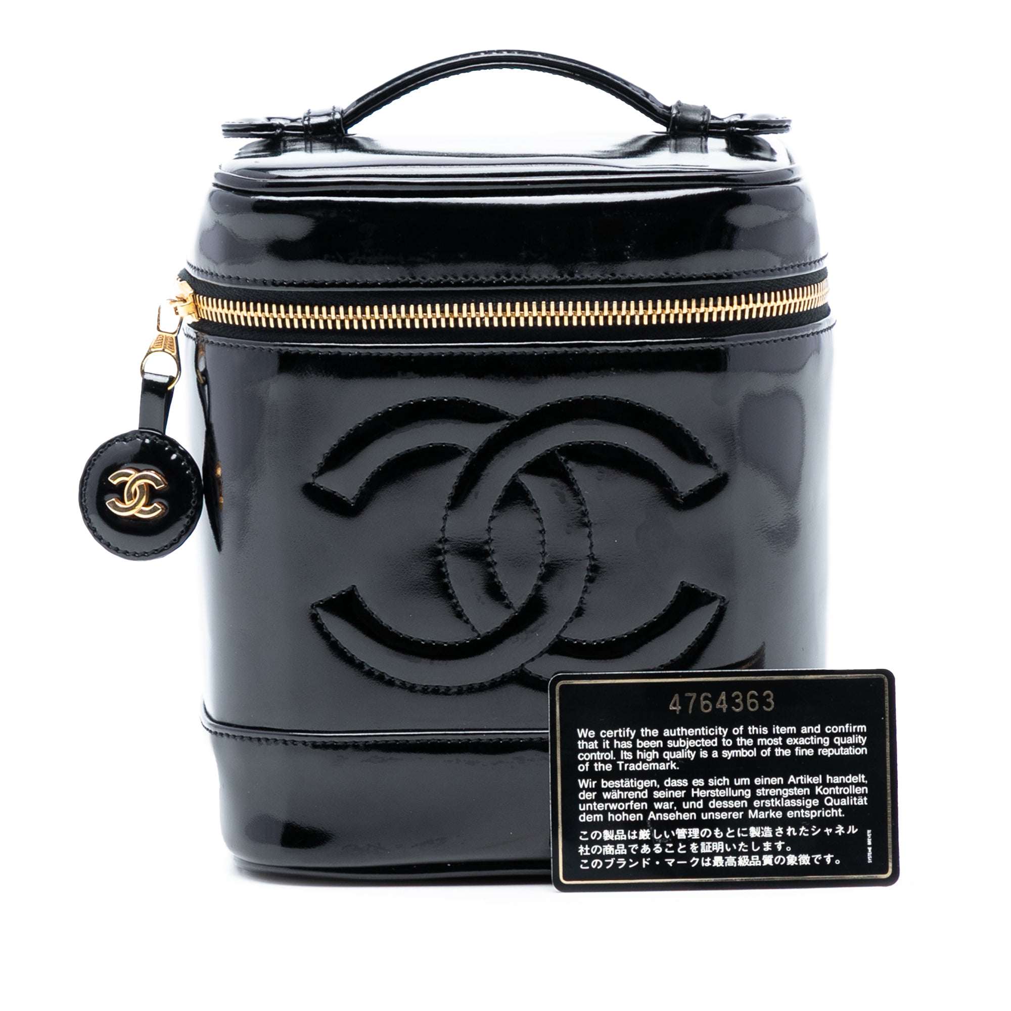 Product Details: Black Chanel CC Patent Vanity Bag. This vanity bag features a patent leather body, a top handle, a top zip closure and an interior slip pocket. 6.9" L x 5.9" W x 5.1" D, 1" drop. Serial number 4764363.