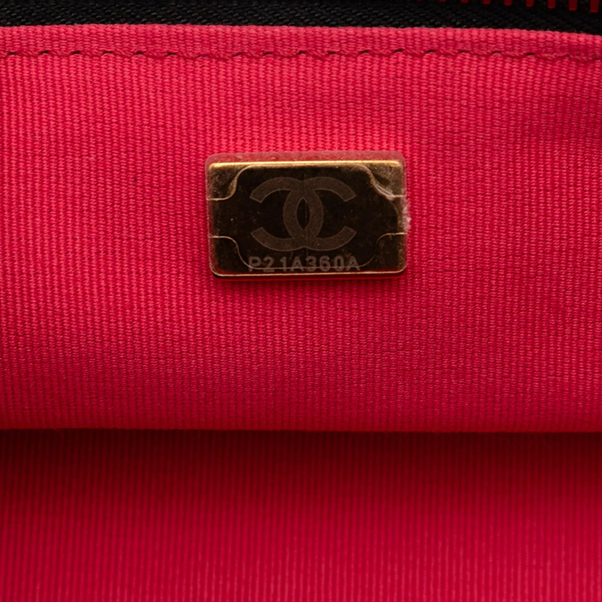 Product Details: Black Chanel CC Quilted Calfskin Chain Top Handle Vanity Case on Strap Satchel. This crossbody bag features a quilted leather body, a leather-woven chain handle, a leather woven chain strap with leather guard, a top zip around and magnetic closure, interior slip pockets, and a mirror inclusion. 4.9" L x 5.5" W x 5.5" D. Serial number P21A360A.