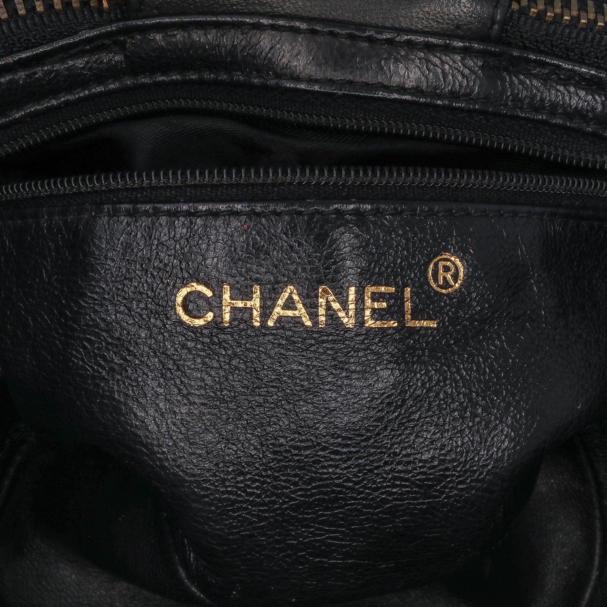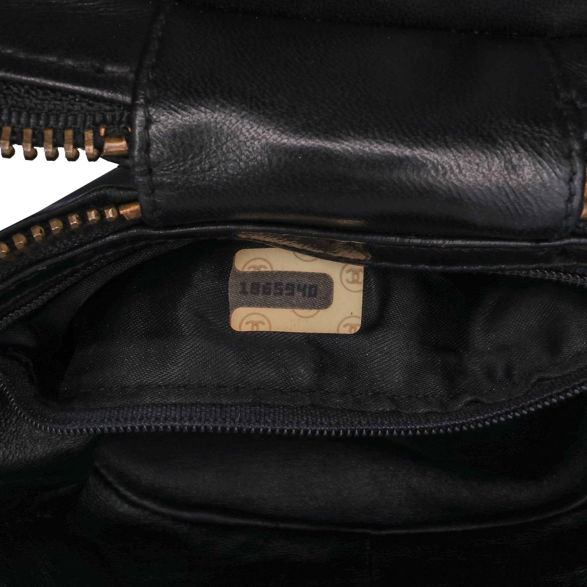 Product Details: Black Chanel Quilted Lambskin Tassel Vanity Case. This vanity bag features a quilted lambskin leather body, a leather woven chain strap, and a zip-around closure with tassel detail. 5.1" L x 6.3" W x 3.9" D. Serial number 1865940.