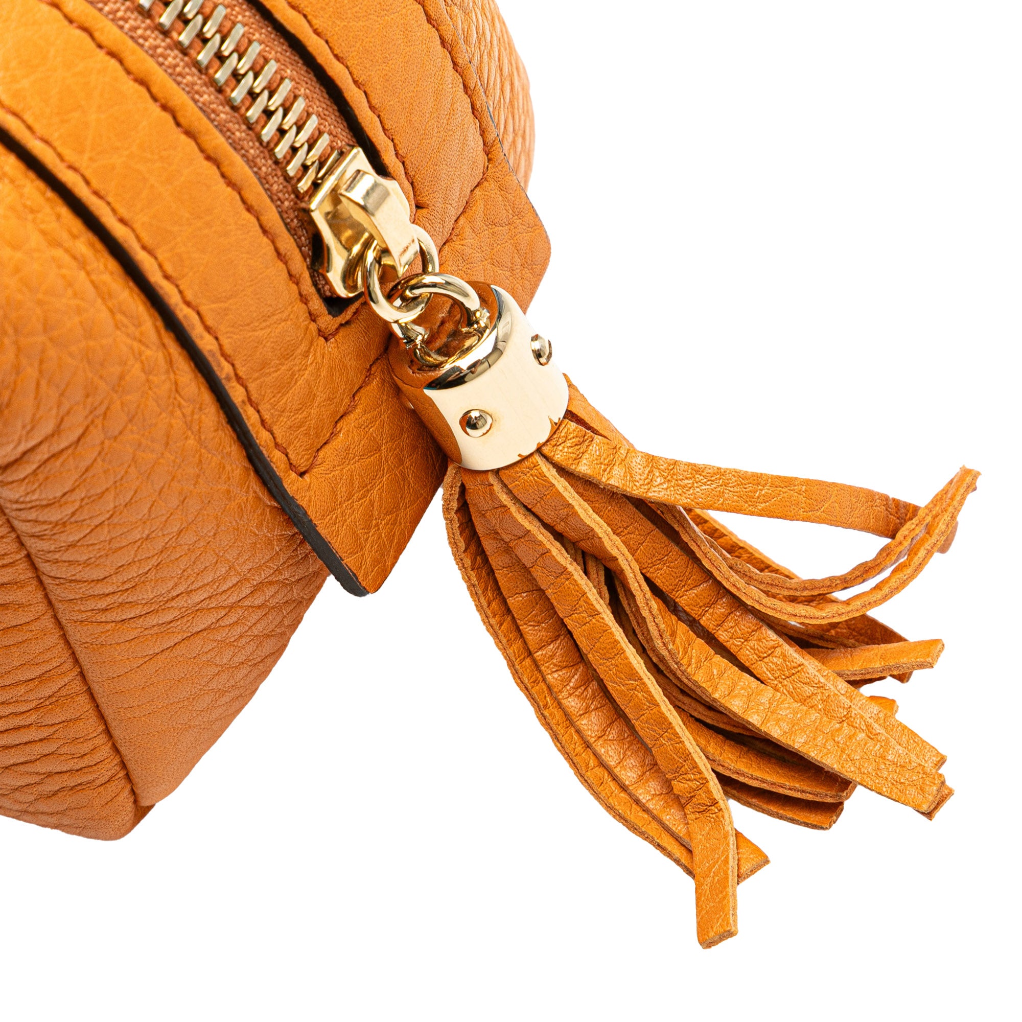 Product Details: Orange Gucci Leather Soho Cosmetic Pouch. The Soho pouch features a leather body, a top zip closure with a tassel leather pull, and an interior slip pocket. 3.5" L x 6.7" W x 3.3" D. Serial number 308636 498879.