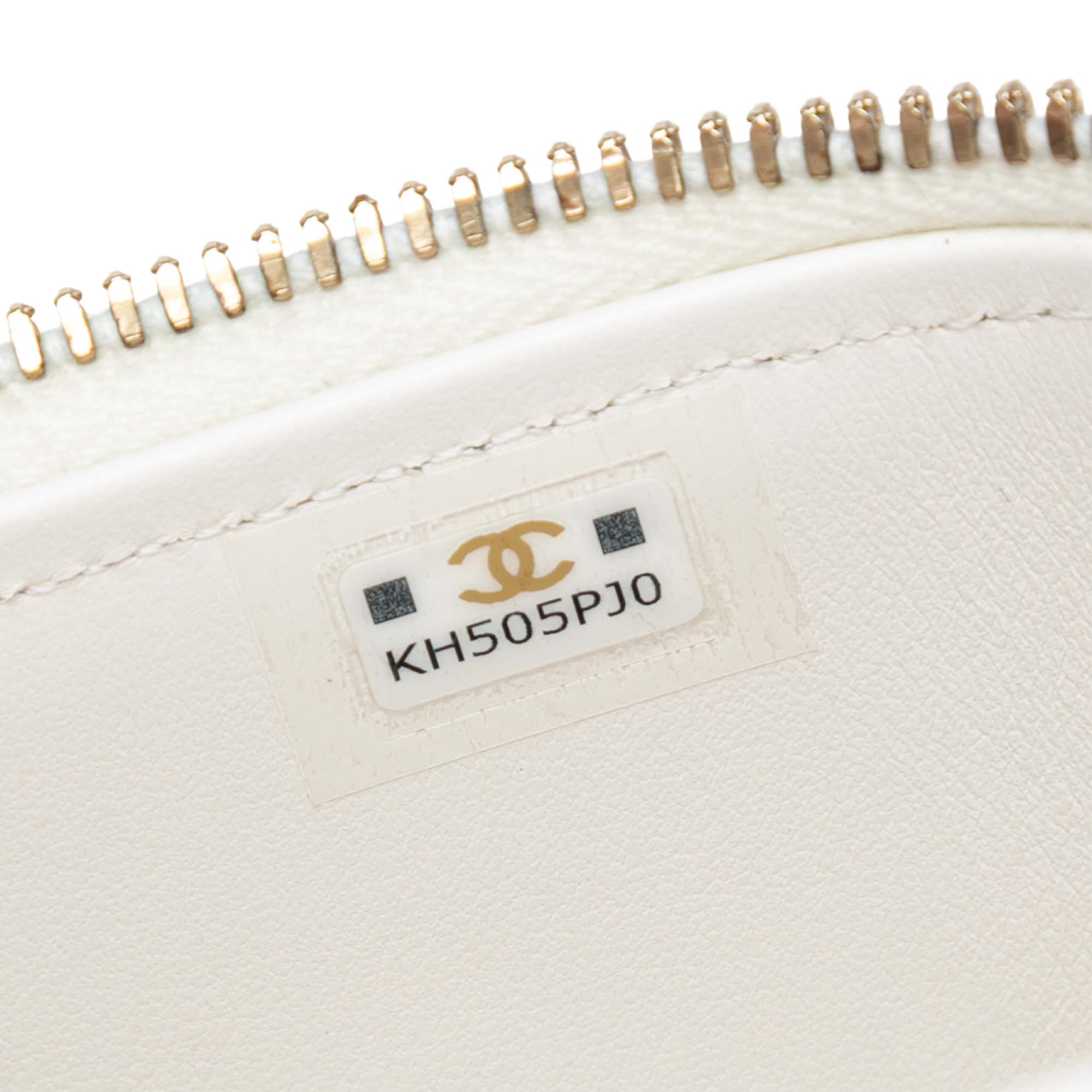 Product Details: White Chanel Mini Caviar Coco Casino Vanity Case. This vanity bag features a quilted caviar leather body, a leather woven chain strap, and a top zip-around closure. 3.5" L x 3.9" W x 2.8" D. Serial number KH505PJ0.