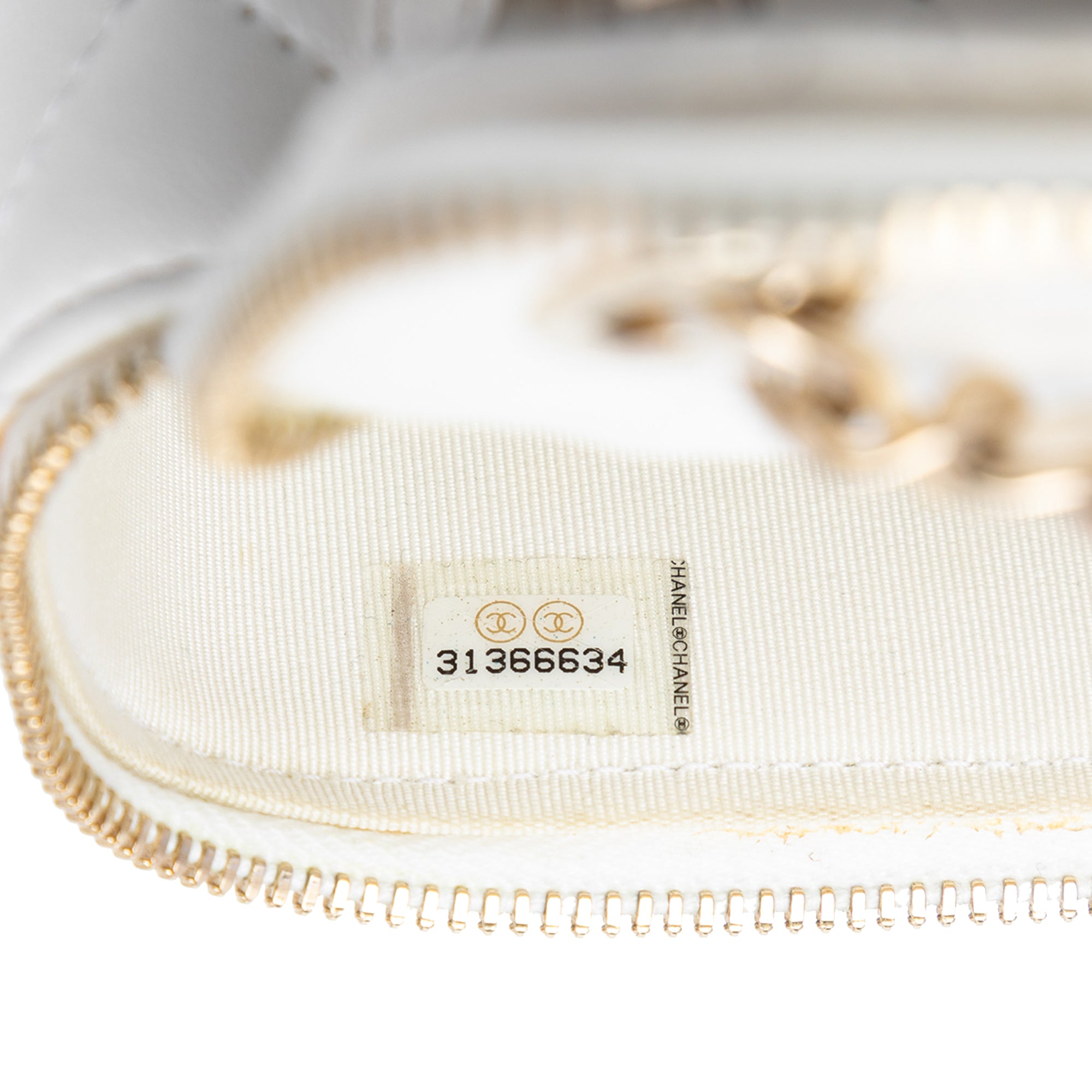 Product Details: White Chanel Mini Quilted Lambskin Camellia Bow Vanity Case with Chain Crossbody Bag. This crossbody bag features a quilted lambskin leather body, a leather woven chain strap, two-way zip around closure, and an interior open pocket. 3.3" L x 3.9" W x 2.8" D. Serial number 31366634.