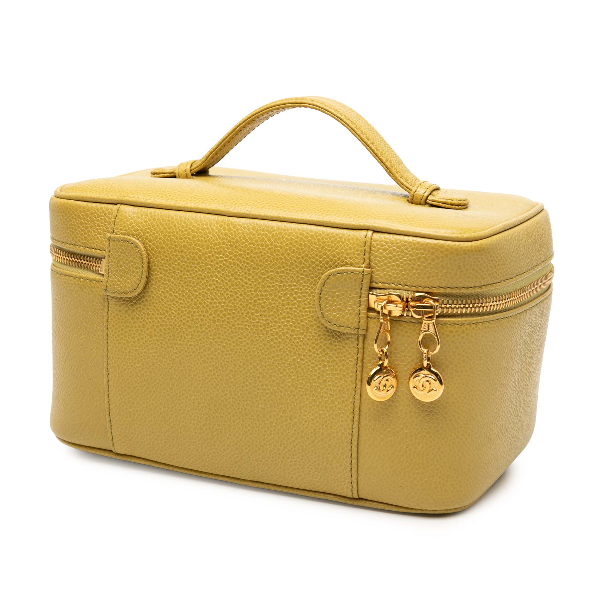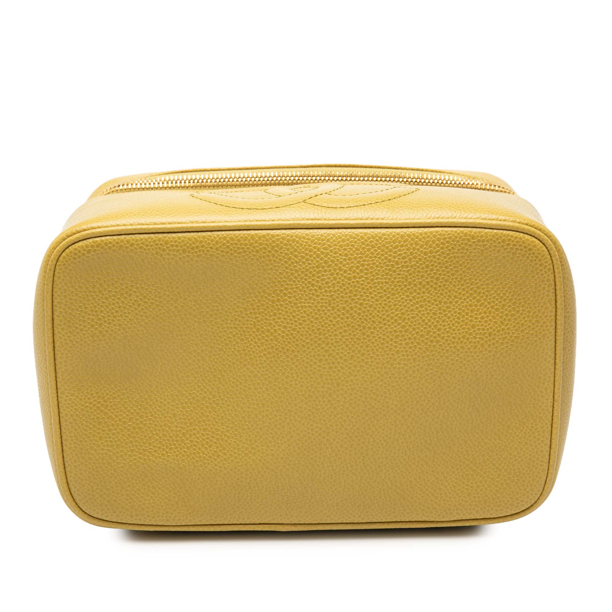 Product Details: Yellow Chanel CC Caviar Vanity Bag. This vanity bag features a caviar leather body, a flat top handle, a zip-around closure and an interior slip pocket. 4.7" L x 8.7" W x 5.1" D, 1.6" drop. Serial number 5321253.