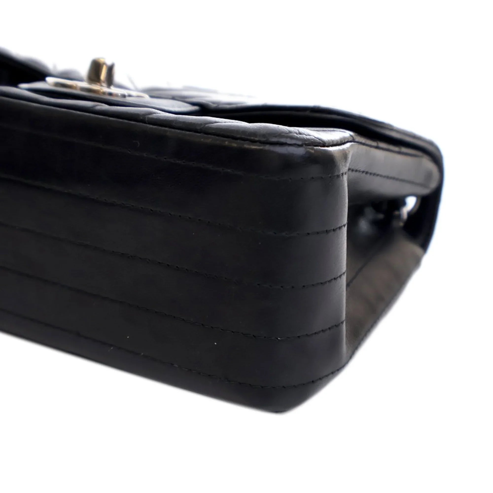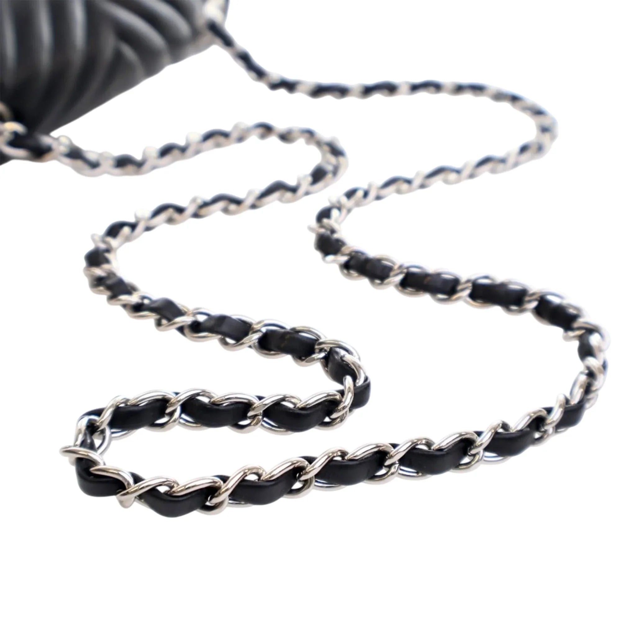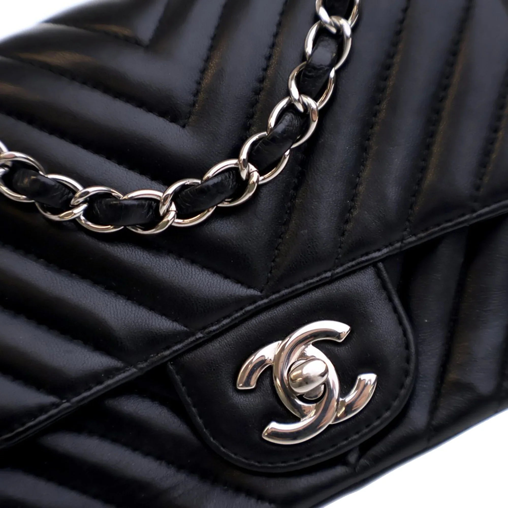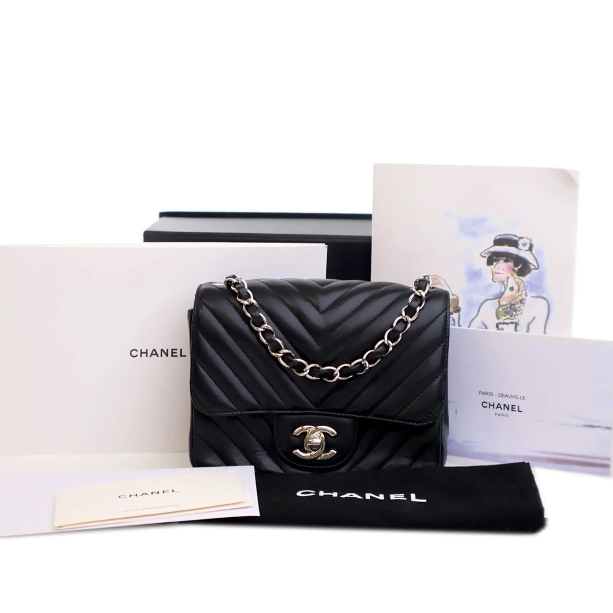 Product Details: Black Chanel Mini Square Classic Chevron Lambskin Single Flap Crossbody Bag. The Mini Chevron Classic Flap features a quilted leather body, a leather woven chain strap, a front flap with CC turn-lock closure, an exterior back slip pocket, and interior zip and slip pockets. 4.9" L x 6.5" W x 3" D.