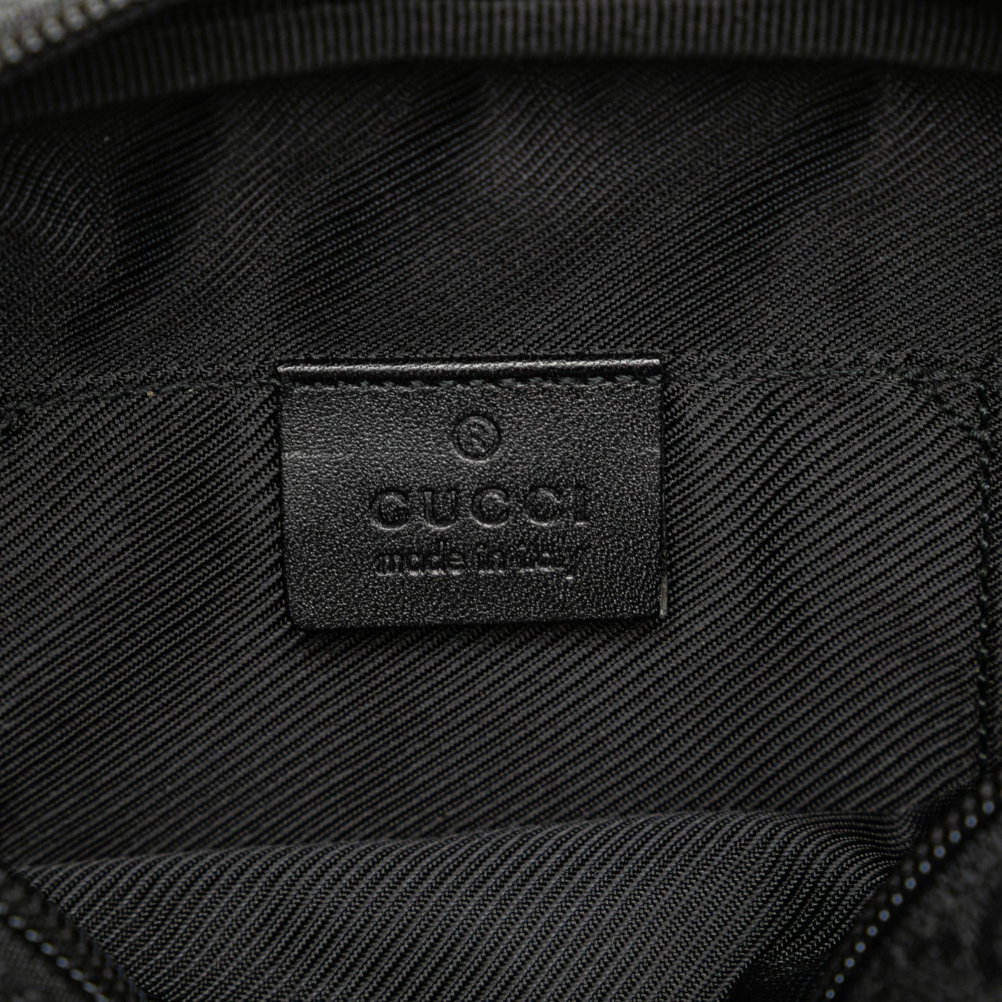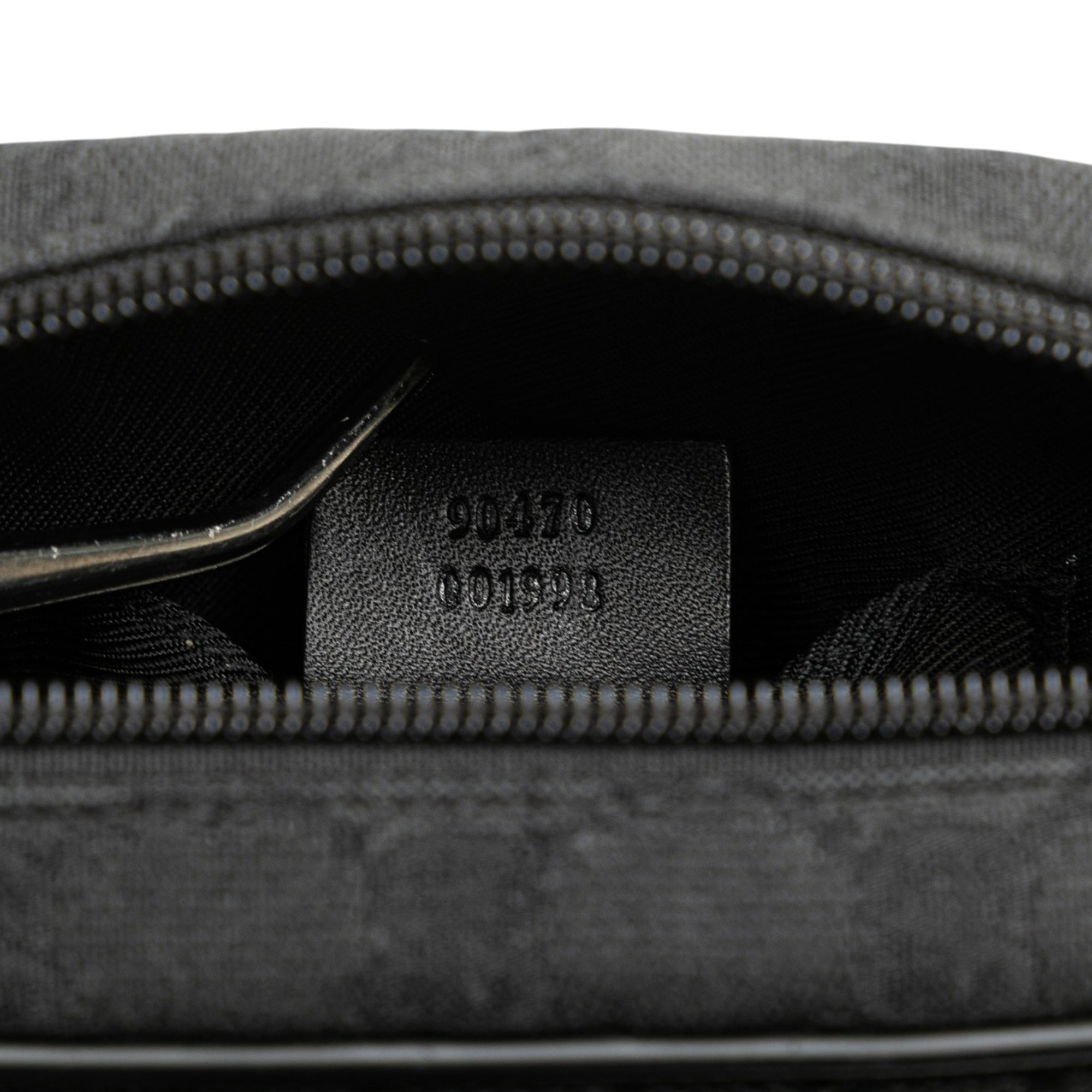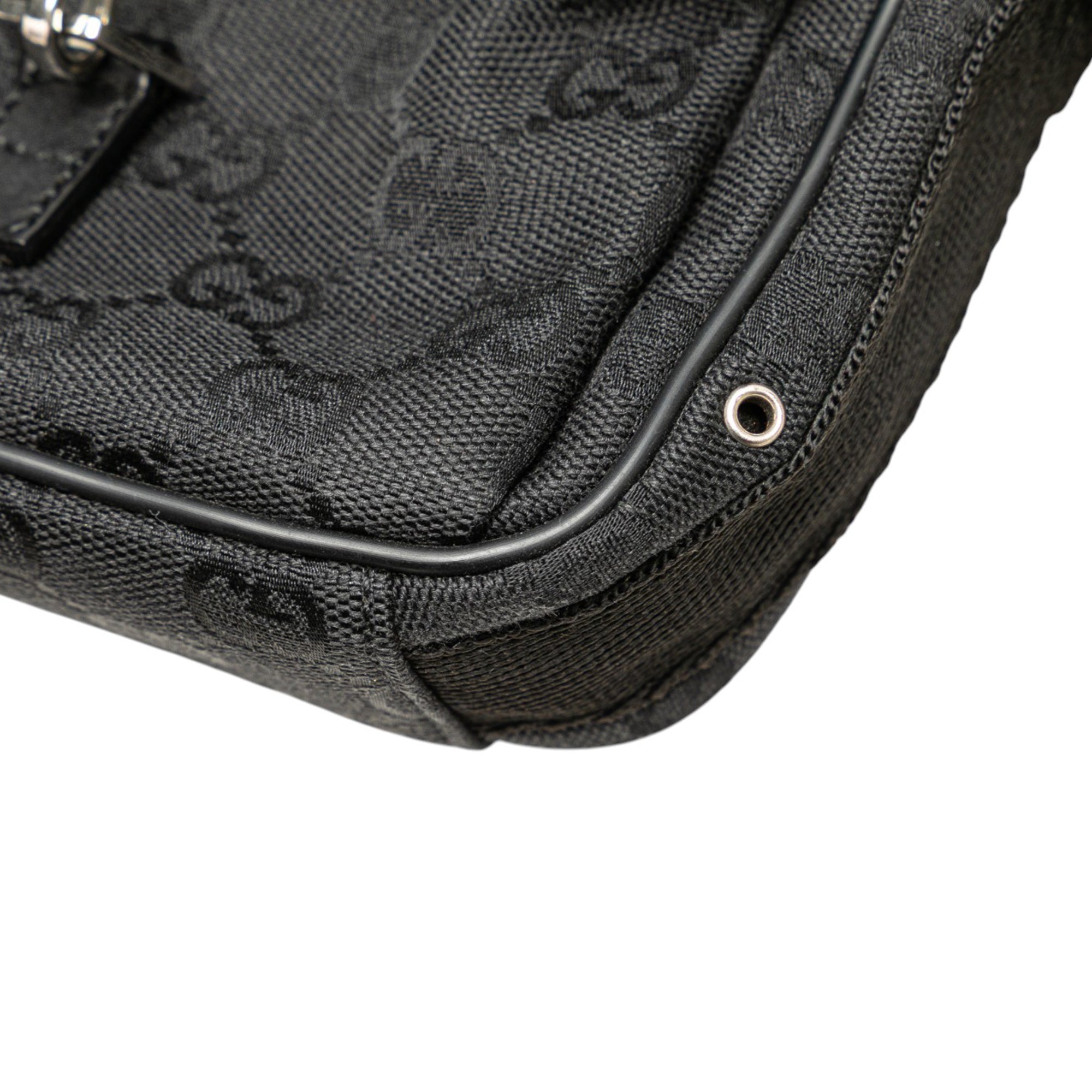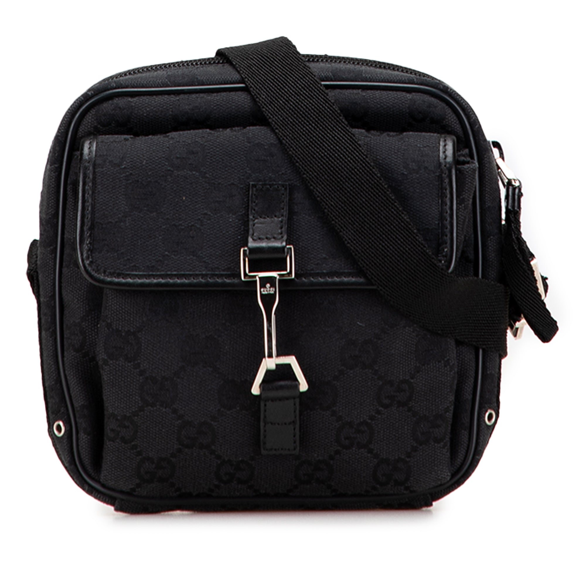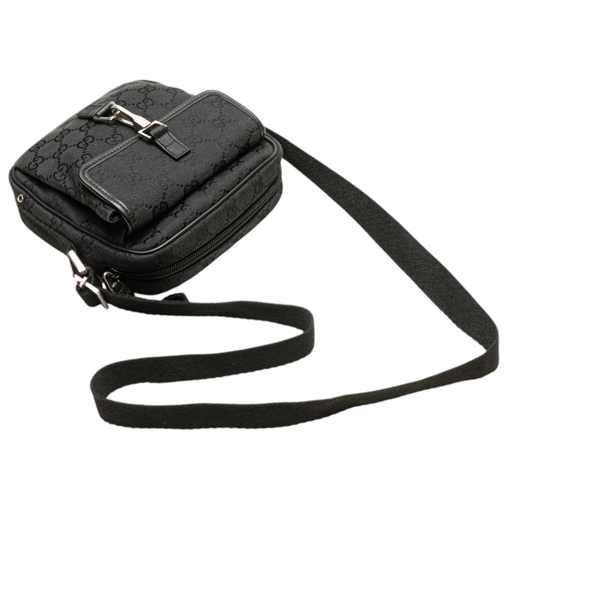 Product Details: Black Gucci GG Canvas Jackie Crossbody. This crossbody bag features a canvas body with leather trim, an adjustable flat canvas strap, a top zip closure, an exterior back slip pocket and a front flap pocket with lobster clasp closure, and an interior slip pocket. 5.9" L x 5.9" W x 1.8" D. Serial number 90470 001998.