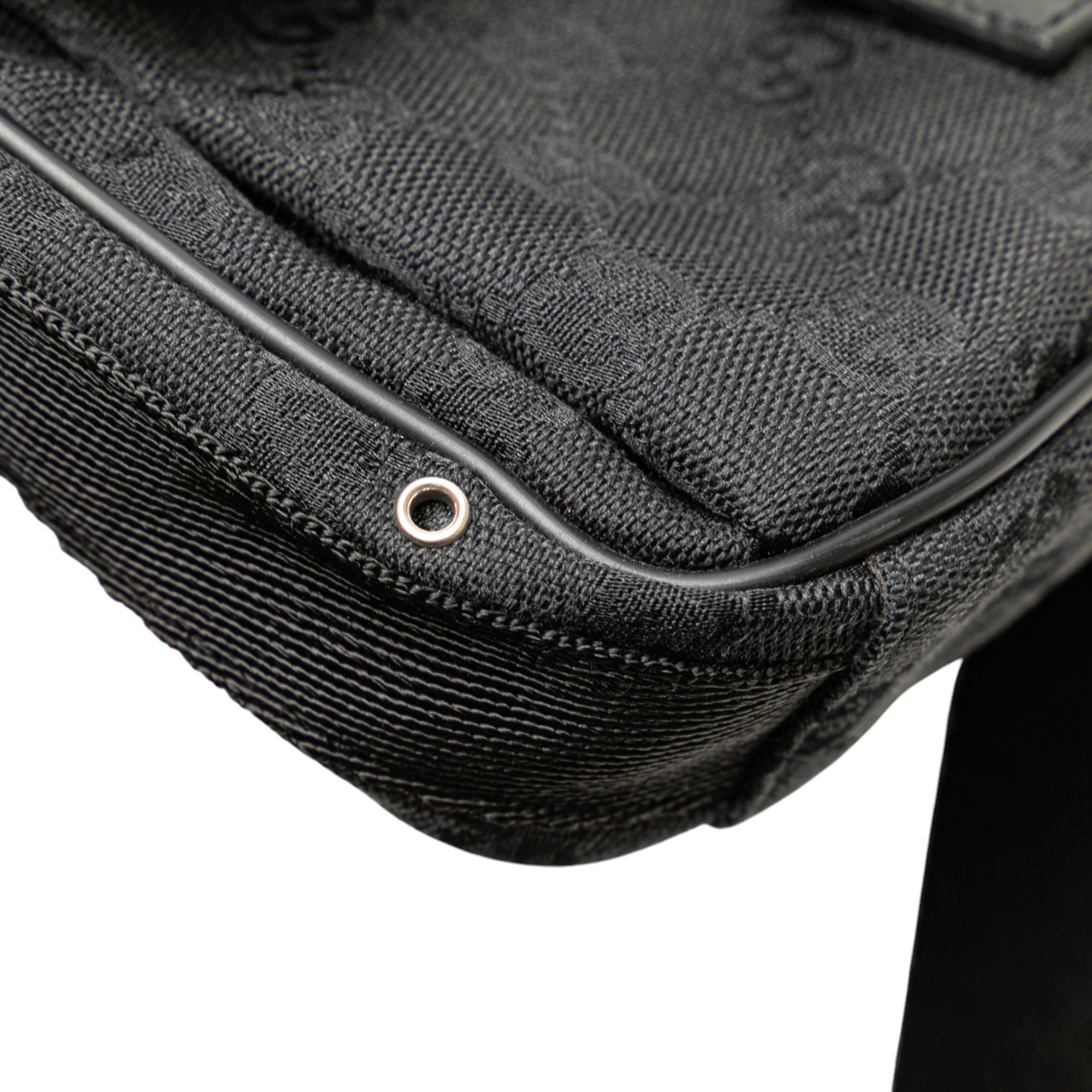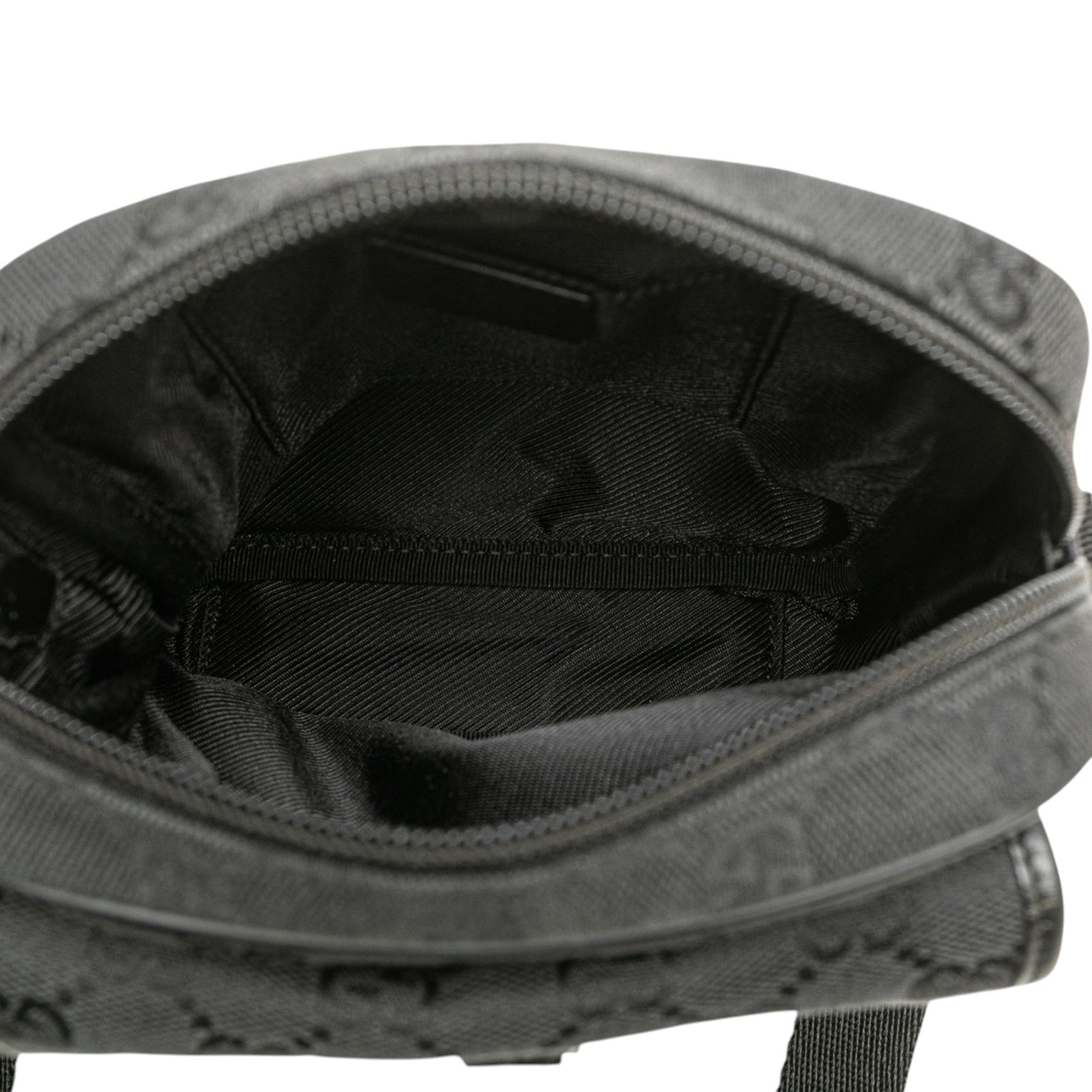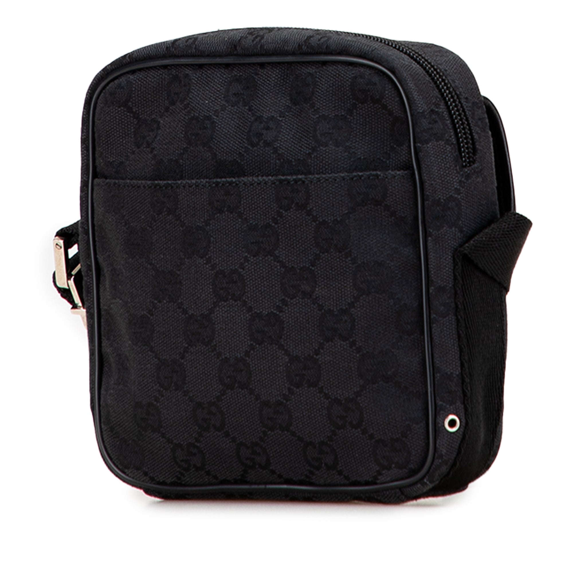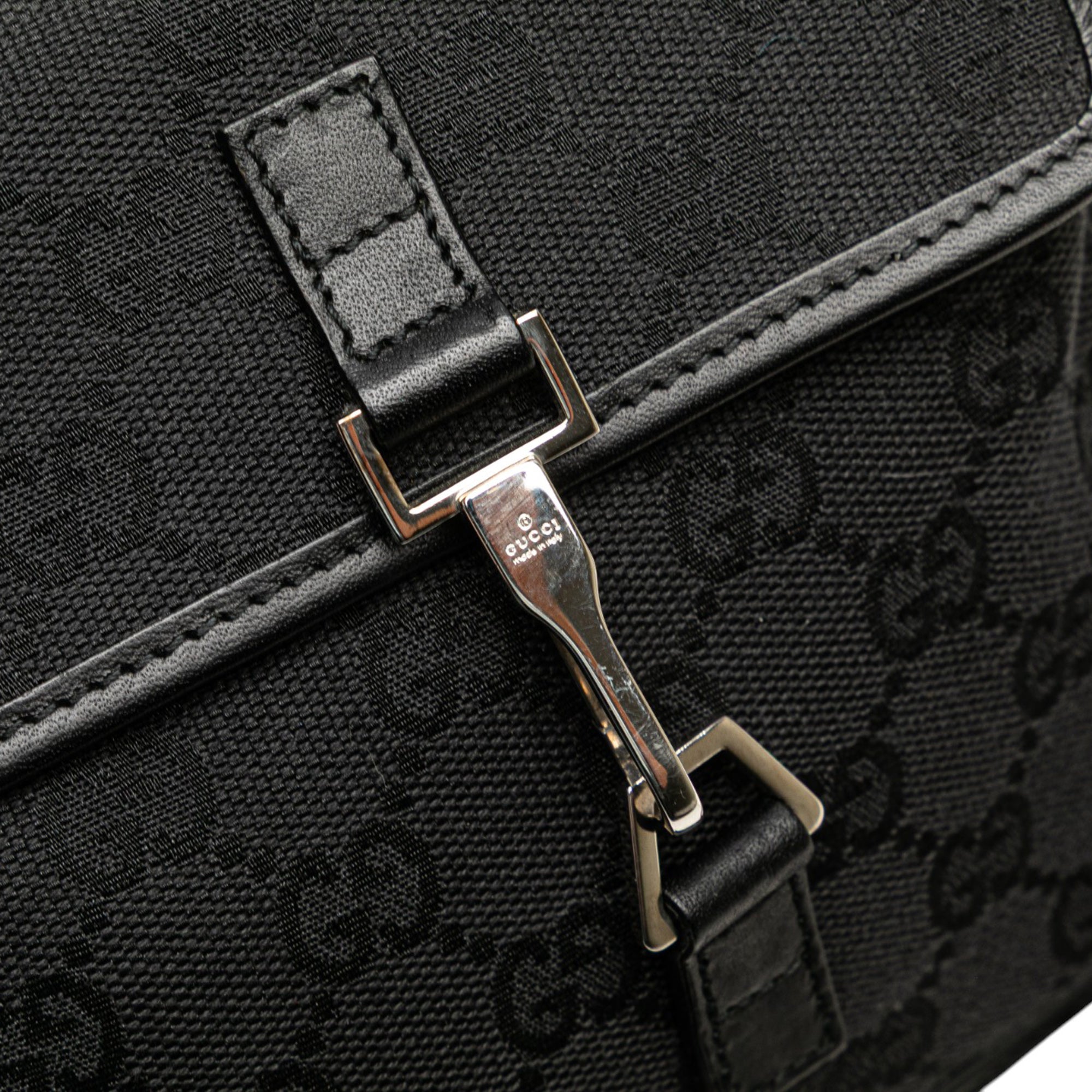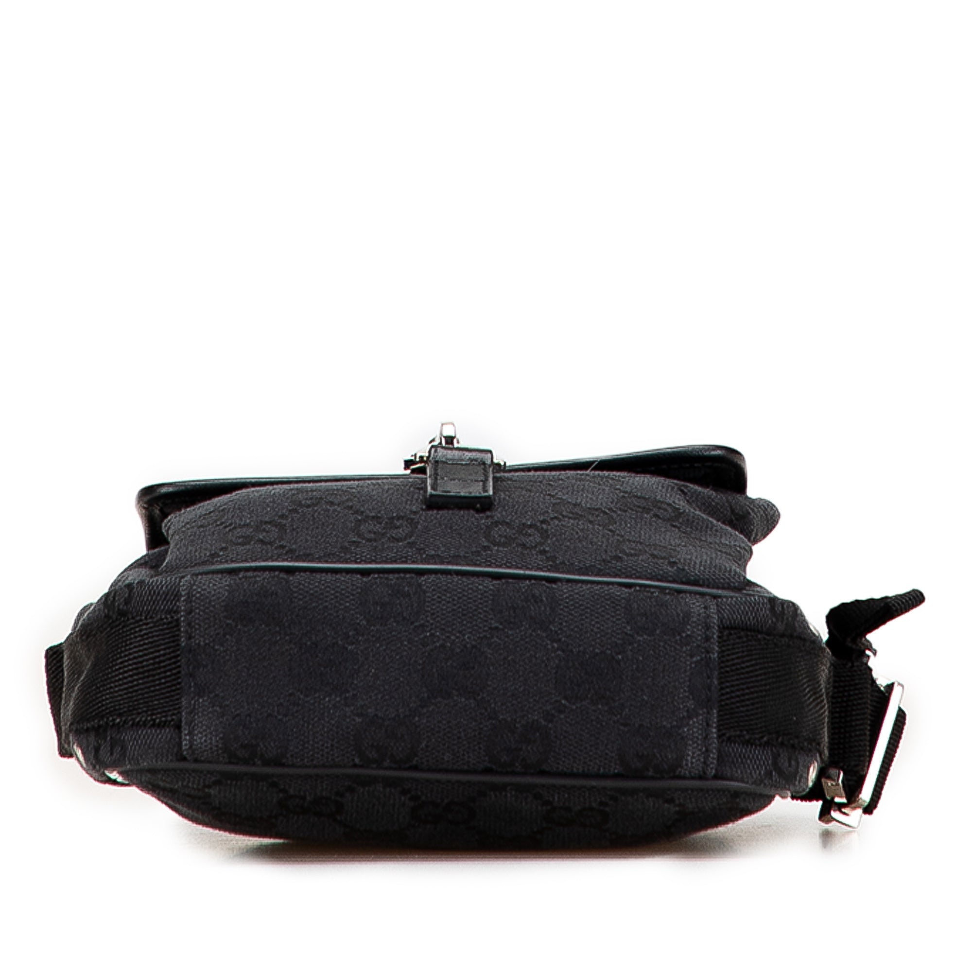 Product Details: Black Gucci GG Canvas Jackie Crossbody. This crossbody bag features a canvas body with leather trim, an adjustable flat canvas strap, a top zip closure, an exterior back slip pocket and a front flap pocket with lobster clasp closure, and an interior slip pocket. 5.9" L x 5.9" W x 1.8" D. Serial number 90470 001998.