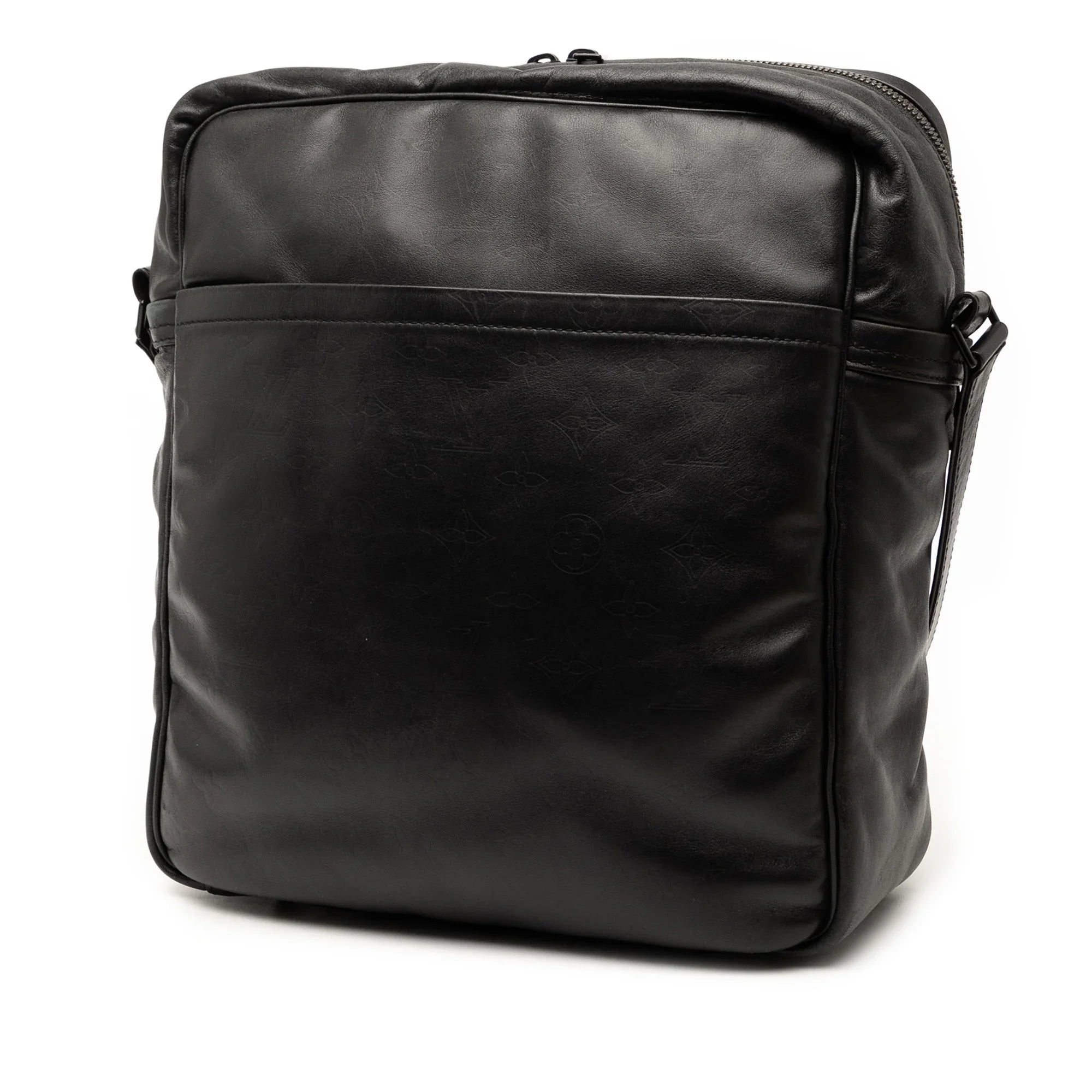 Product Details: Black Louis Vuitton Monogram Laser Clarkson Crossbody Bag. The Clarkson features a monogram laser leather body, a flat leather strap, a top zip closure, exterior zip and slip pockets, and interior slip pockets. 11.2" L x 10" W x 4.5" D. Serial number CA1012.