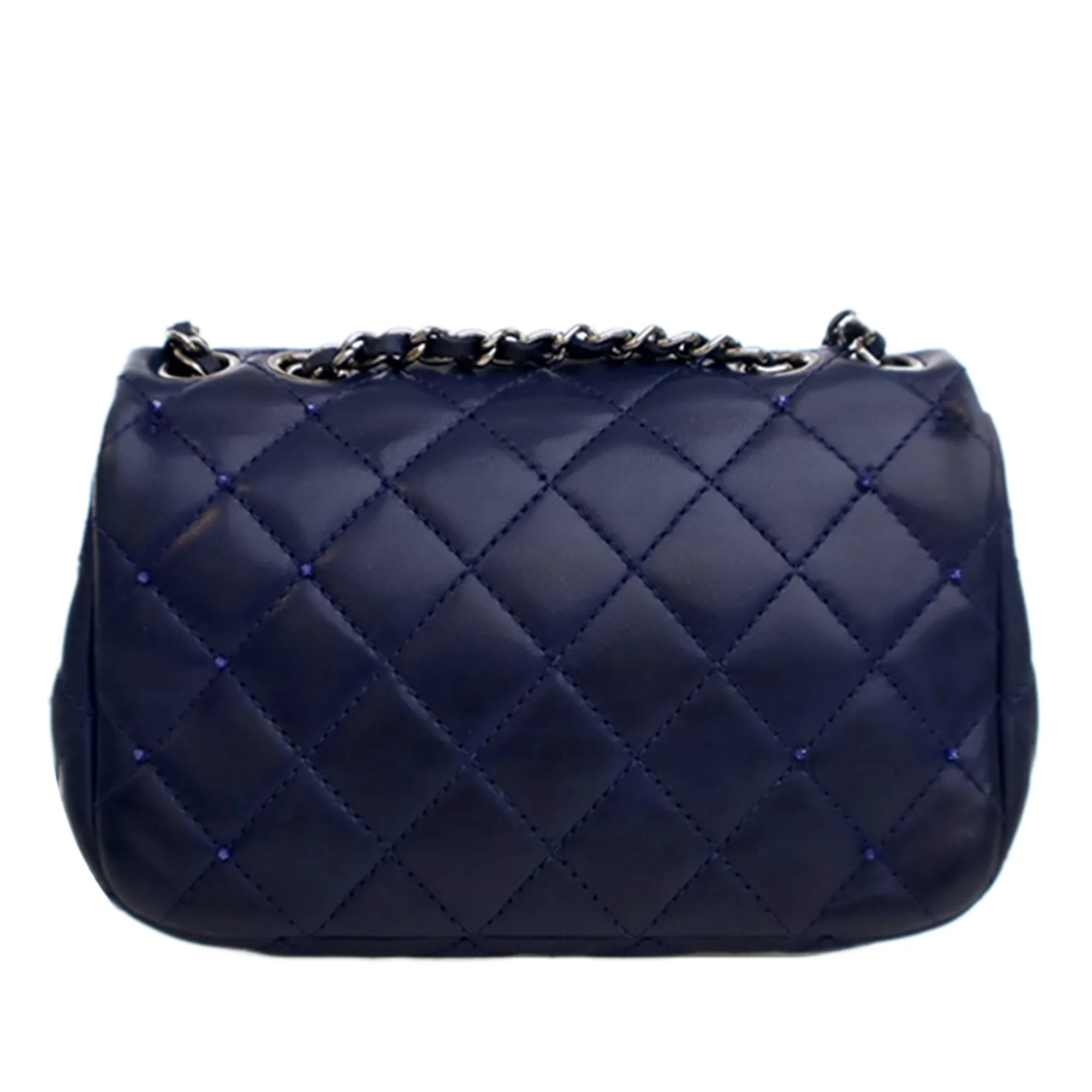 Product Details: Blue Chanel Mini Rectangular Classic Lambskin Crystal Single Flap Crossbody Bag. This flap bag features a lambskin leather body, a leather woven chain shoulder strap, a front flap with turn lock closure, and interior zip and slip pockets. 5.1" L x 7.1" W x 2" D.