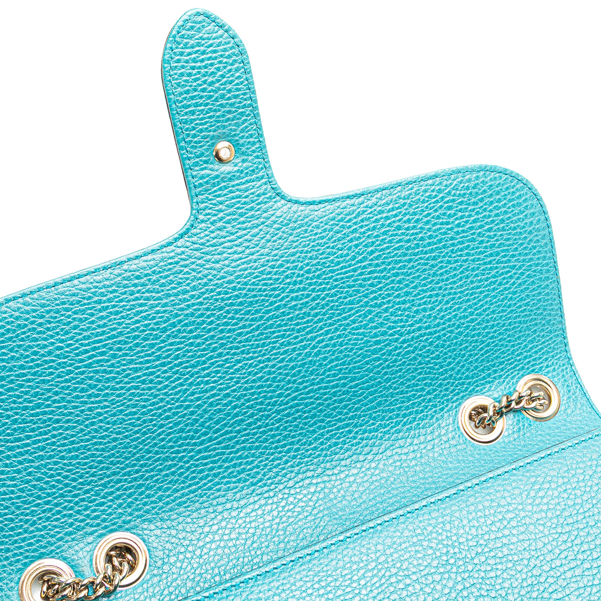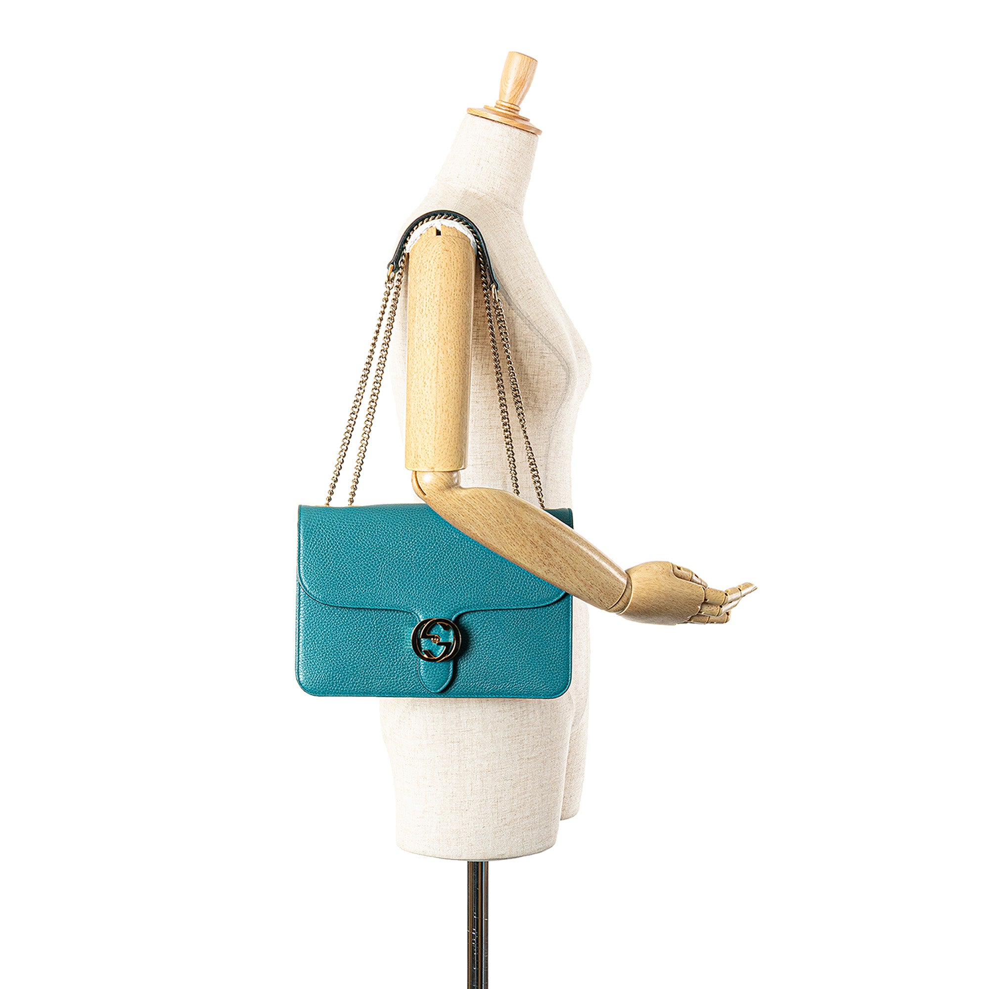 Product Details: Blue Gucci Medium Dollar Calfskin Interlocking G Crossbody. This crossbody bag features a leather body, a chain link strap with leather guard, a front flap with GG flip-lock closure, and an interior zip pocket. 7.9" L x 11" W x 1.2" D. Serial number 510303 493492.