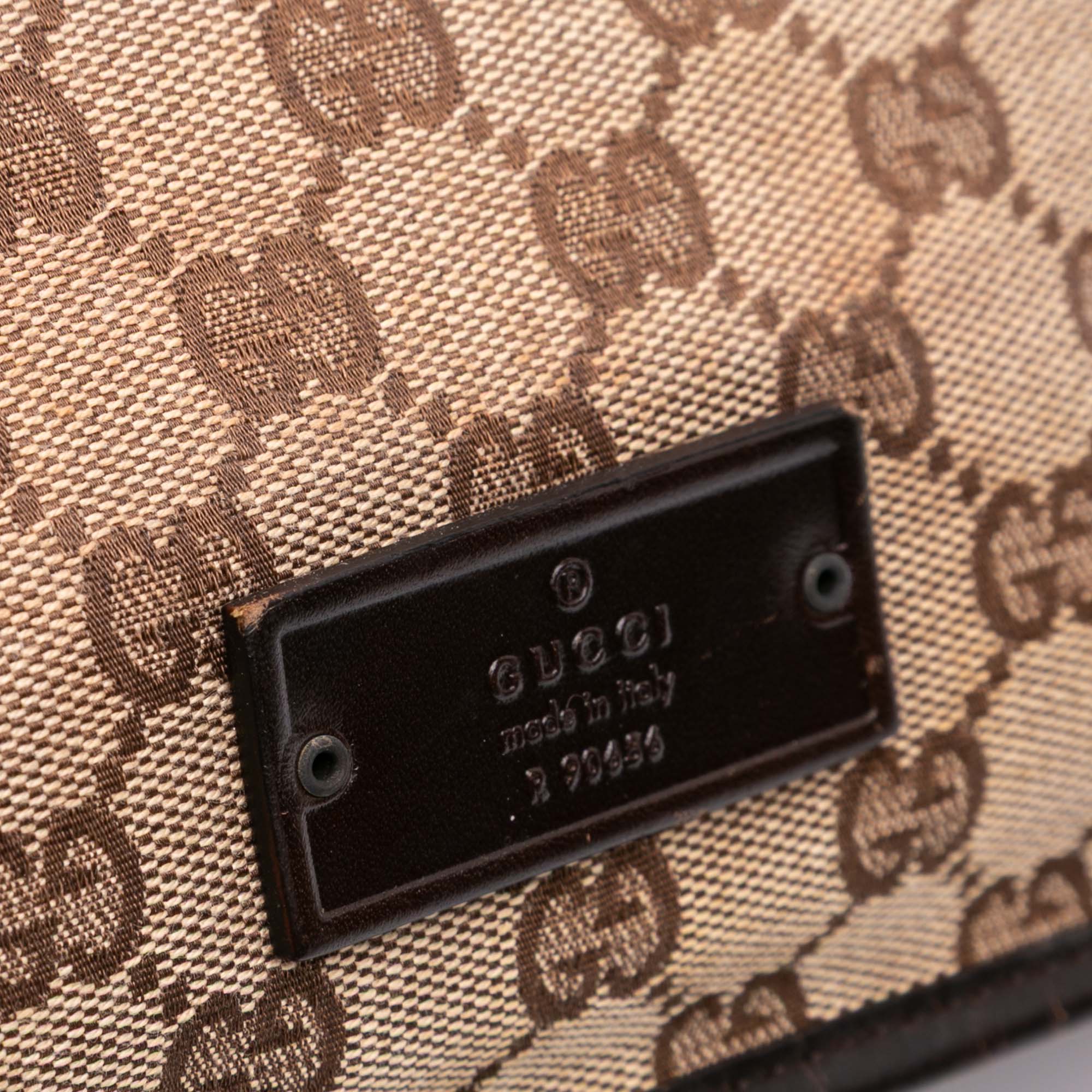 Product Details: Brown Gucci GG Canvas Messenger Bag . This crossbody bag features a canvas body with leather trim, a flat fabric strap, a top snap closure, and interior zip pocket. 11.2" L x 13.2" W x 0.4" D. Serial number 90656 002058.