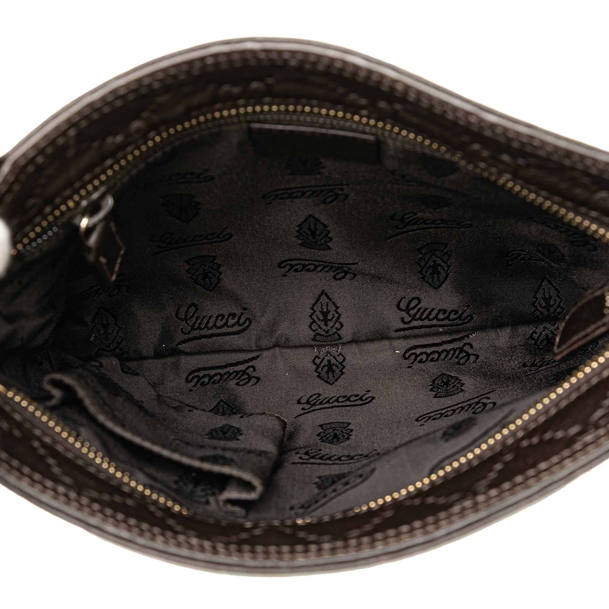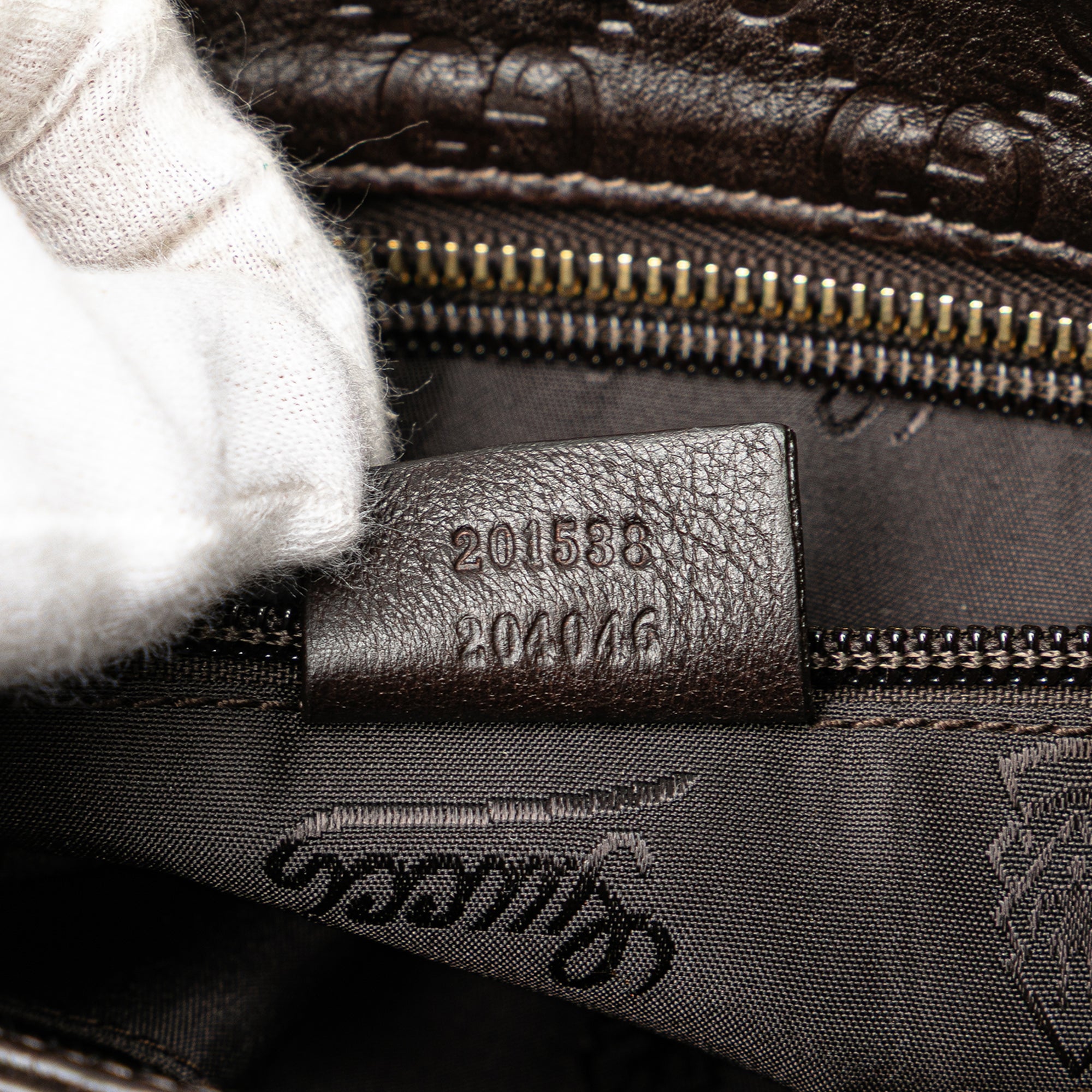 Product Details: Brown Gucci Guccissima Crossbody. This crossbody bag features an embossed leather body, an adjustable flat leather strap, a top zip closure, and interior zip and slip pockets. 8.3" L x 9.4" W x 0.8" D. Serial number 201538 204046.
