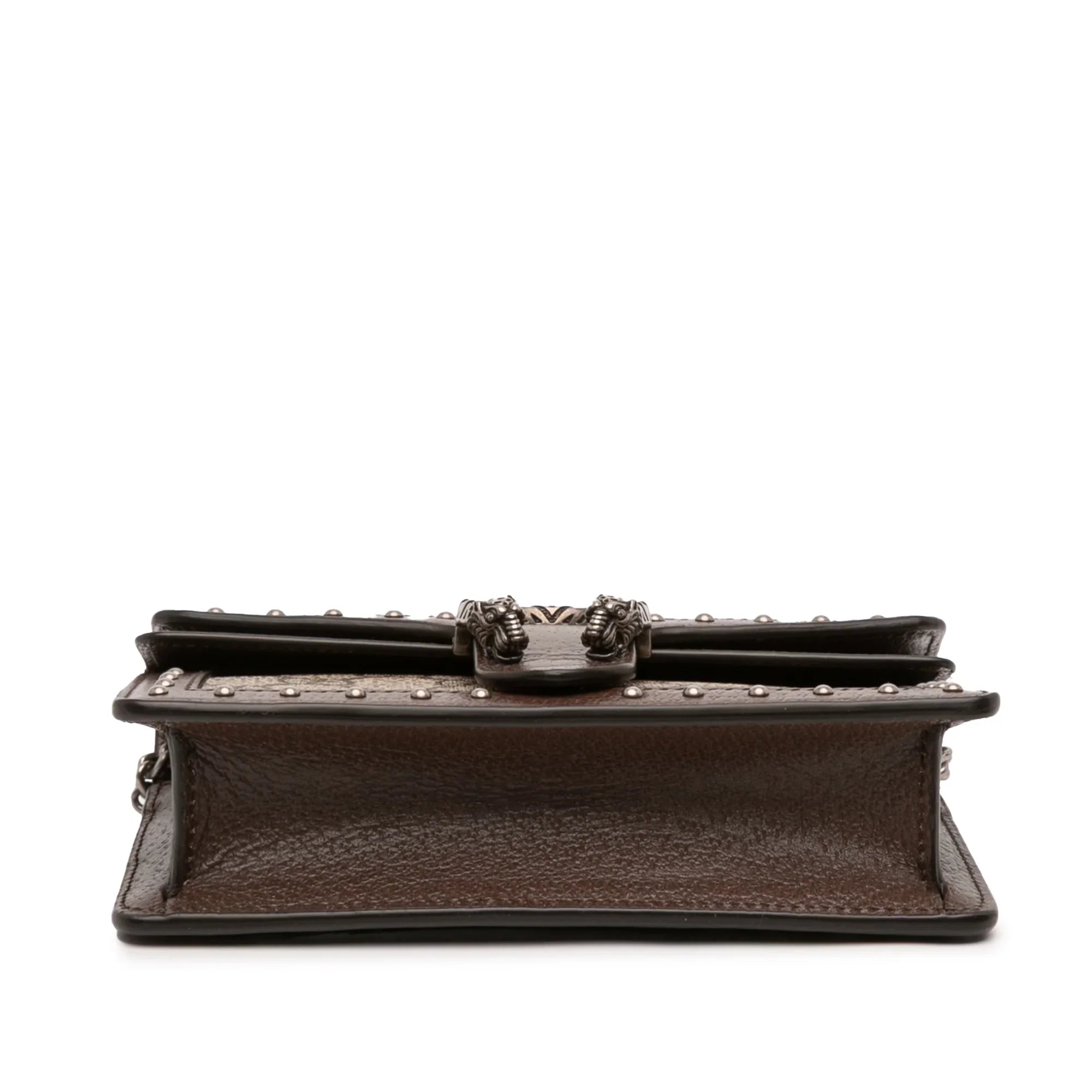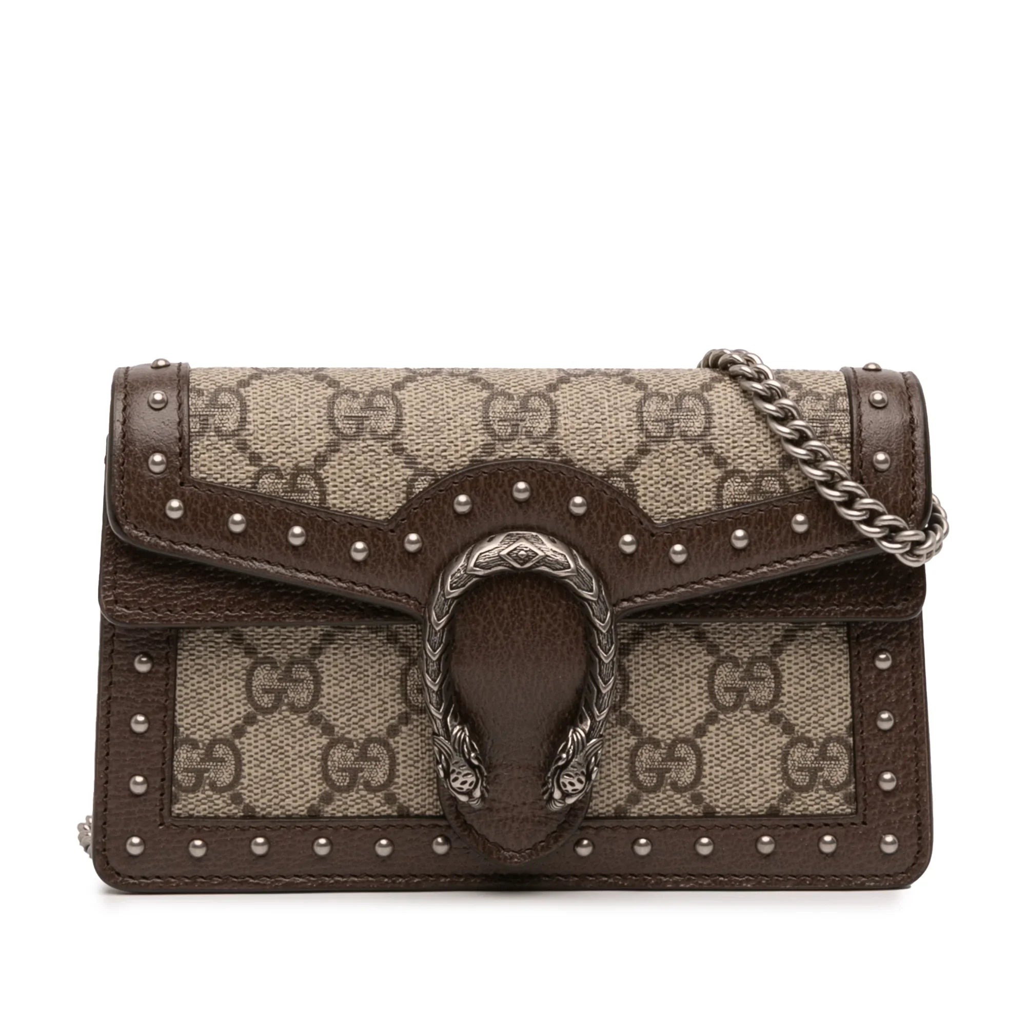 Product Details: Brown Gucci Mini GG Supreme Studs Dionysus Crossbody. This crossbody bag features a coated canvas body with studded leather trim, a chain link shoulder strap, and a front flap with a snap button closure. 3.9" L x 6.5" W x 1.8" D. Serial number 476432 2067.