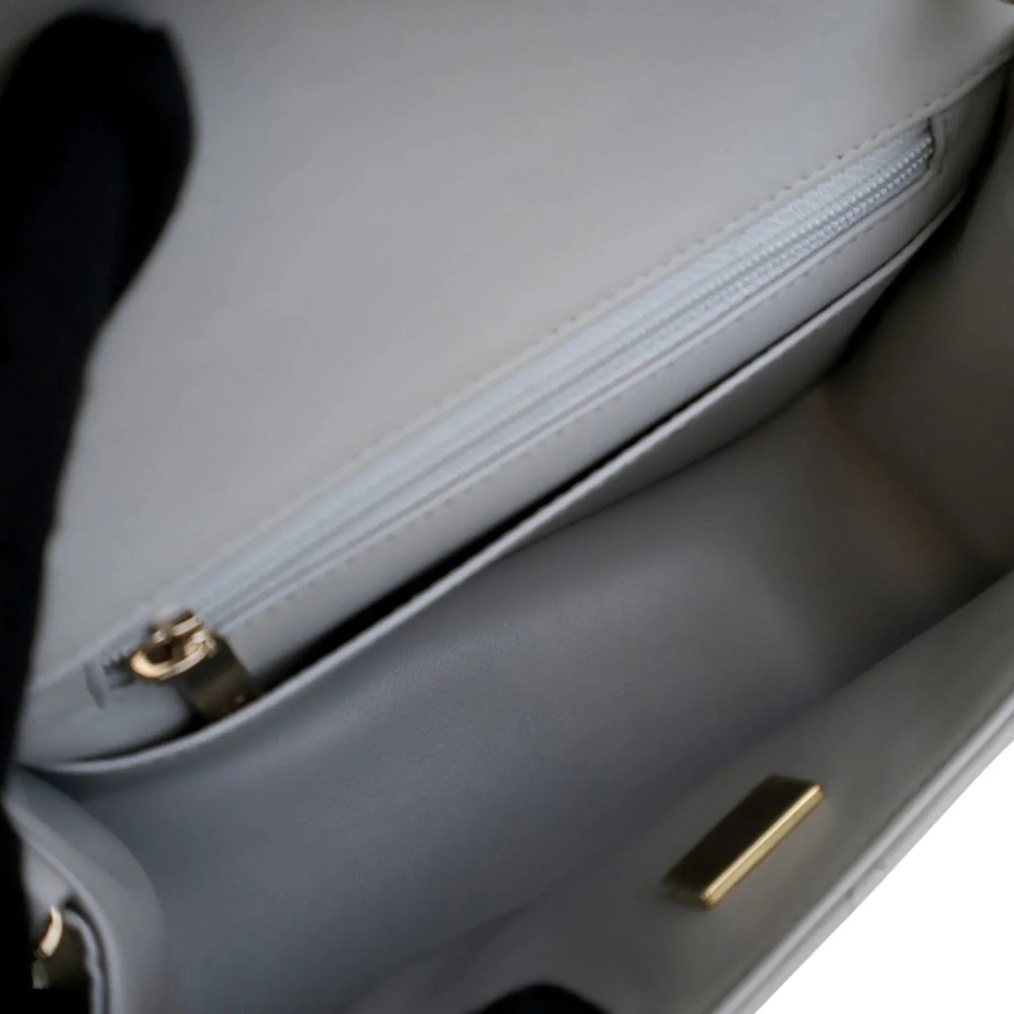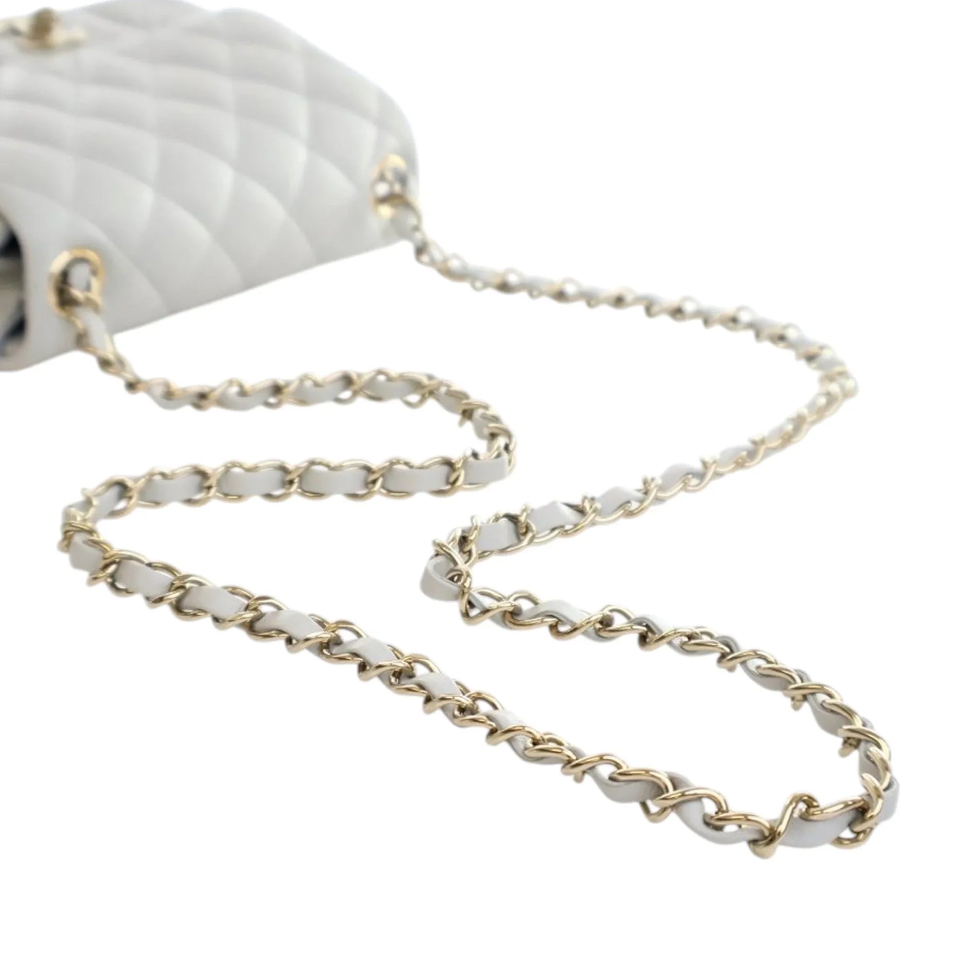 Product Details: Gray Chanel Mini Square Classic Lambskin Single Flap Crossbody Bag. This crossbody bag features a quilted lambskin leather body, a leather woven chain shoulder strap, a front flap with turn-lock closure, an exterior back slip pocket, and interior zip and slip pockets. 5" L x 6.3" W x 2.5" D.