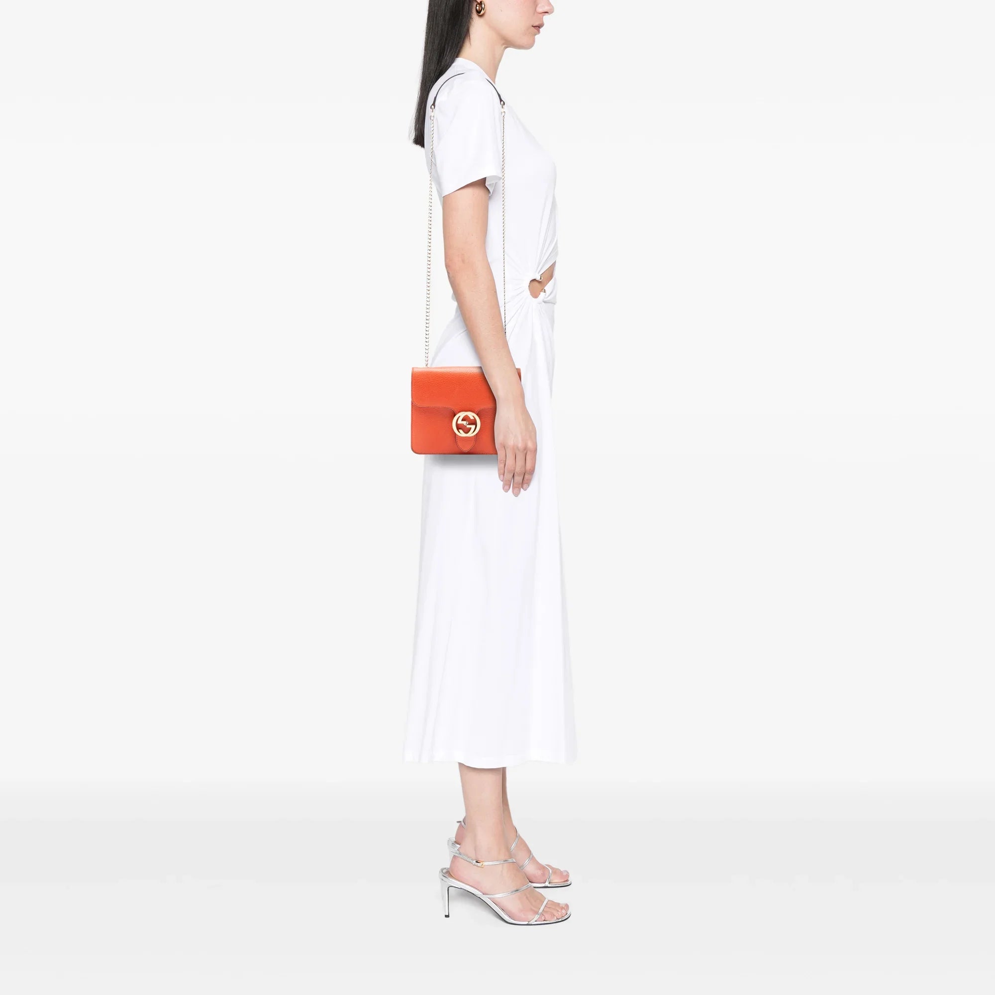 Product Details: Orange Gucci Small Dollar Calfskin Interlocking G Crossbody. This crossbody bag features a leather body, a chain-link shoulder strap with leather shoulder guard, a front flap with silver-tone interlocking GG flip-lock closure, interior compartments, and an interior slip pocket. 6.1" L x 7.7" W x 1.6" D. Serial number 510304 591693.
