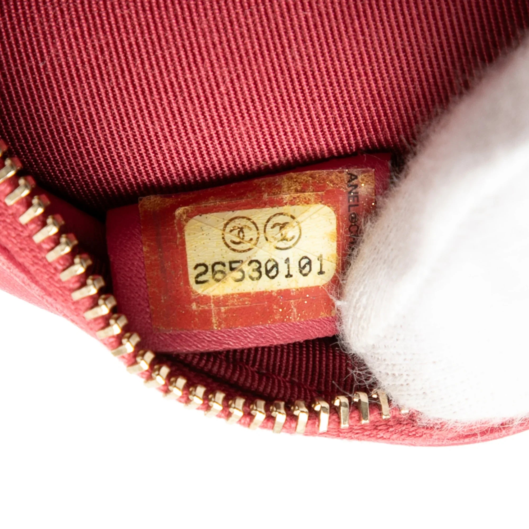 Product Details: Pink Chanel CC Quilted Lambskin Round Clutch With Chain Crossbody Bag. This crossbody bag features a quilted lambskin leather body, a leather woven chain strap, a top zip closure, and interior slip pockets. 4.7" L x 4.7" W x 1.6" D. Serial number 26530101.