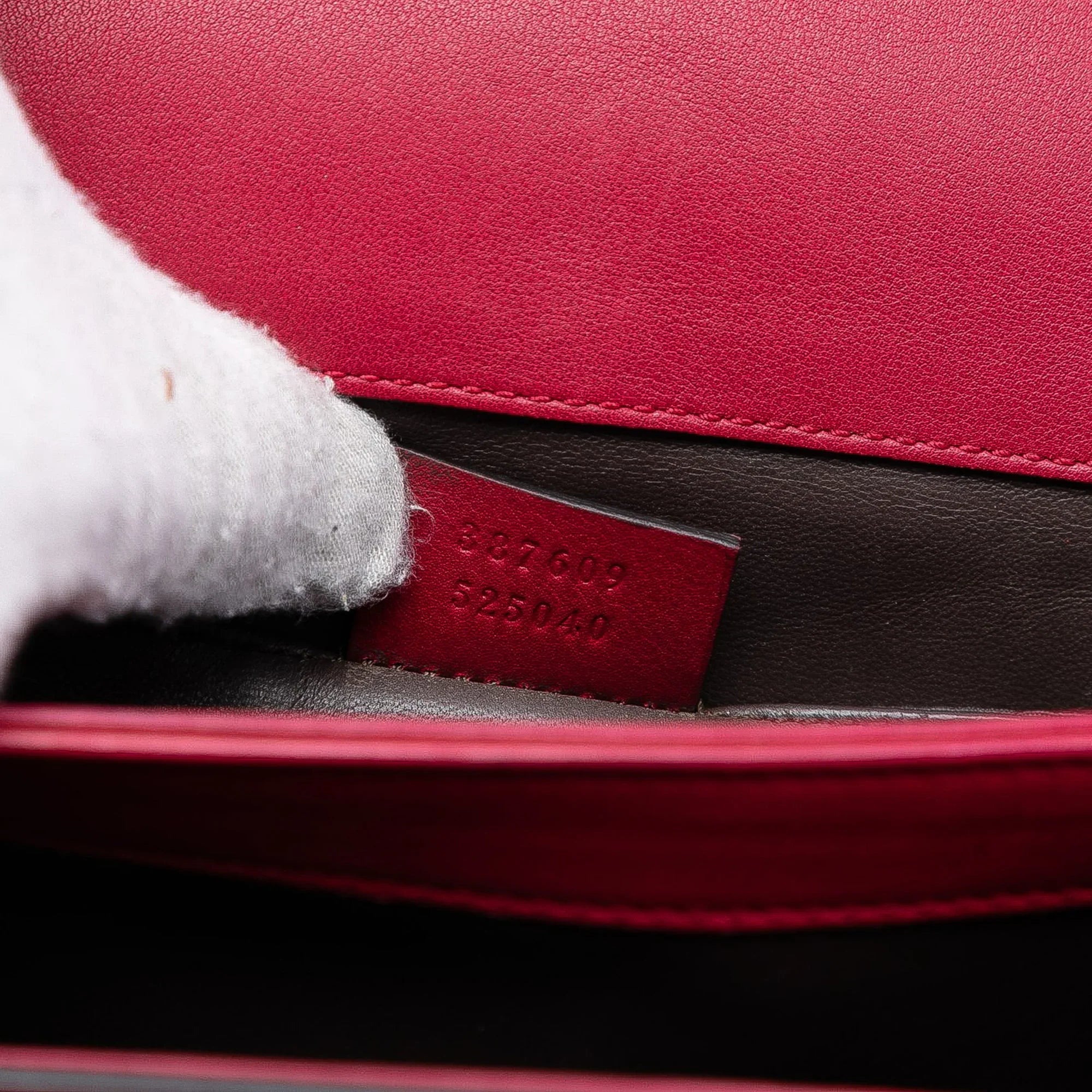 Product Details: Red Gucci Small Polished Calfskin Interlocking G Dollar Crossbody. This crossbody bag features a polished leather body, a silver-tone chain link strap, a flap with GG flip-lock closure, and an interior slip pocket. 5.9" L x 7.9" W x 2" D. Serial number 387609 525040.