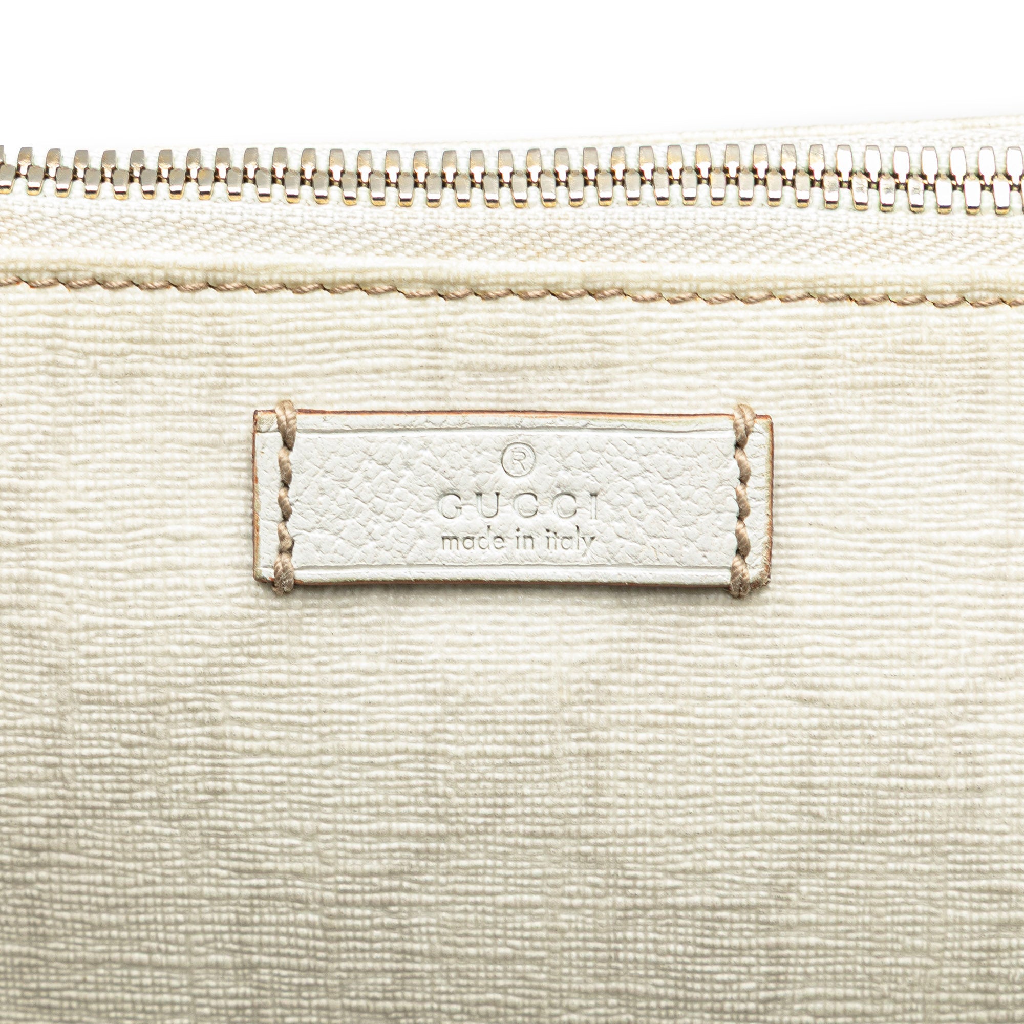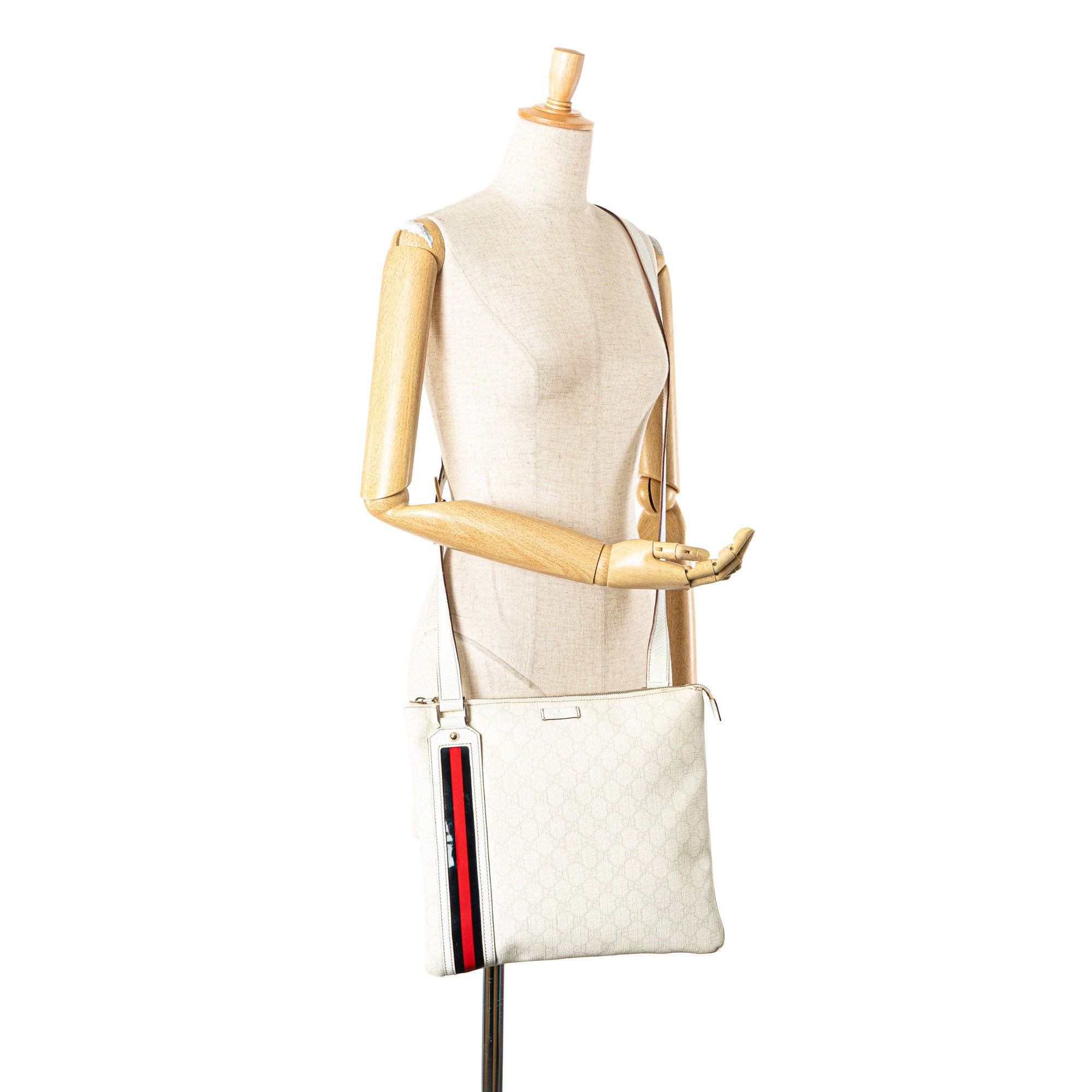 Product Details: White Gucci GG Supreme Web Crossbody. This shoulder bag features a coated canvas body with web detail, flat leather strap, a top zip closure, and interior zip and slip pockets. 11.4" L x 12.4" W x 0.4" D. Serial number 152608.491403.