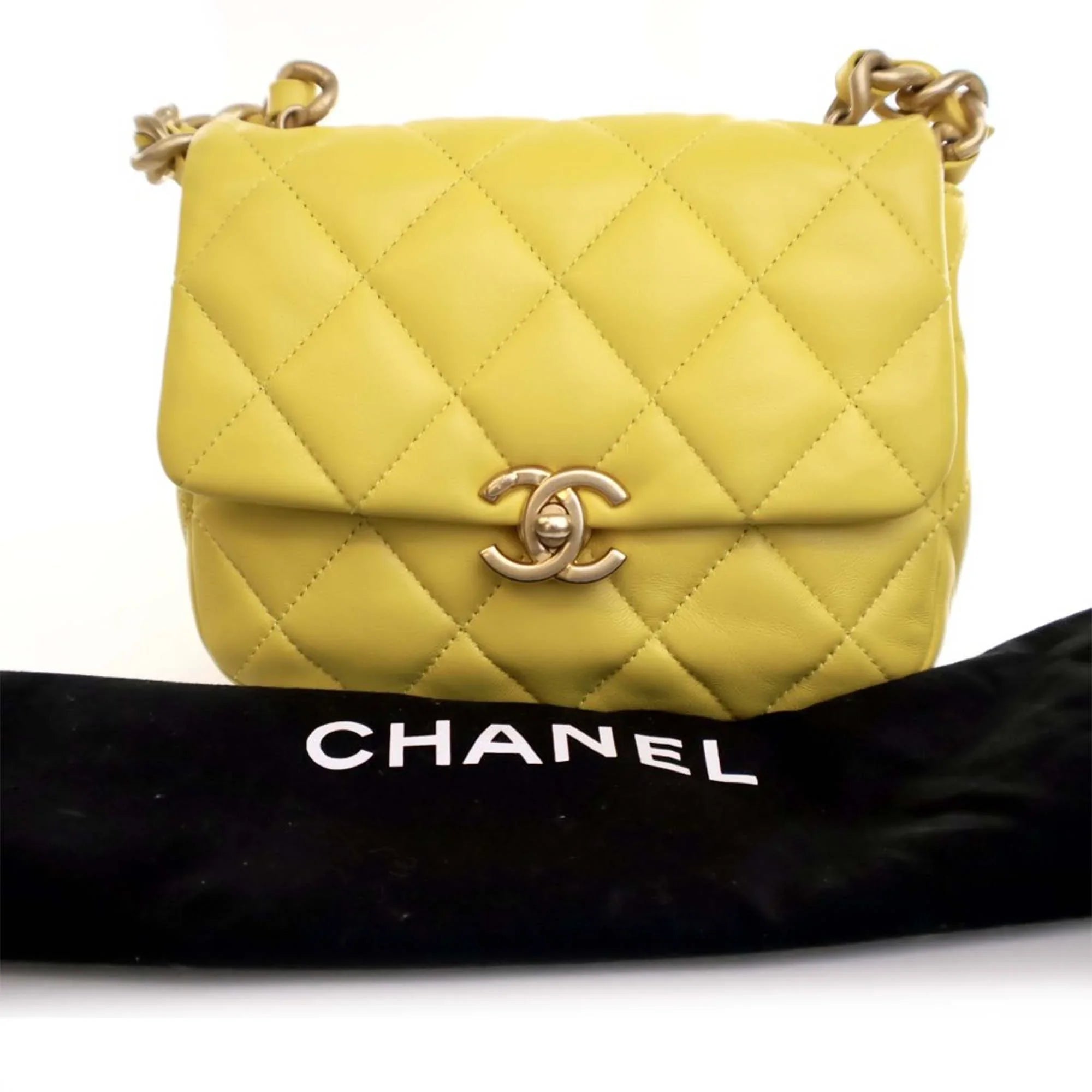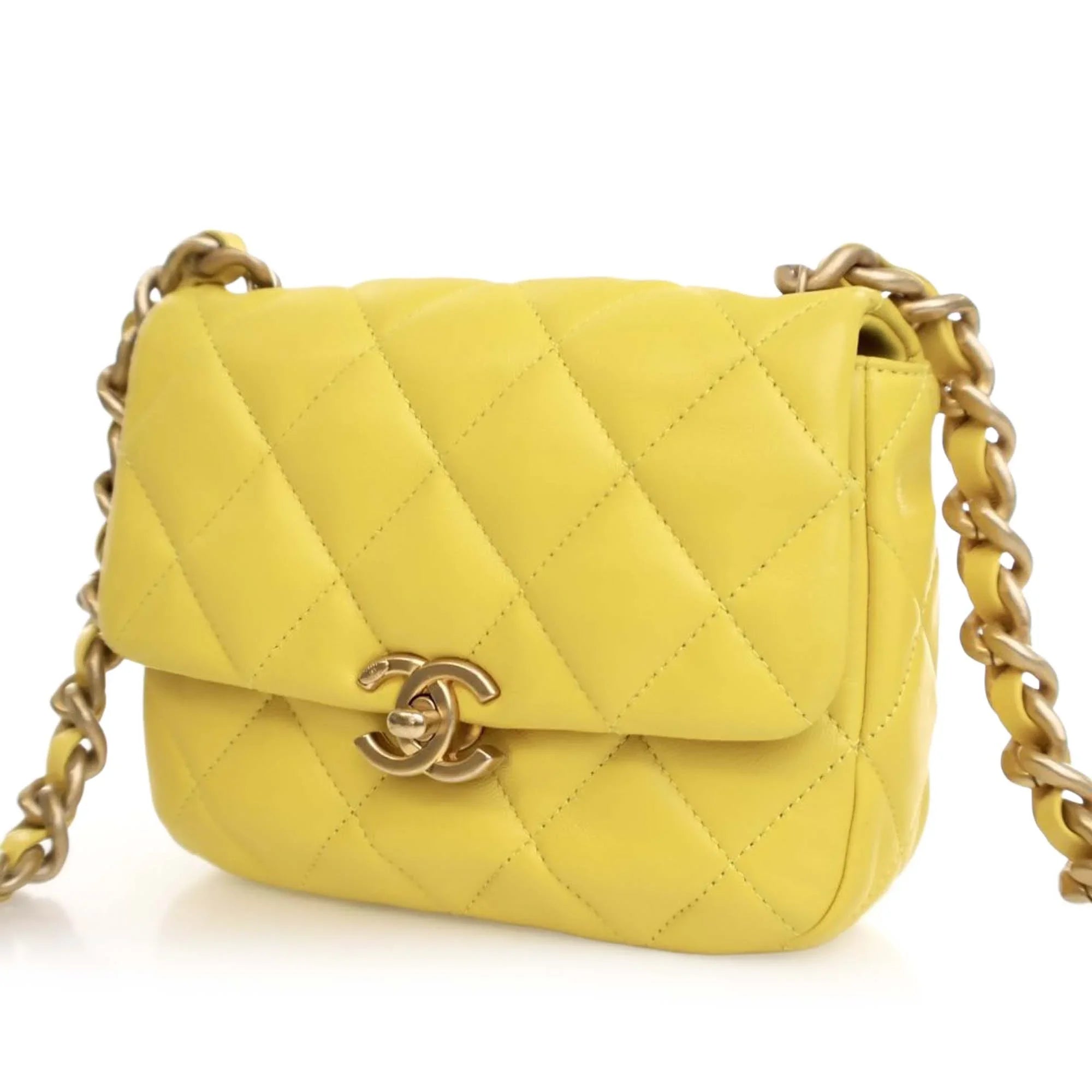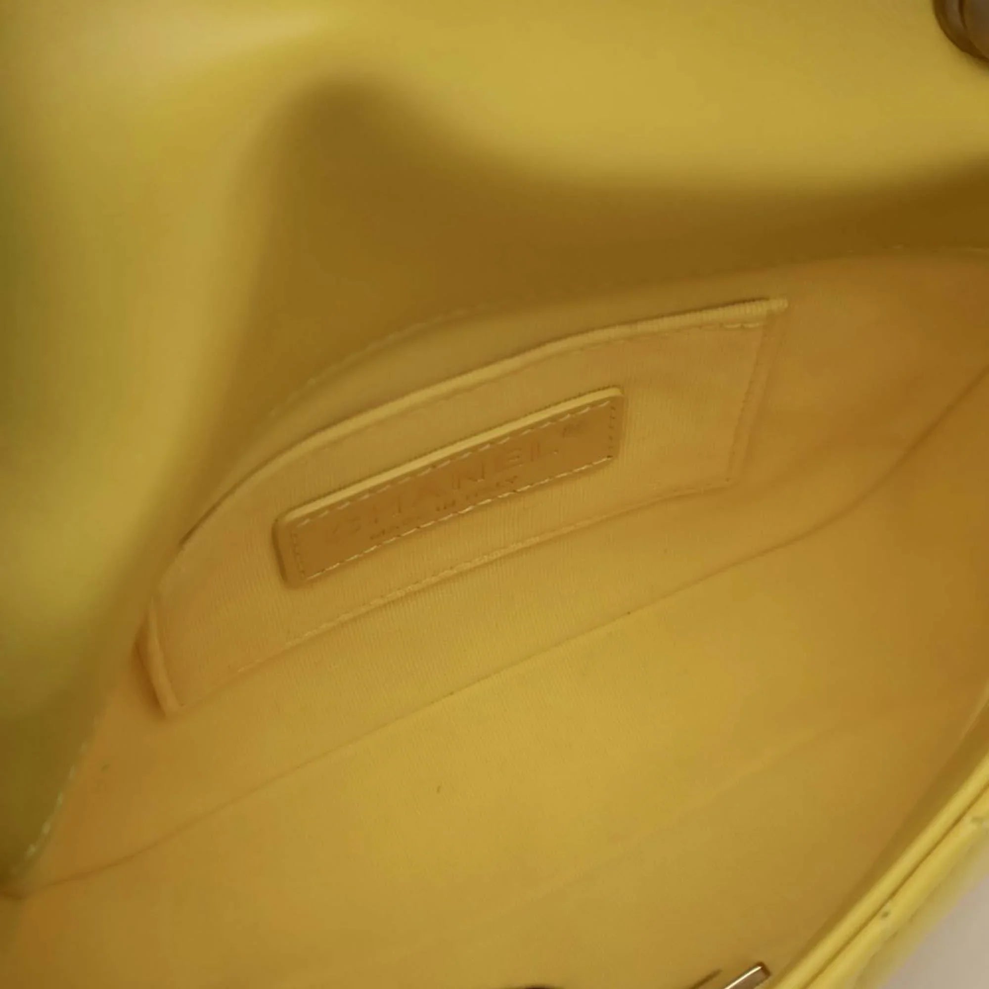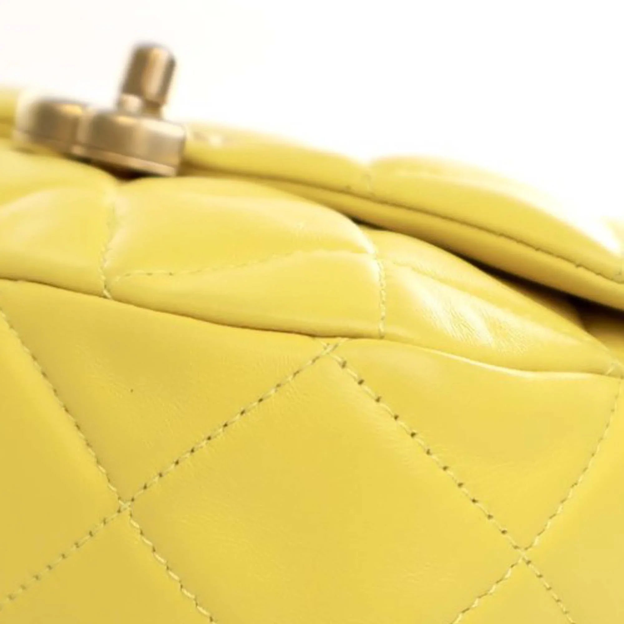 Product Details: Yellow Chanel Mini Quilted Lambskin Candy Chain Flap Crossbody Bag. This flap features a quilted lambskin leather body, a leather woven lacquered chain strap, a front flap with twist lock closure, and an interior slip pocket. 5.5" L x 7.5" W x 2" D.