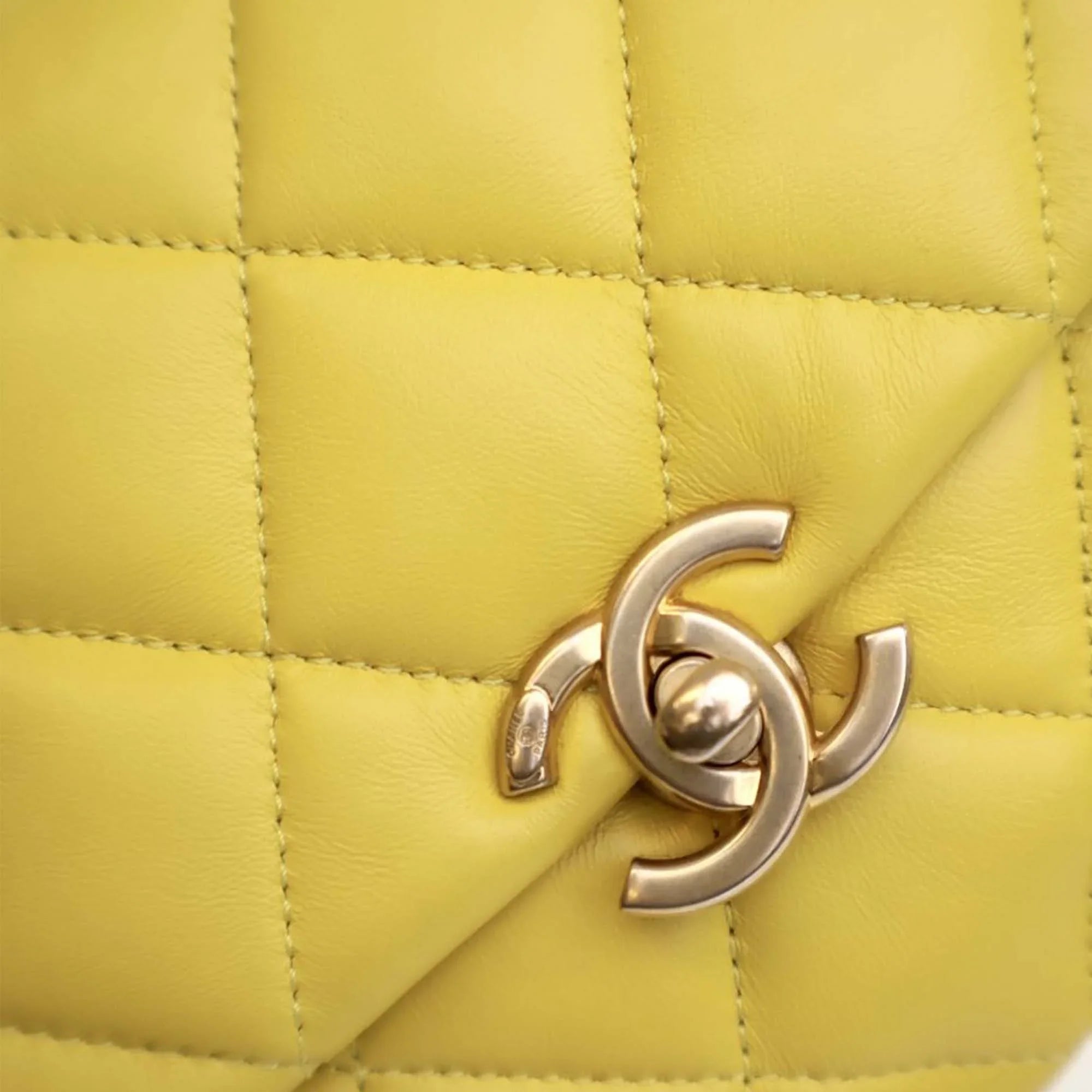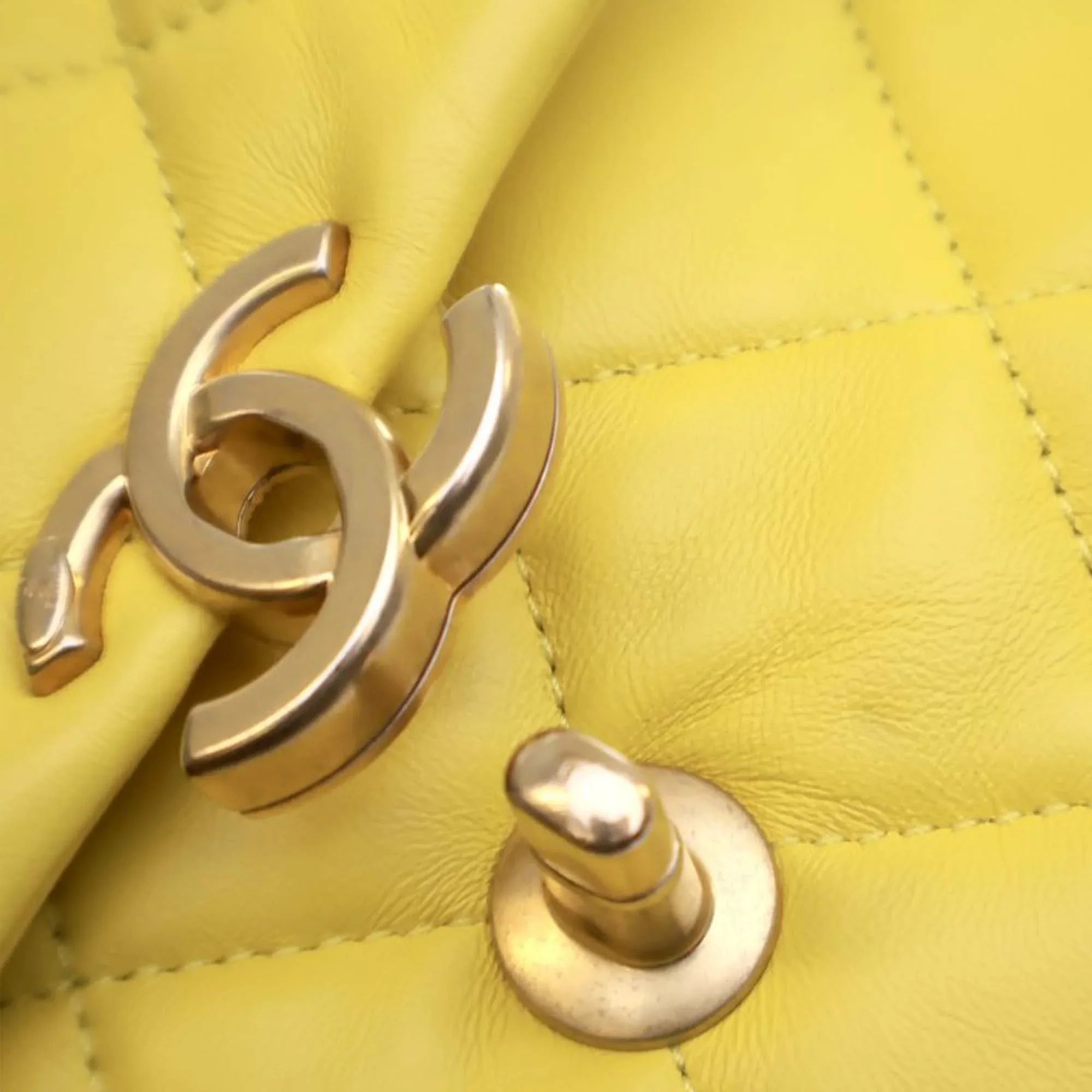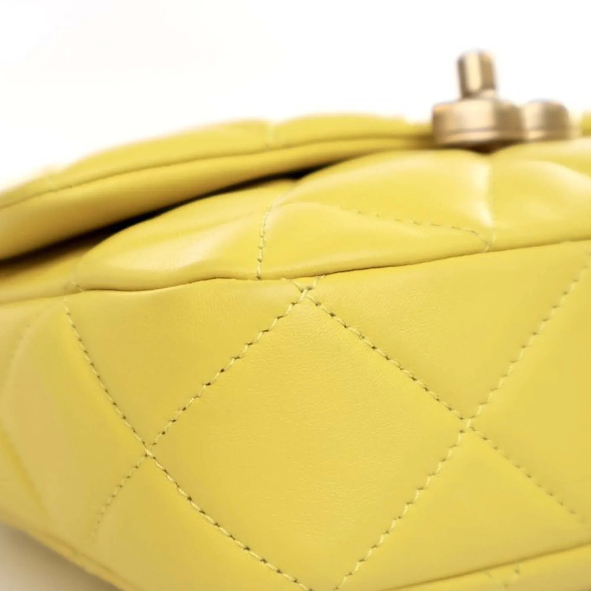 Product Details: Yellow Chanel Mini Quilted Lambskin Candy Chain Flap Crossbody Bag. This flap features a quilted lambskin leather body, a leather woven lacquered chain strap, a front flap with twist lock closure, and an interior slip pocket. 5.5" L x 7.5" W x 2" D.