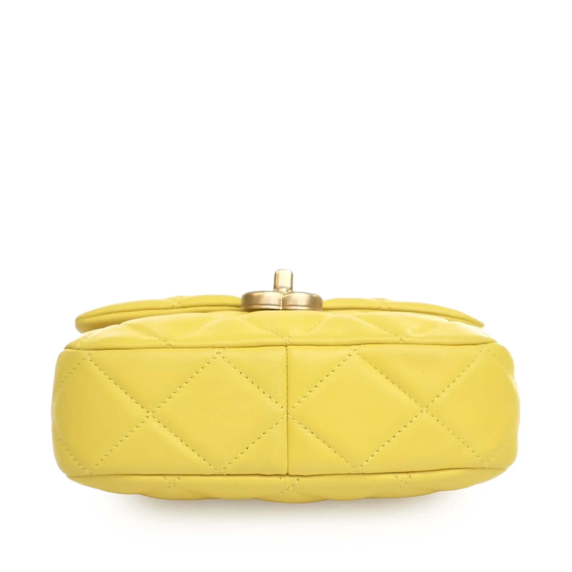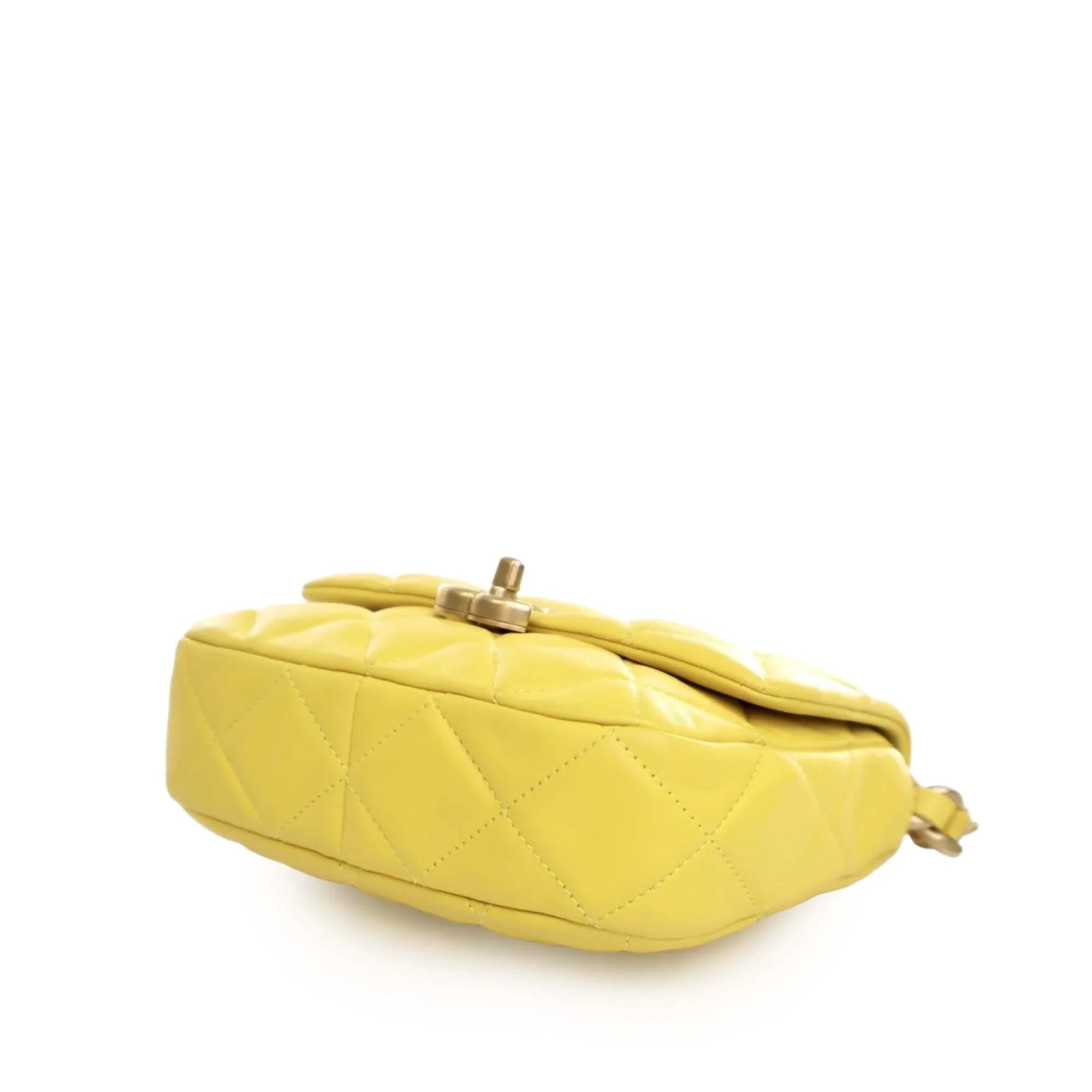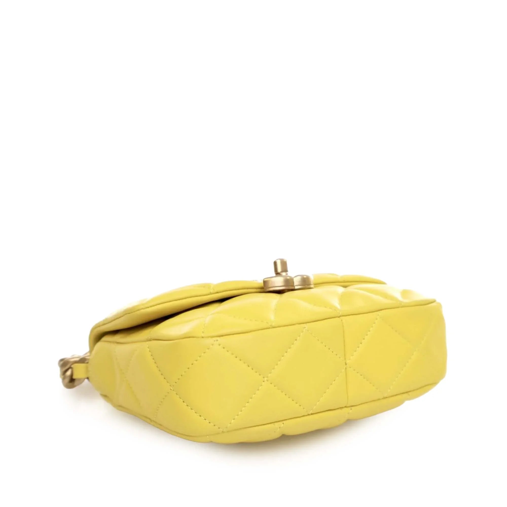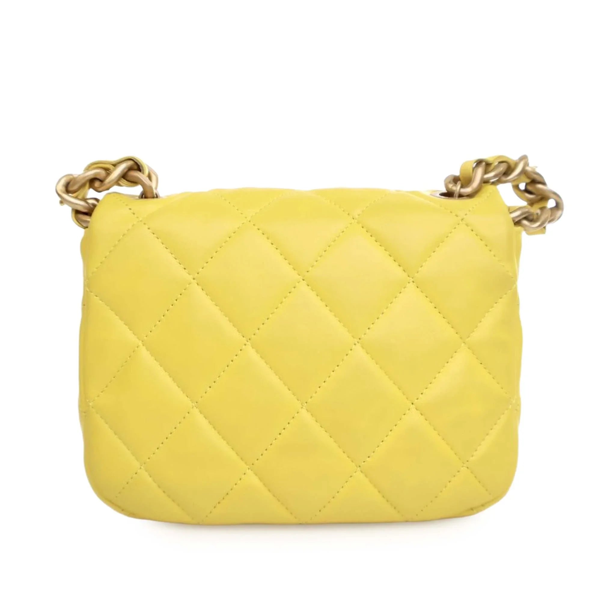Product Details: Yellow Chanel Mini Quilted Lambskin Candy Chain Flap Crossbody Bag. This flap features a quilted lambskin leather body, a leather woven lacquered chain strap, a front flap with twist lock closure, and an interior slip pocket. 5.5" L x 7.5" W x 2" D.