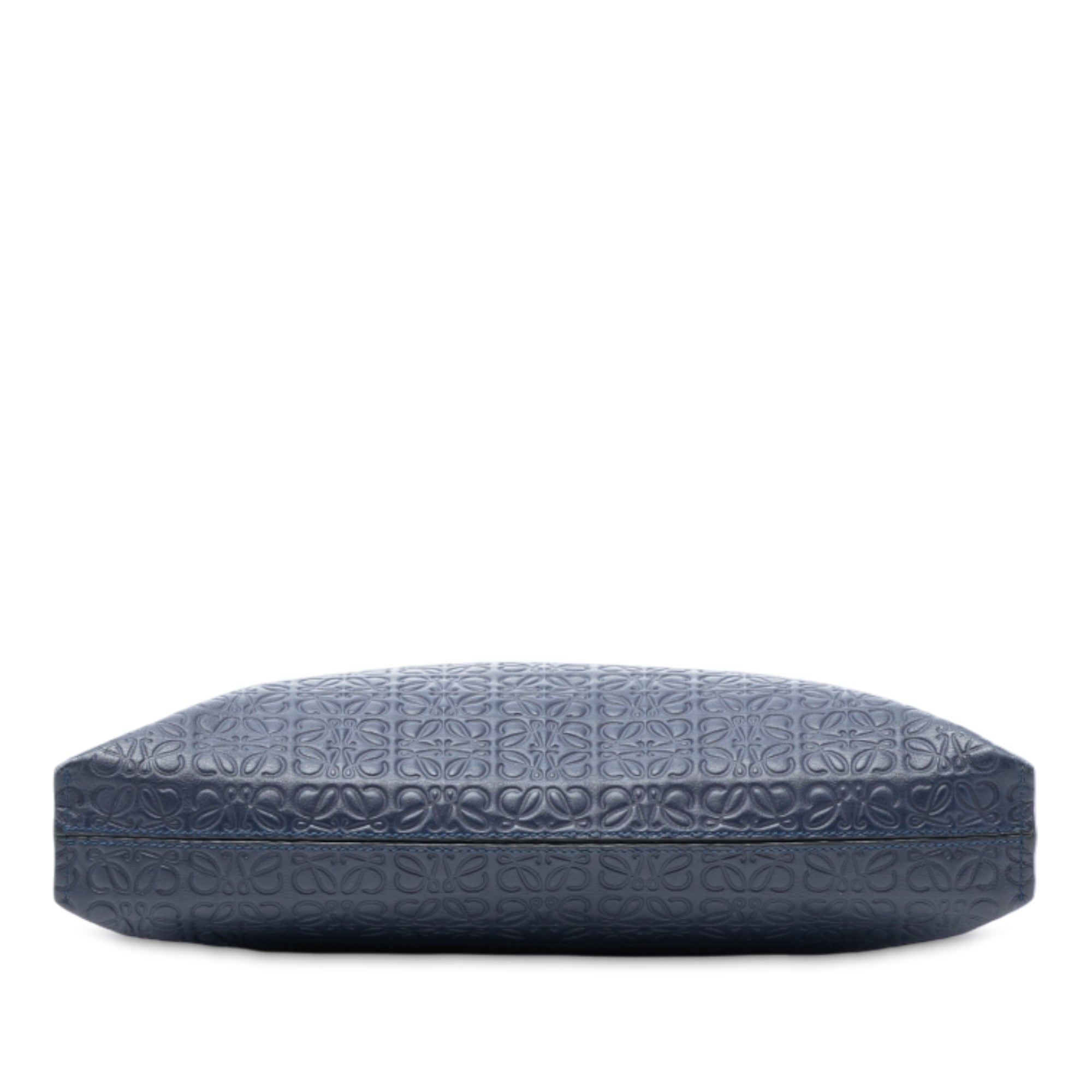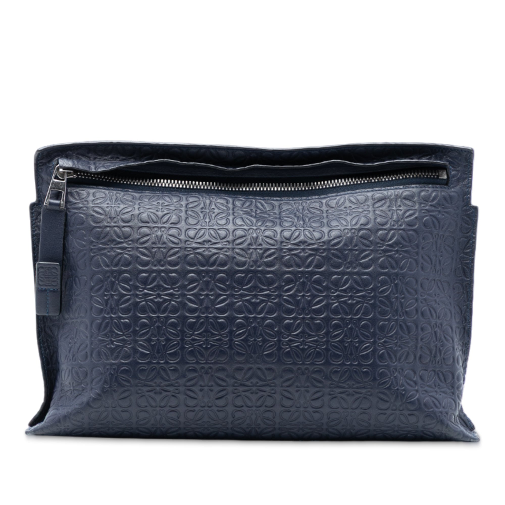 Product Details: Blue LOEWE Embossed Leather Anagram Repeat T Clutch. This clutch bag features an embossed leather body, a front zip closure, and an interior slip pocket. 8.3" L x 11.6" W x 2" D. Serial number 261602.