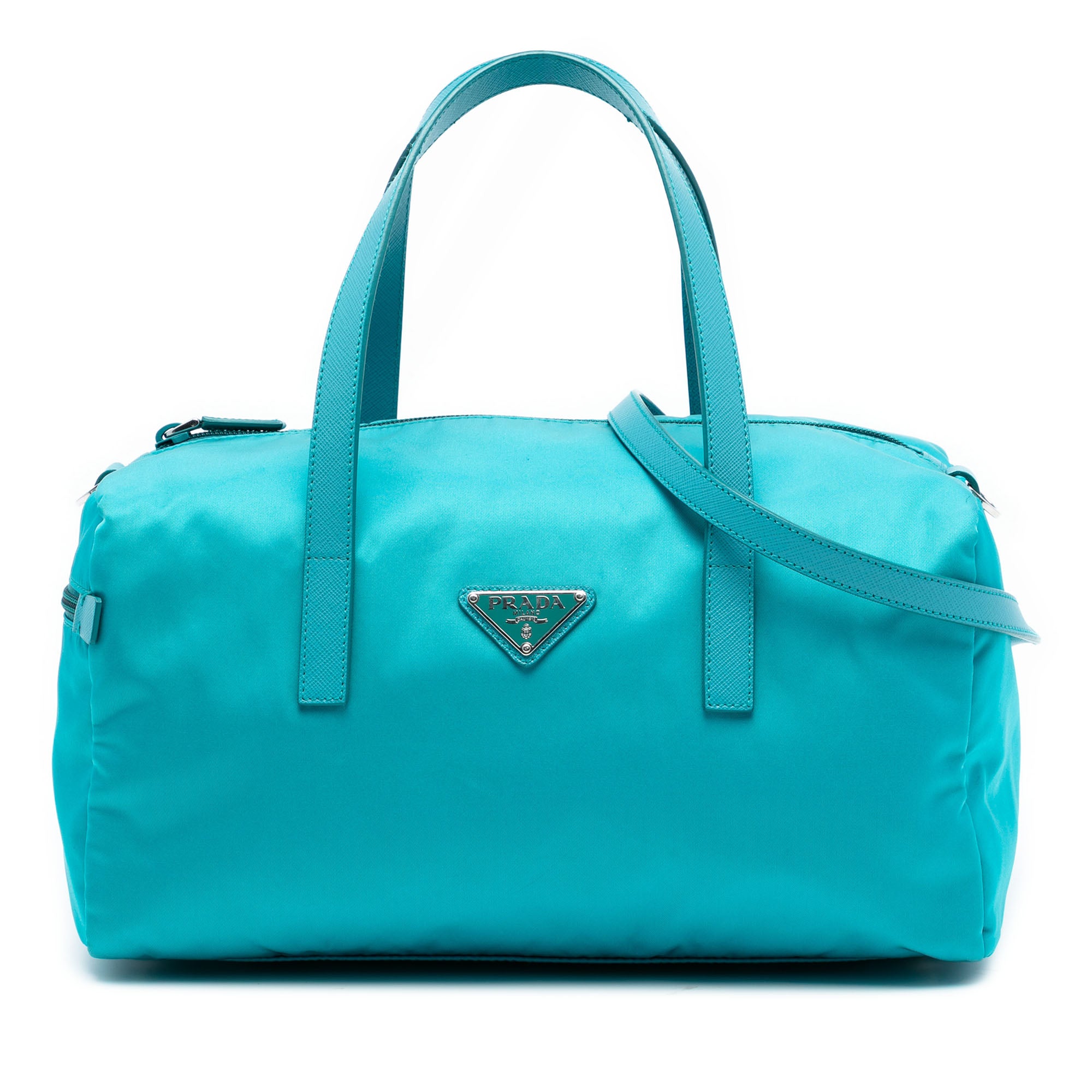 Product Details: Blue Prada Tessuto Satchel. This satchel features a nylon body, flat handles, a detachable strap, a top zip closure, and an interior zip pocket. 6.9" L x 13" W x 6.9" D, 5.9" drop.