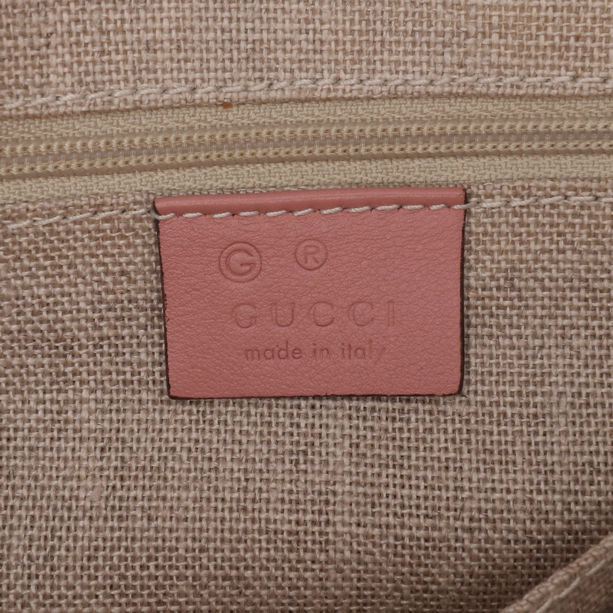 Product Details: Pink Gucci Small Microguccissima Bree Satchel. The Bree features an embossed leather body, flat leather handles, a detachable flat leather strap, a top zip closure, and interior zip and slip pockets. 7.9" L x 7.5" W x 3.9" D, 4.1" drop. Serial number 449241 493075.