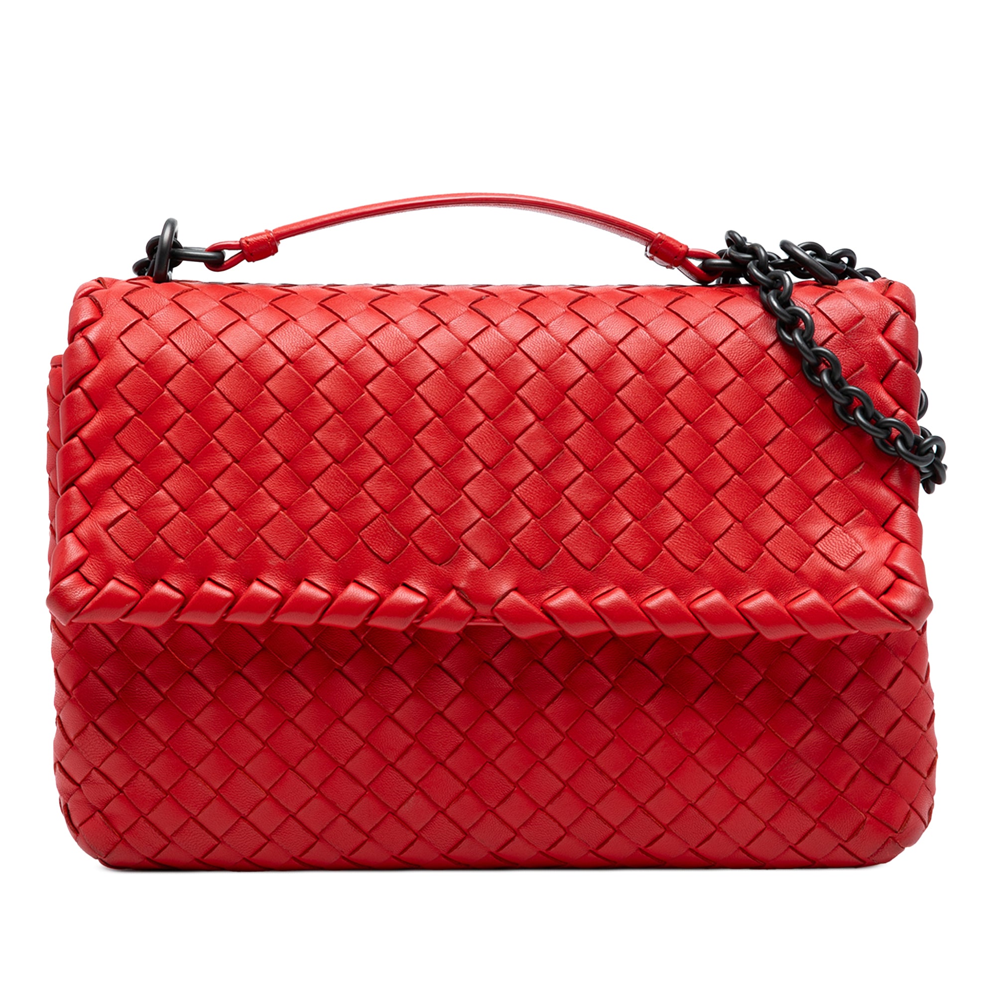Product Details: Red Bottega Veneta Small Nappa Intrecciato Olimpia Shoulder Bag. The Olimpia features a woven leather body, chain shoulder straps with leather guard, a flap with magnetic snap closure, and an interior zip pocket. 6.9" L x 9.6" W x 3.1" D. Serial number B05350168C.