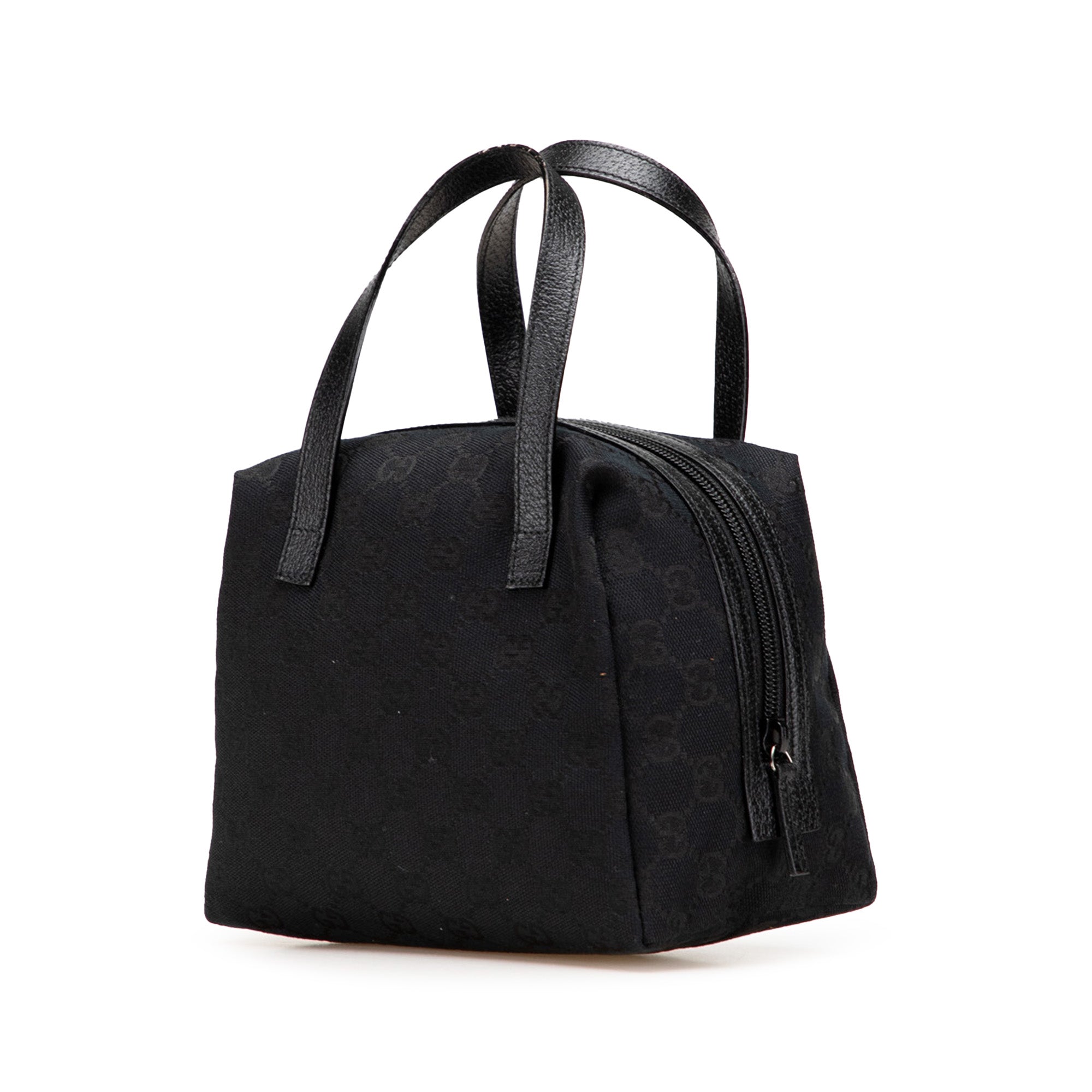Product Details: Black Gucci GG Canvas Handbag. This handbag features a canvas body with leather trim, flat leather handles, a top zip closure, and an interior zip pocket. 6.7" L x 7.9" W x 4.5" D, 3.3" drop. Serial number 124542 0416.