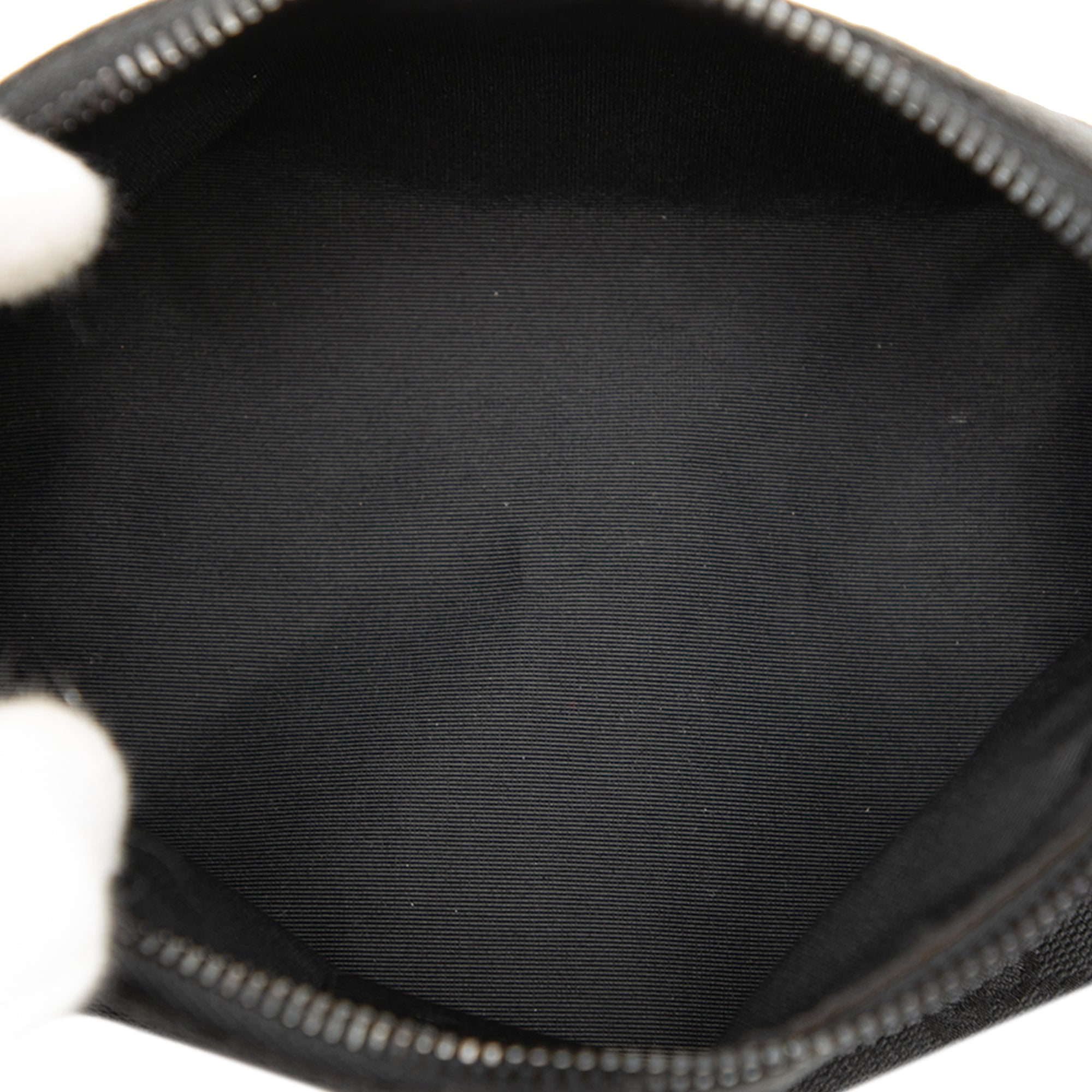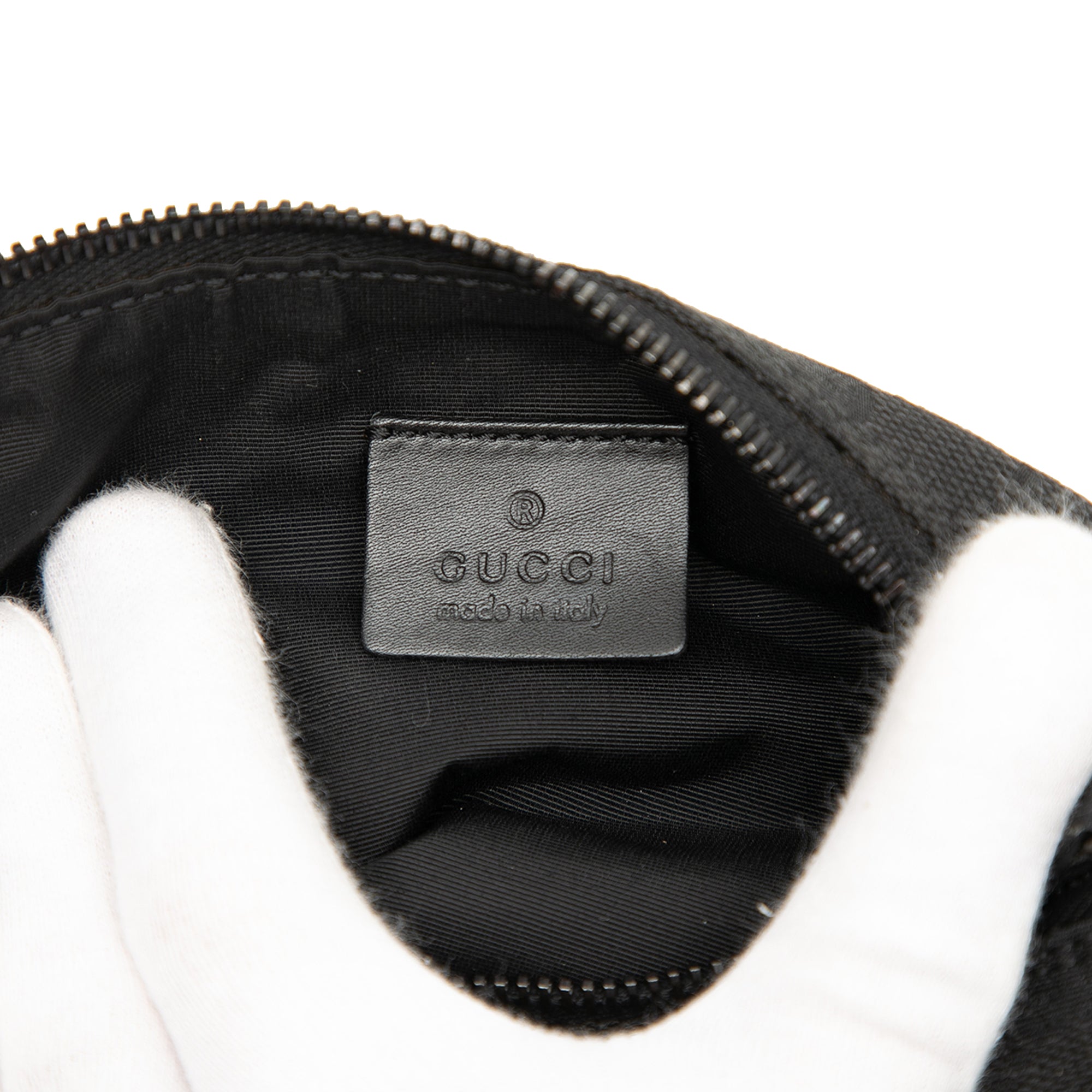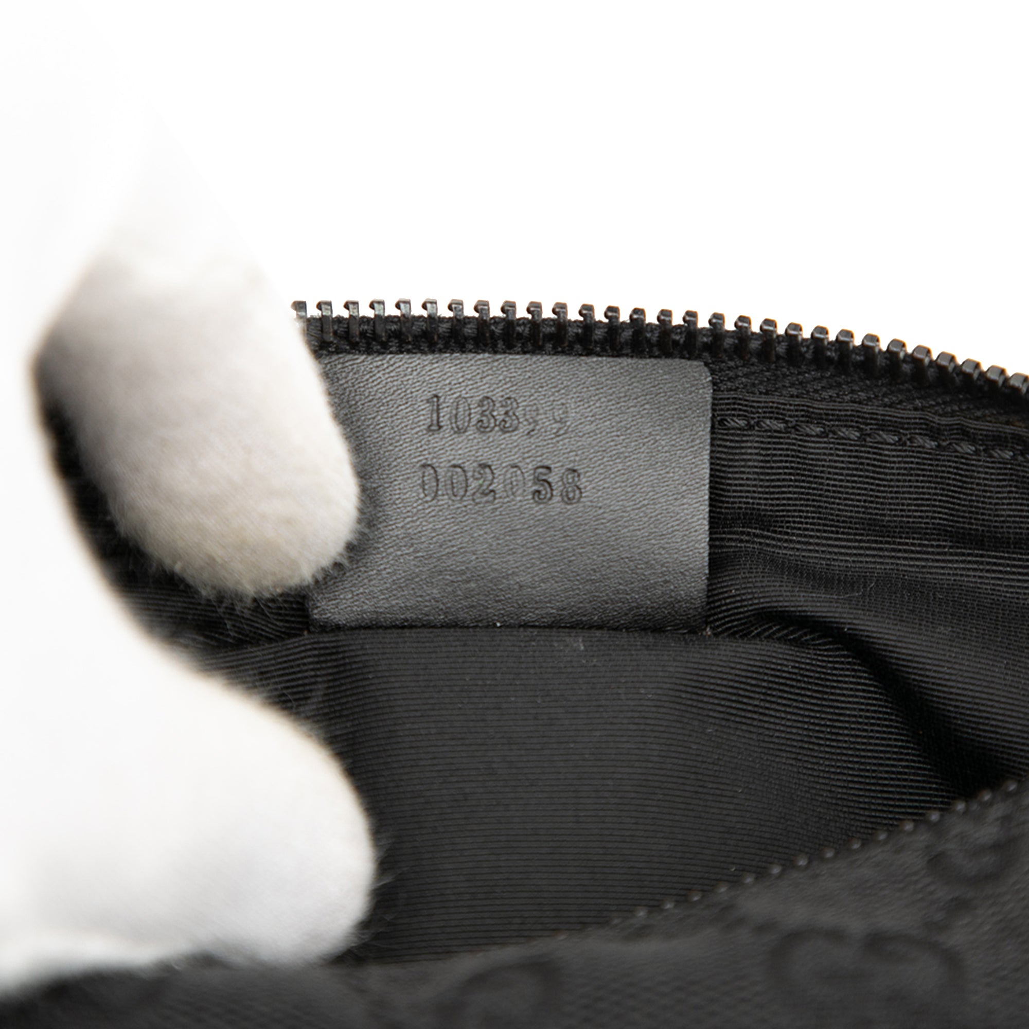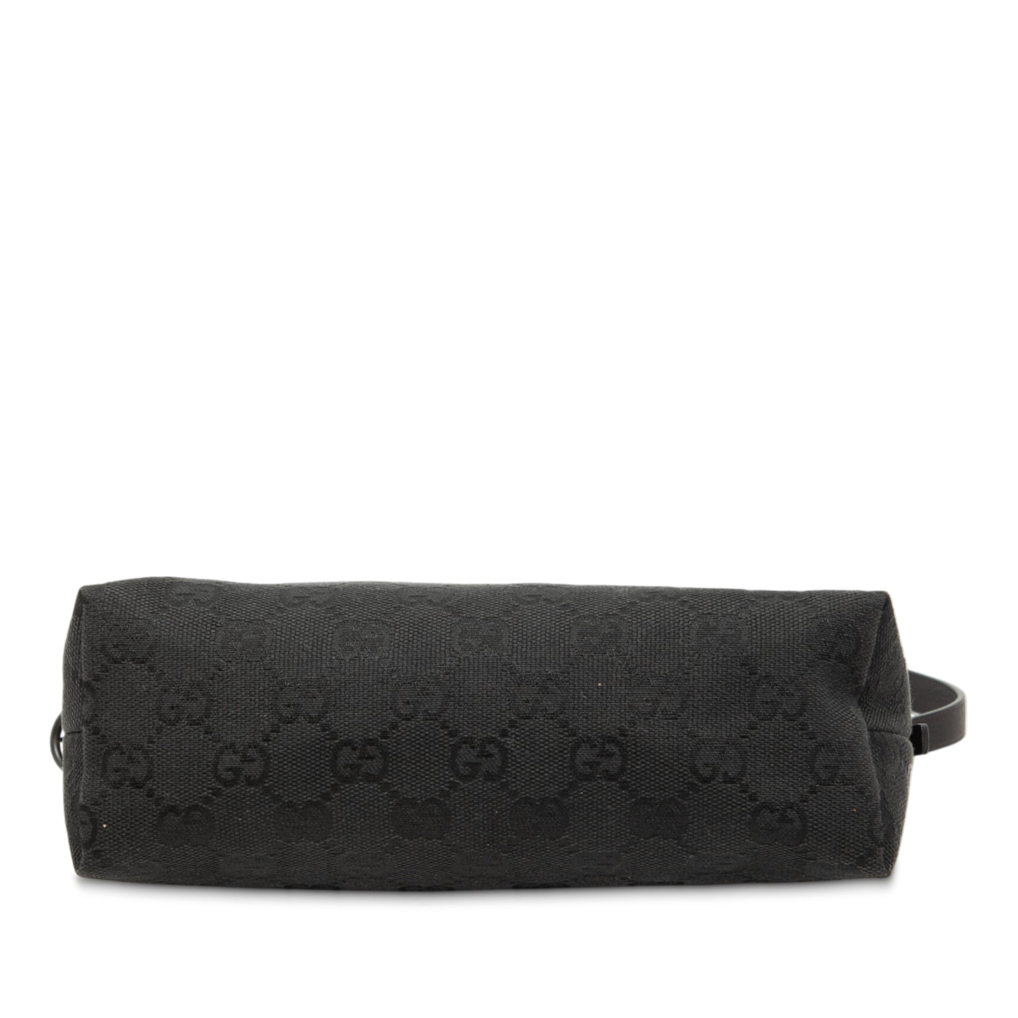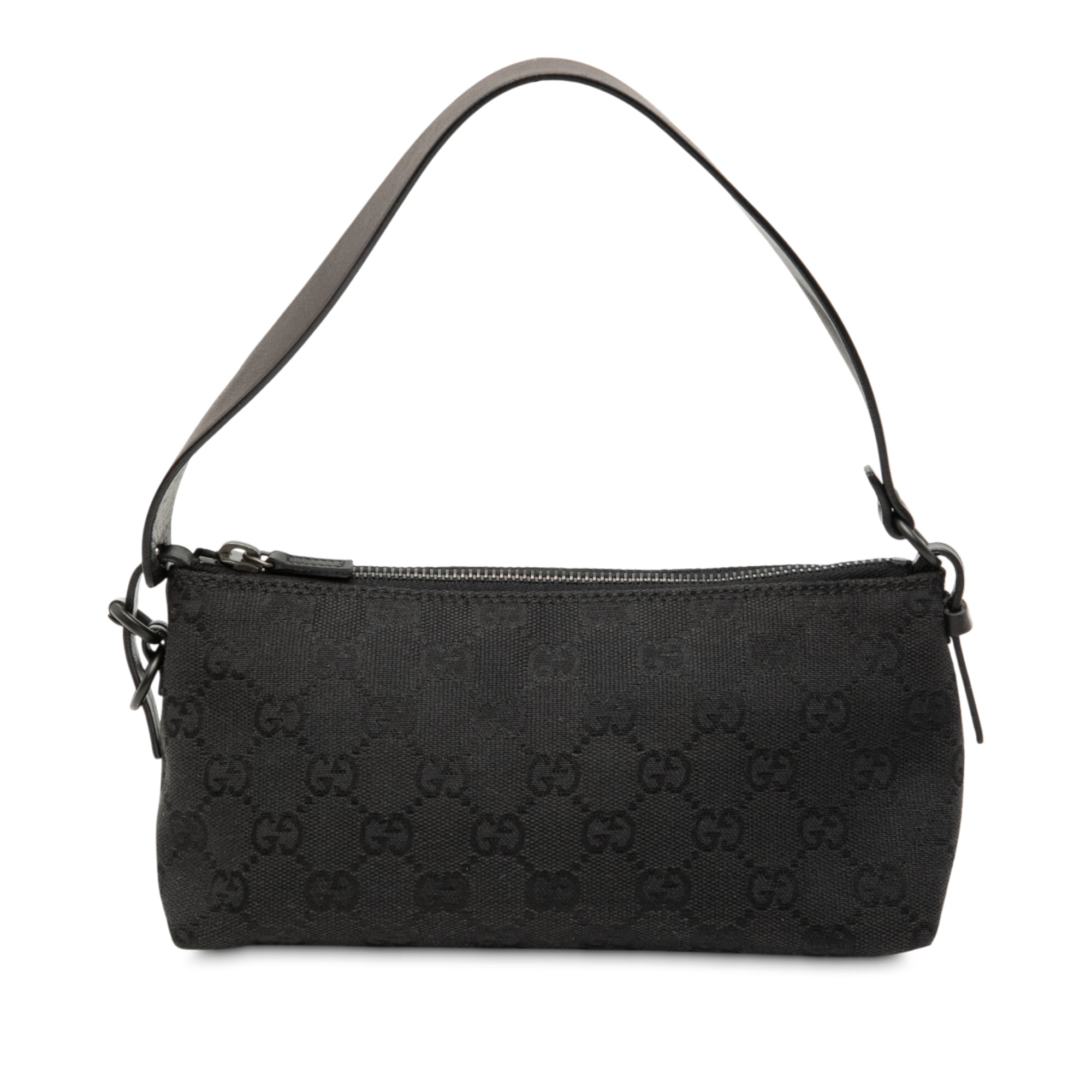 Product Details: Black Gucci GG Canvas Shoulder Bag. This shoulder bag features a canvas body, a flat leather strap, and a top zip closure. 4.1" L x 8.3" W x 3" D, 5.7" drop. Serial number 103399 002058.