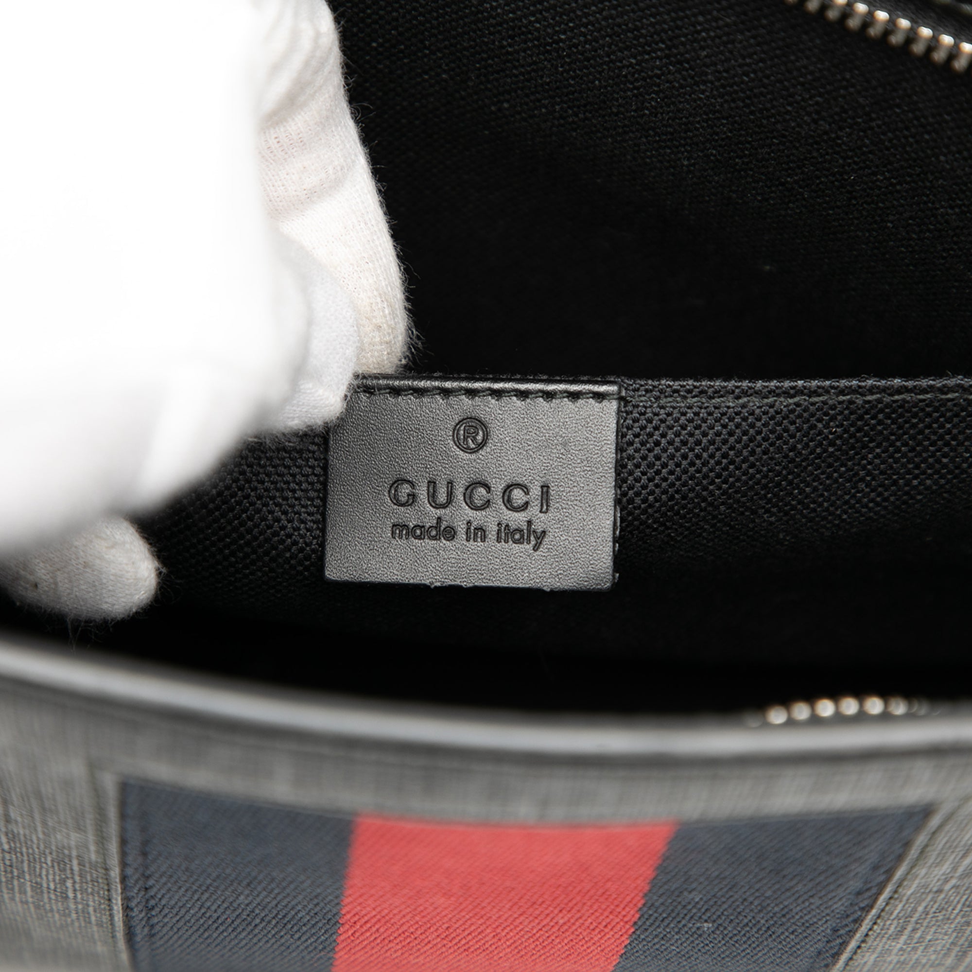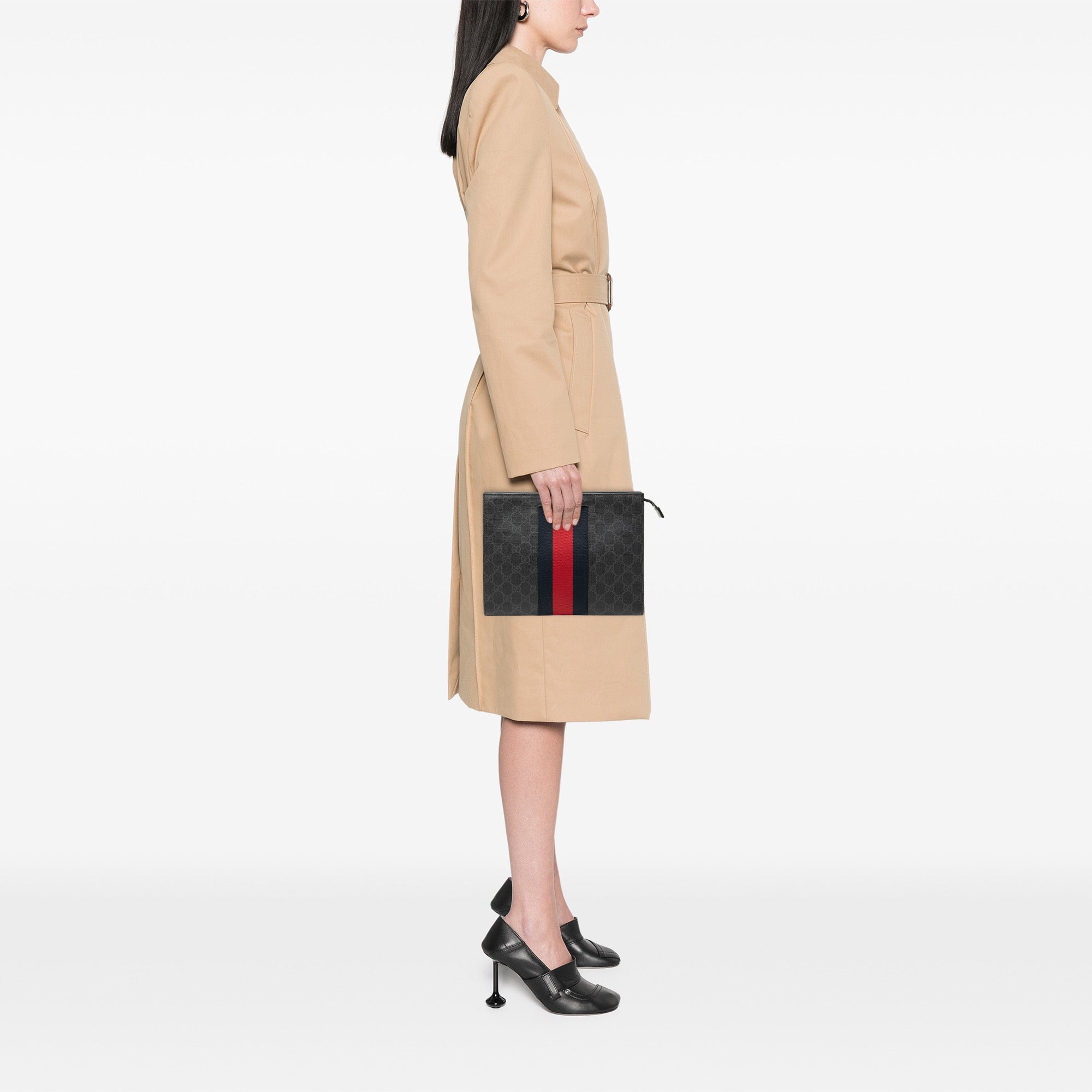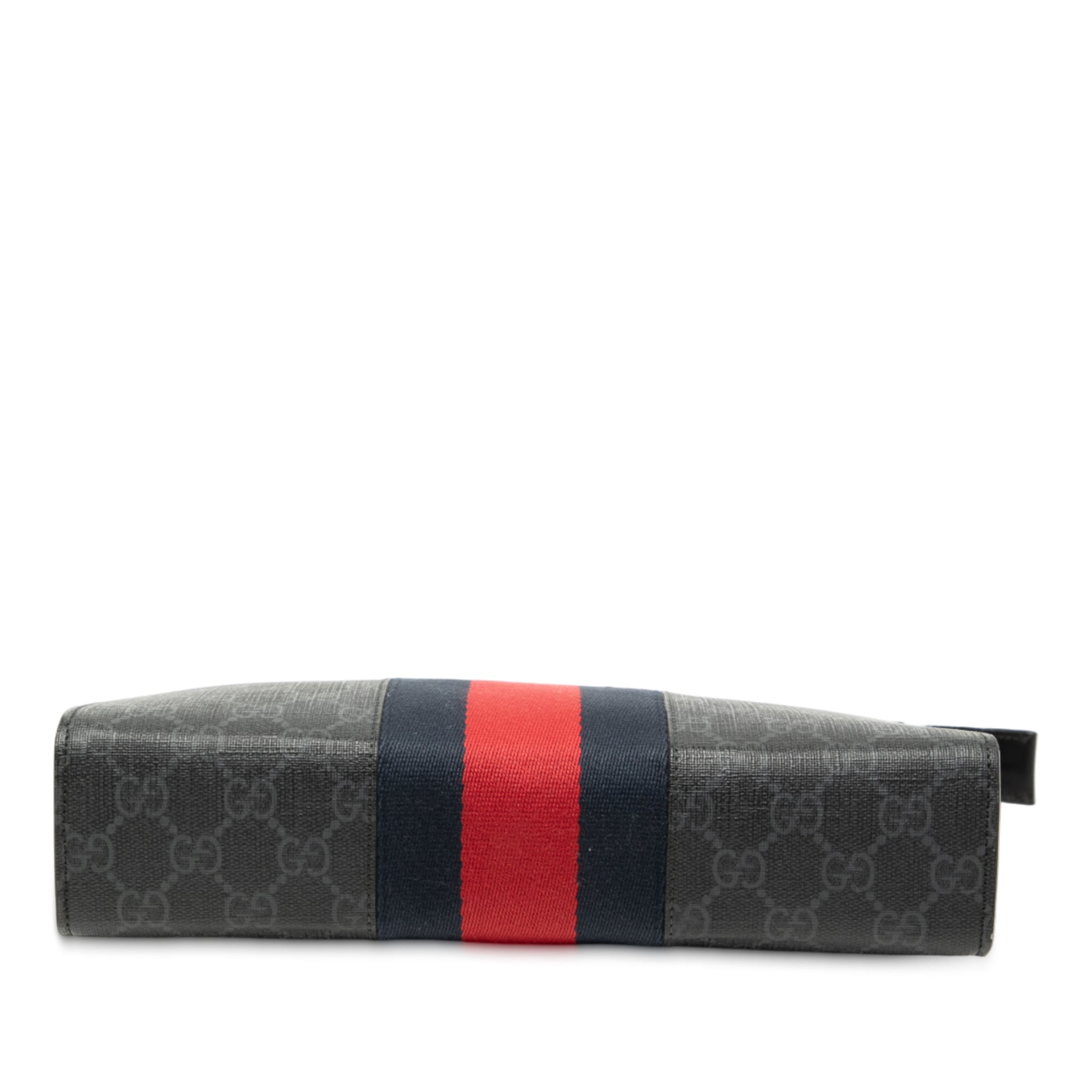 Product Details: Black Gucci GG Supreme Web Clutch. This clutch bag features a coated canvas body with web detail, a top zip closure, and an interior slip pocket. 7.9" L x 10.2" W x 2.4" D. Serial number 475316.493075.