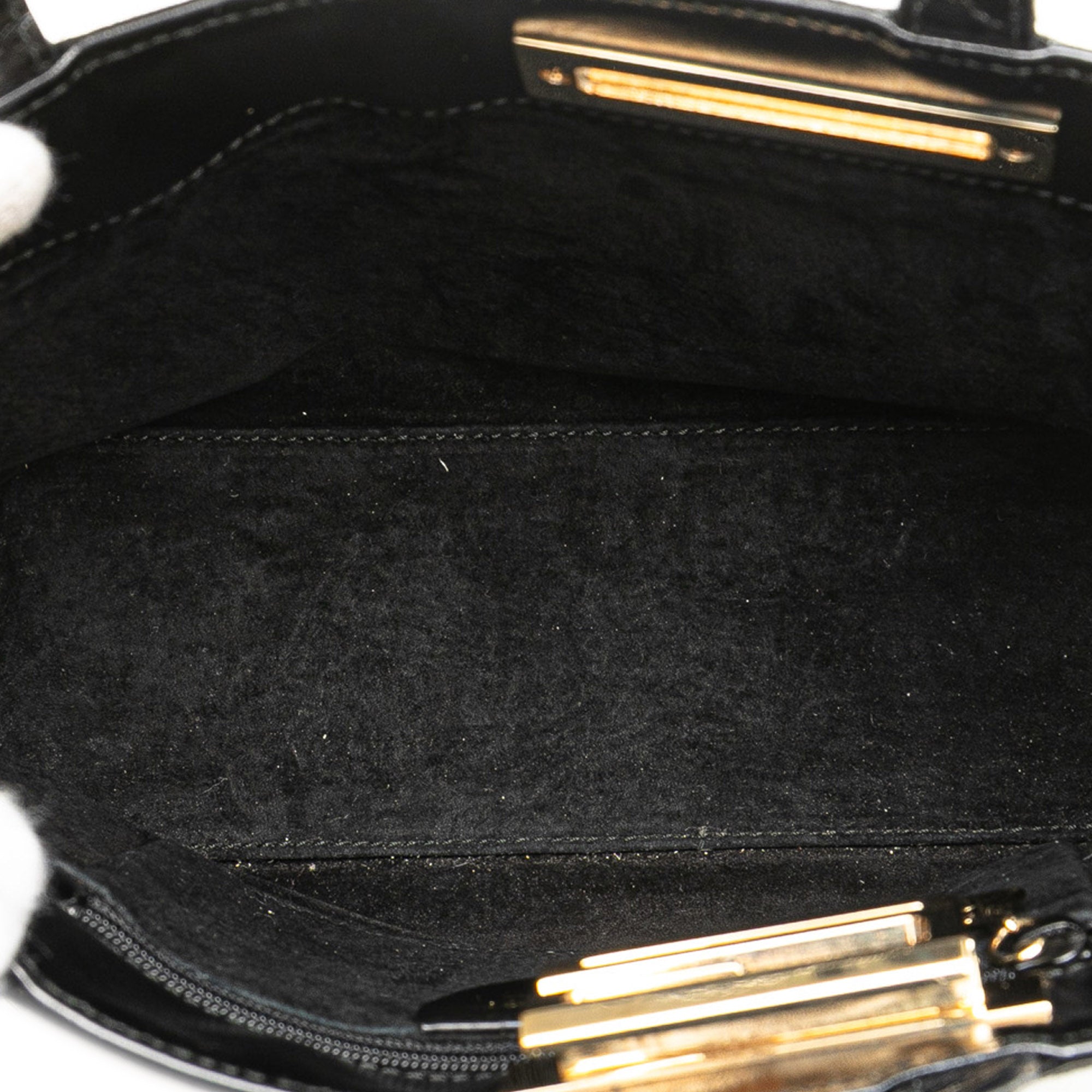 Product Details: Black Gucci Suede Handbag. This handbag features a suede body, a gold-tone detail, flat leather handles, an open top with a metal closure, and an interior zip pocket. 6.7" L x 8.3" W x 3" D, 3.1" drop. Serial number 007 1364 0285.