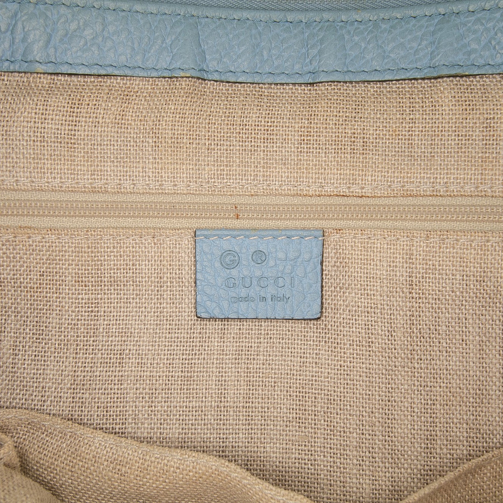Product Details: Blue Gucci Leather Interlocking G Charmy Satchel. The Charmy satchel features a leather body, rolled handles, a top zip closure, and interior zip and slip pockets. Exterior top and corners have been repainted. 8.7" L x 11.8" W x 4.7" D, 6.1" drop. Serial number 449659 493075.