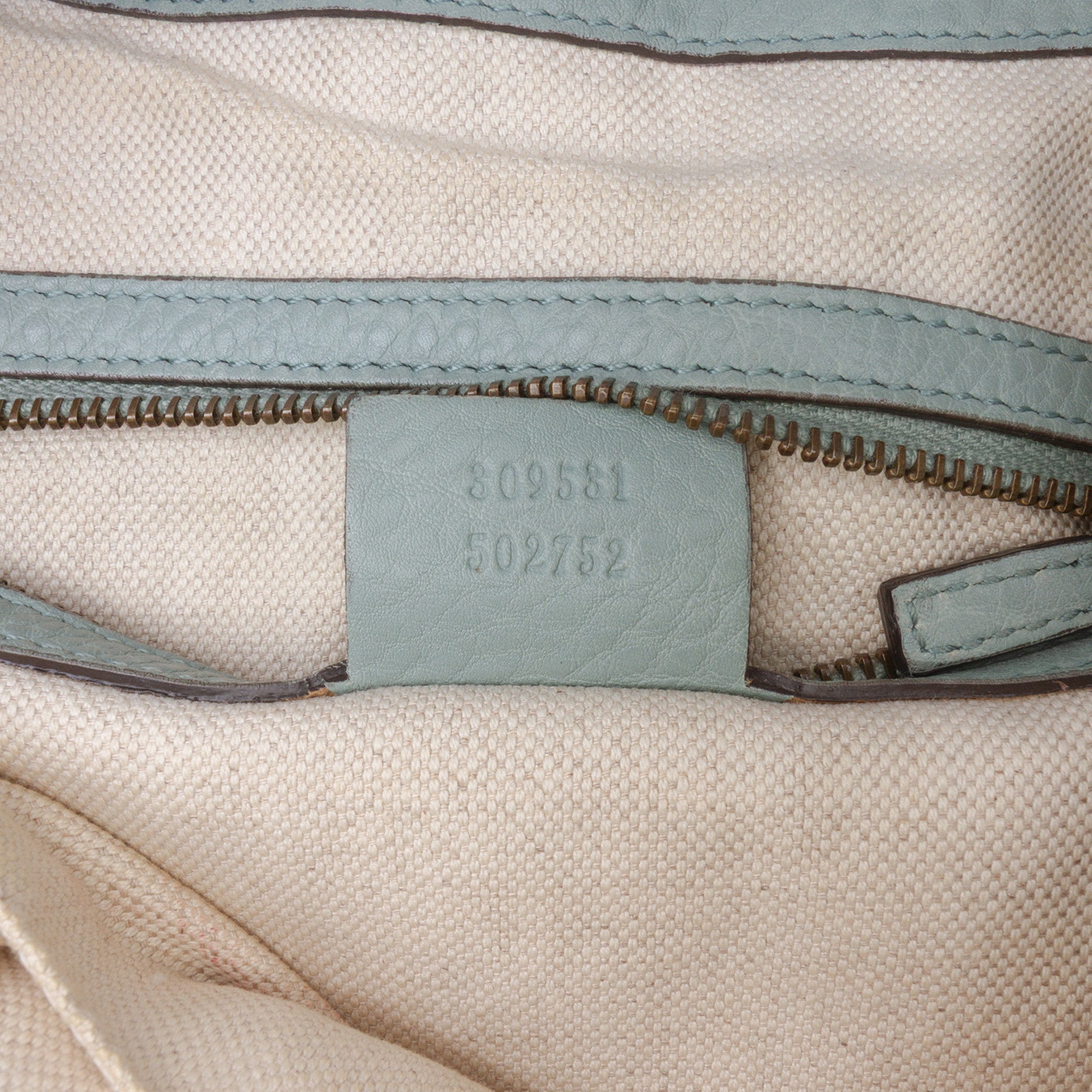 Product Details: Blue Gucci Medium Pebbled Calfskin Twill Tote. The Twill tote bag features a leather body, flat leather straps, an open top and interior zip and slip pockets. 10.2" L x 18.9" W x 4.5" D, 5.7" drop. Serial number 309531 502752.