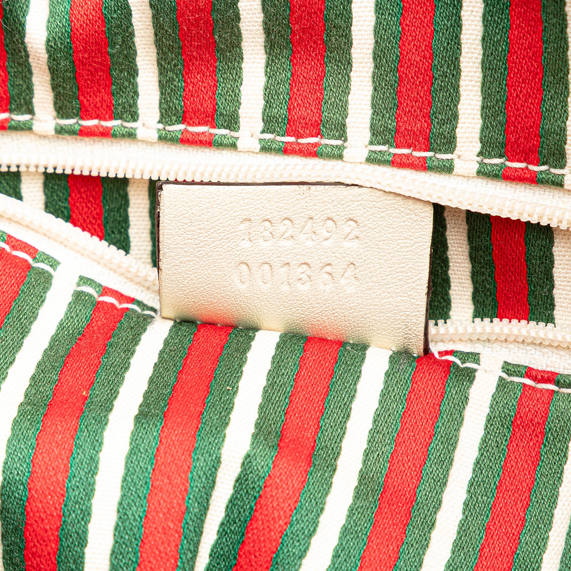 Product Details: Brown Gucci GG Canvas Britt Tote. This tote bag features a canvas body with leather trim, flat leather handles, a top zip closure, and interior zip and slip pockets. 12.2" L x 10.6" W x 4.3" D. Serial number 182492 001364.