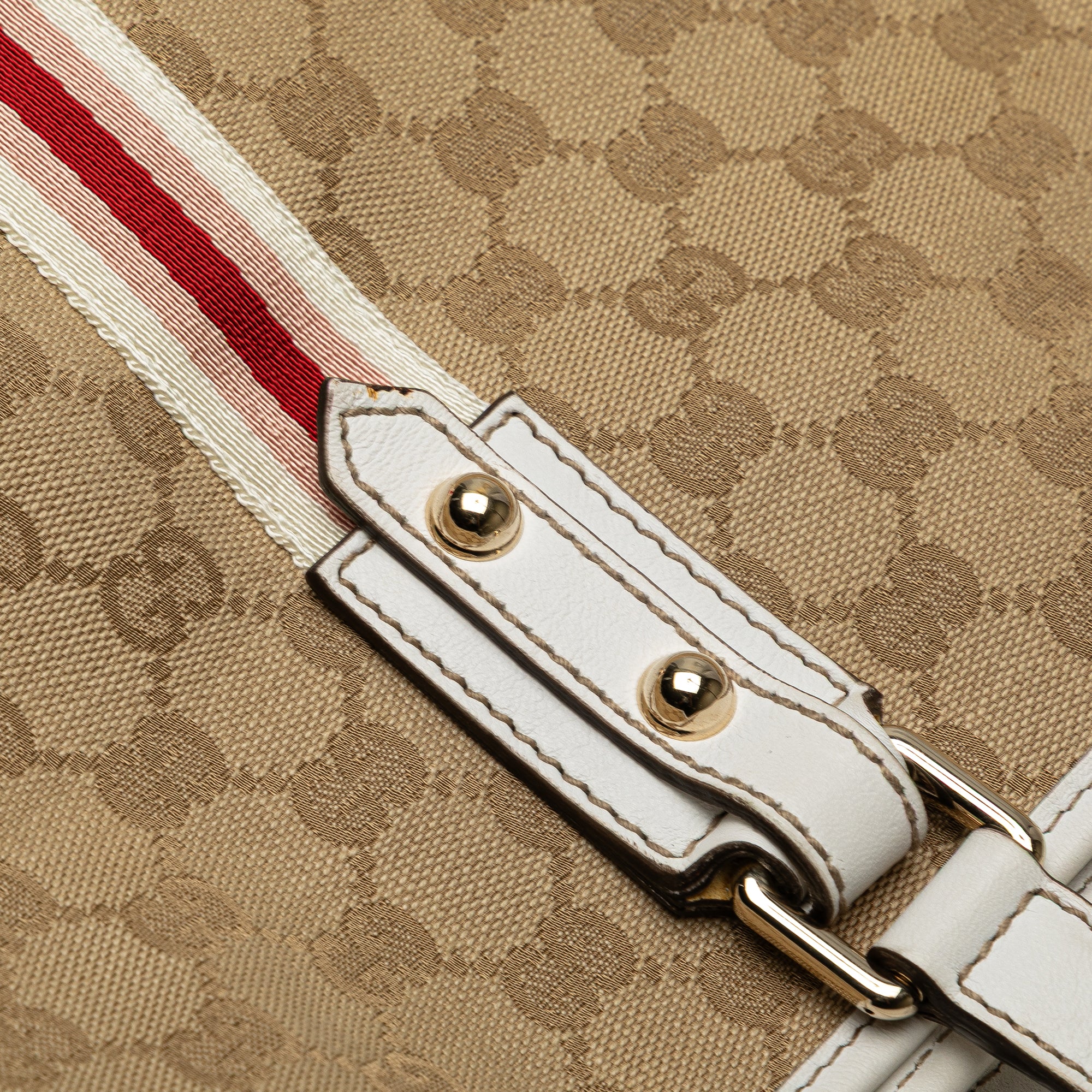 Product Details: Brown Gucci GG Canvas Jolicoeur Tote. The Jolicoeur tote bag features a canvas body with leather trim and web details, flat leather straps, an open top, and interior zip and slip pockets. 8.7" L x 10.6" W x 5.5" D, 8.3" drop. Serial number 137396 467891.