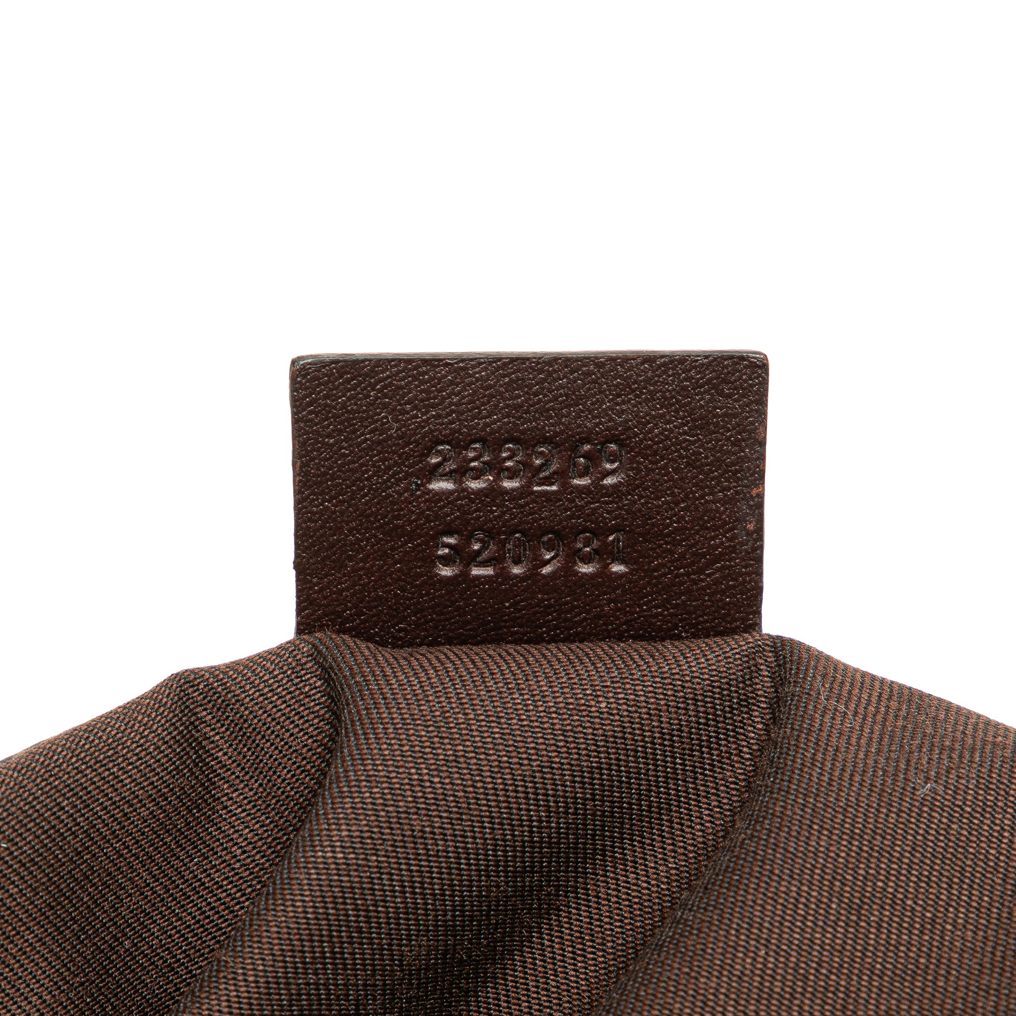 Product Details: Brown Gucci GG Supreme Belt Bag. This belt bag features a coated canvas body with leather trim, an adjustable flat waist strap with buckle closure, a top zip closure, and an interior slip pocket. 6.3" L x 9.1" W x 1.2" D. Serial number 233269 520981.
