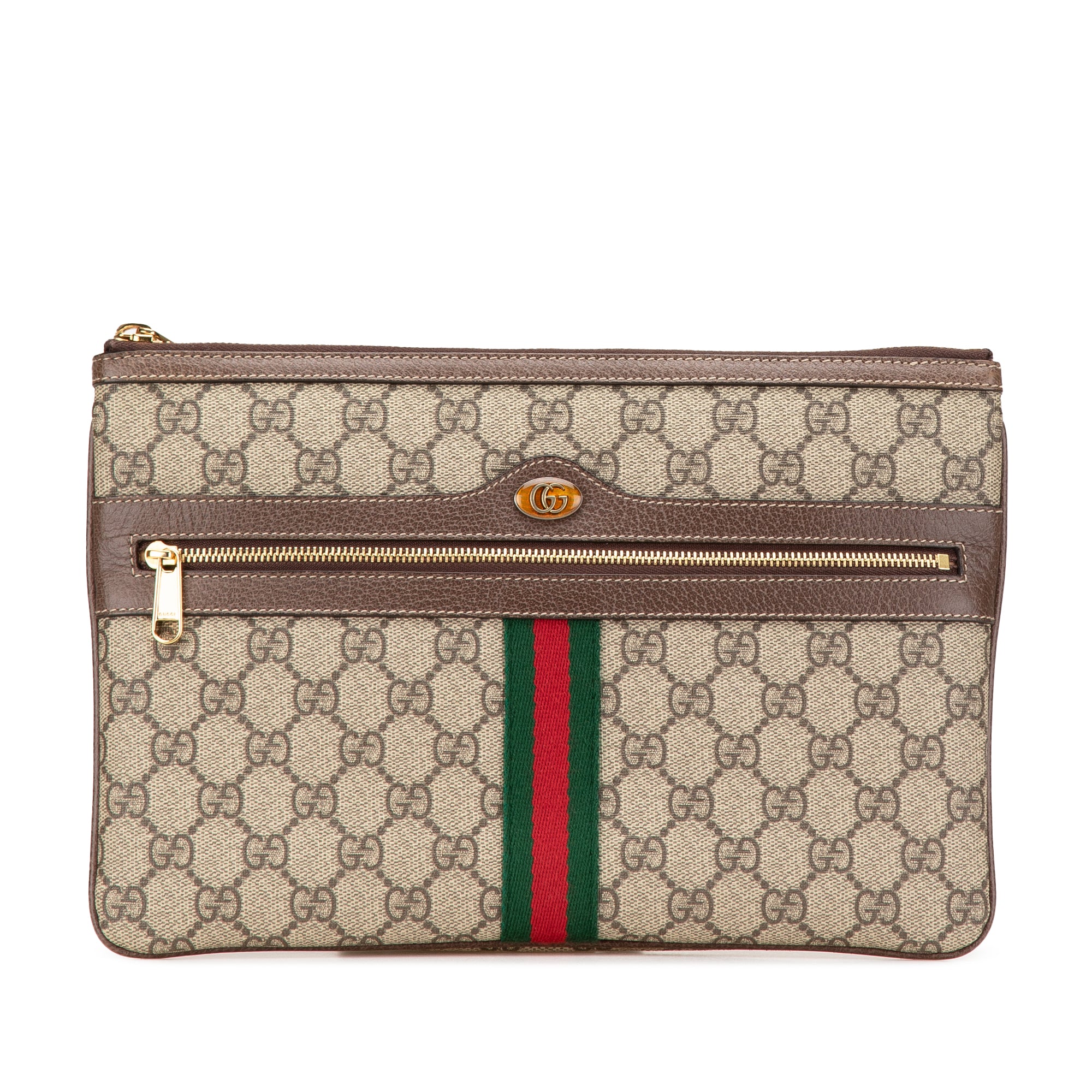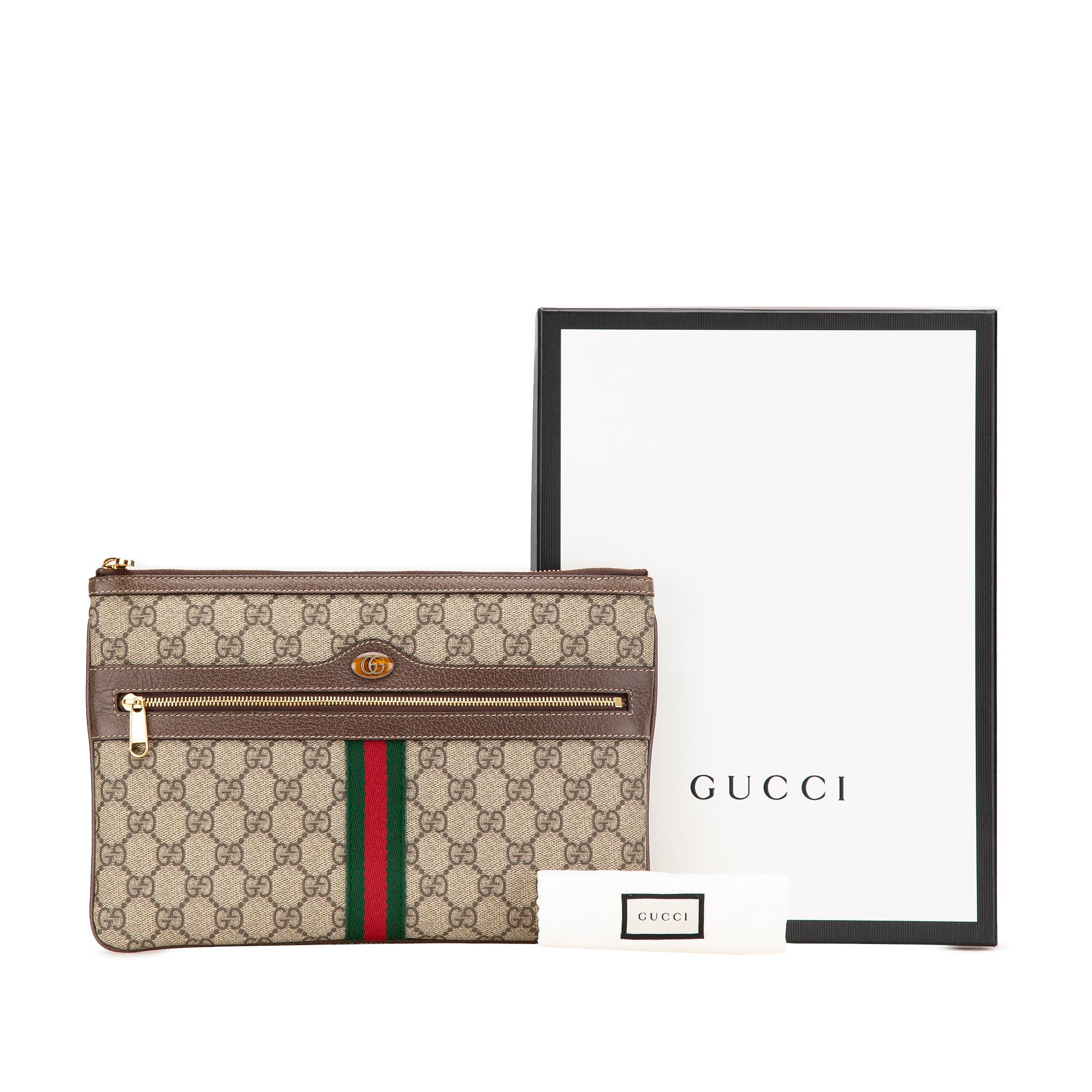 Product Details: Brown Gucci GG Supreme Web Ophidia Clutch. This clutch bag features a coated canvas body with leather trim, a top zip closure, and an exterior front zip pocket. 7.7" L x 11.4" W x 0.8" D. Serial number 517551 2184.