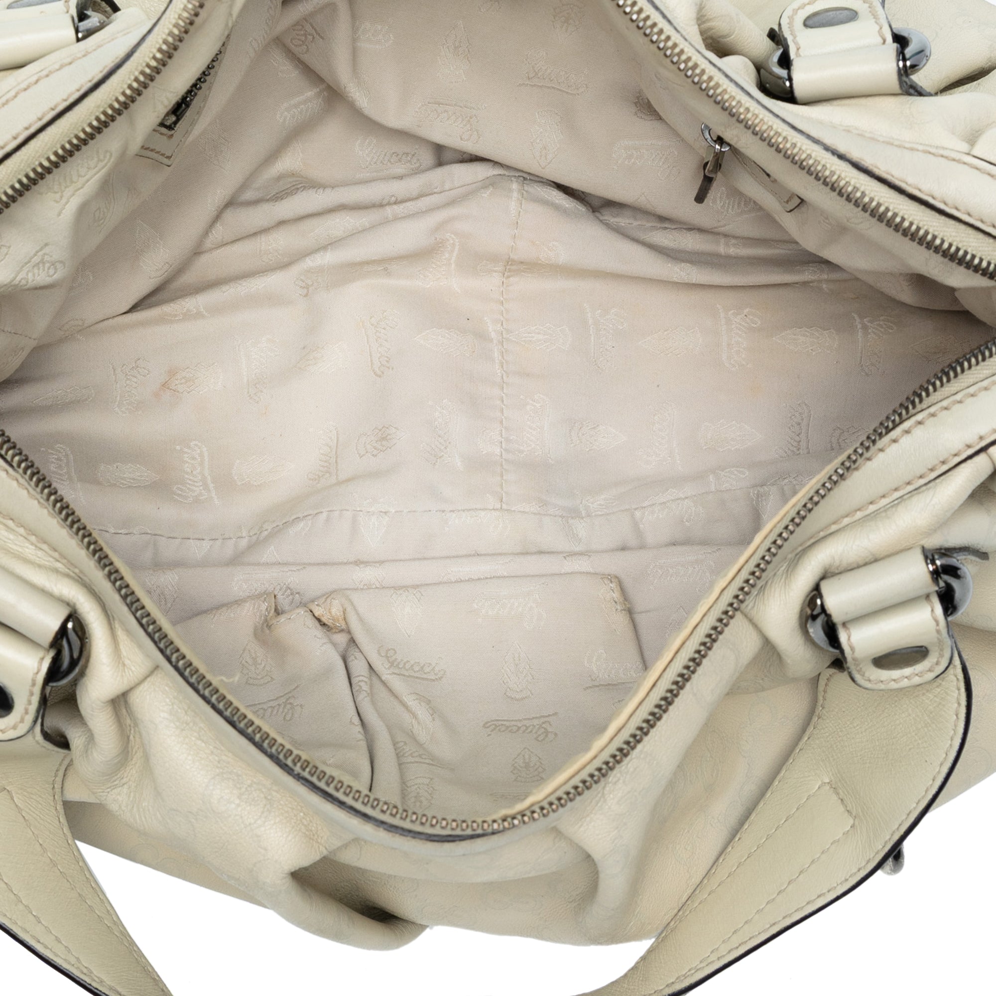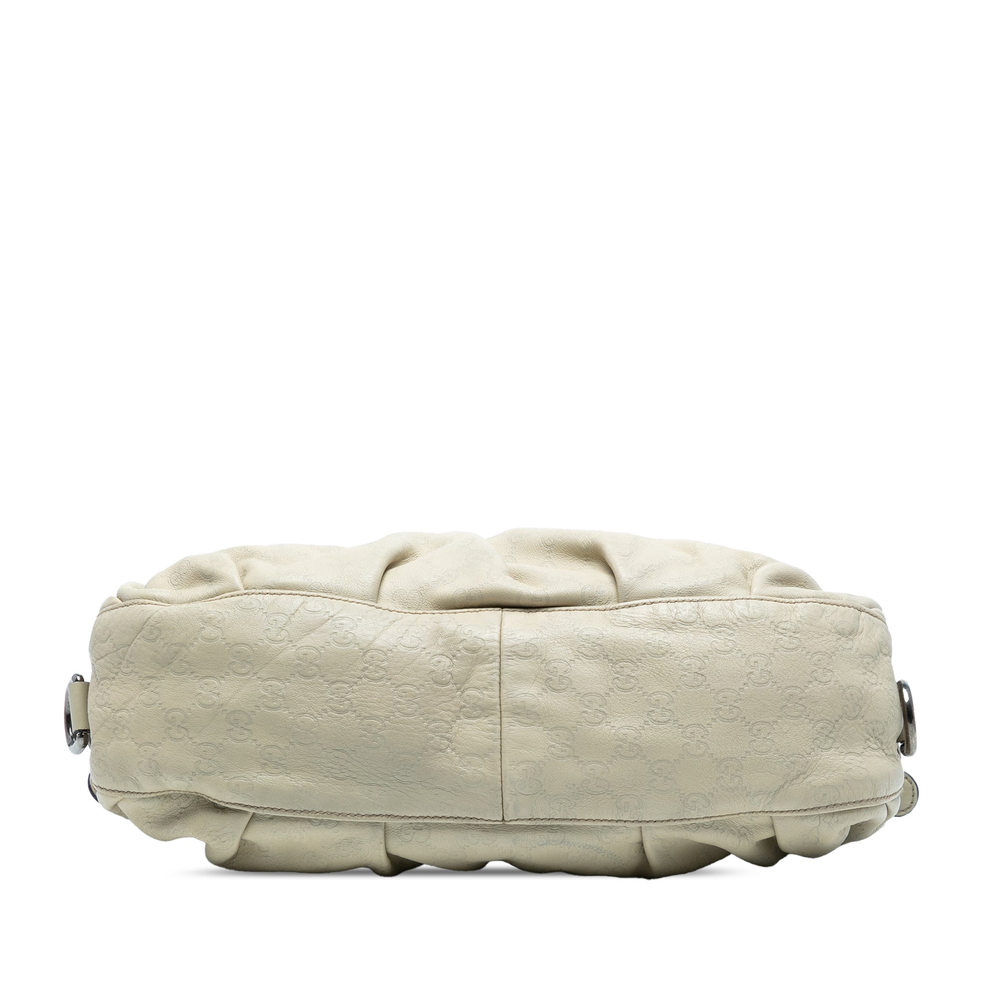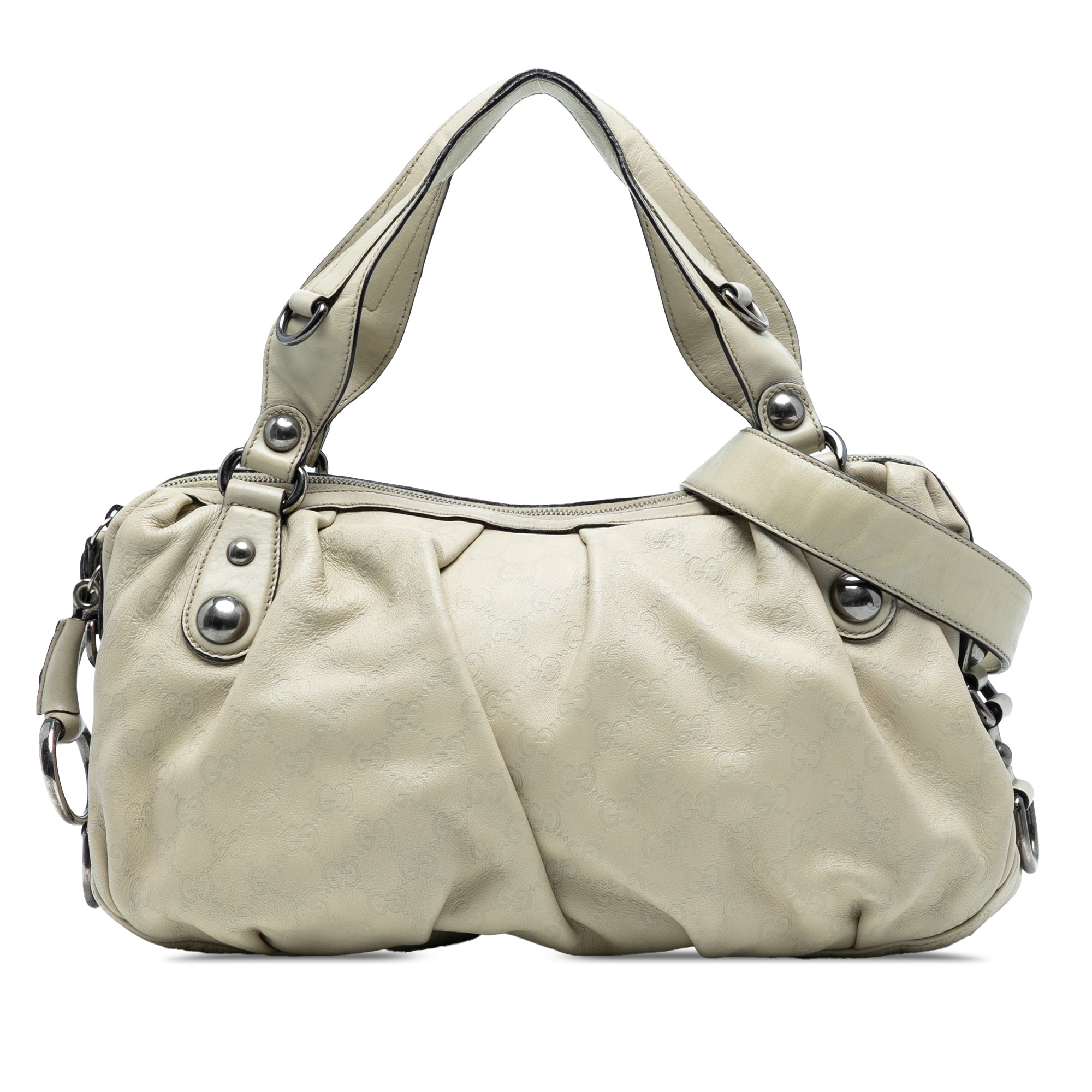Product Details: Brown Gucci Guccissima Icon Bit Satchel. This satchel features a leather body with silver-tone hardware, flat leather handles, a detachable flat leather shoulder strap, a top zip closure, and interior zip and slip pockets. The sides were repainted. 9.6" L x 15.4" W x 3.9" D, 6.7" drop. Serial number not readable.