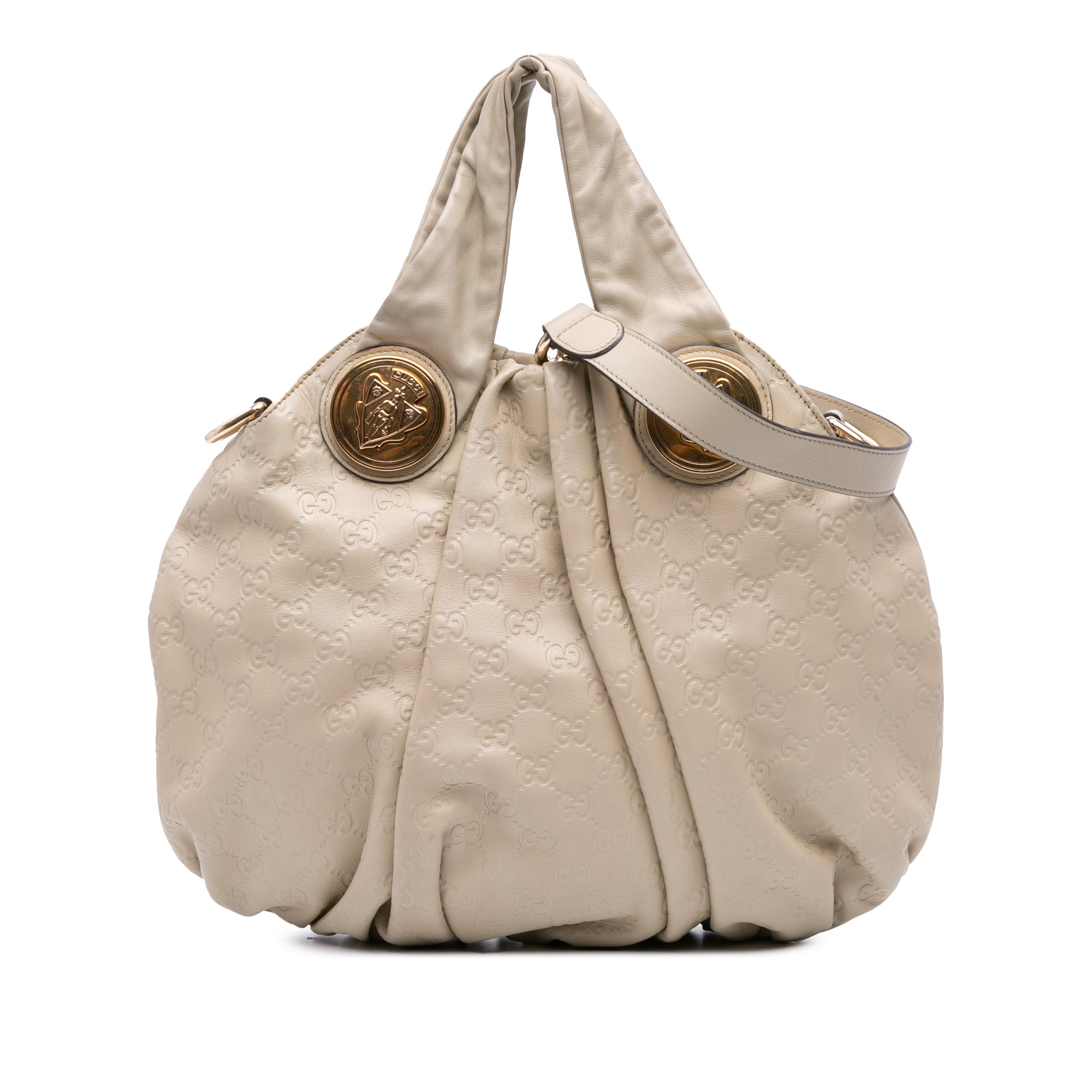 Product Details: Brown Gucci Medium Guccissima Hysteria Satchel. The Hysteria features a leather body, flat handles, open top with magnetic closure, and interior zip and slip pockets. 11.6" L x 12.6" W x 0.8" D, 4.3" drop. Serial number 203486 02026.