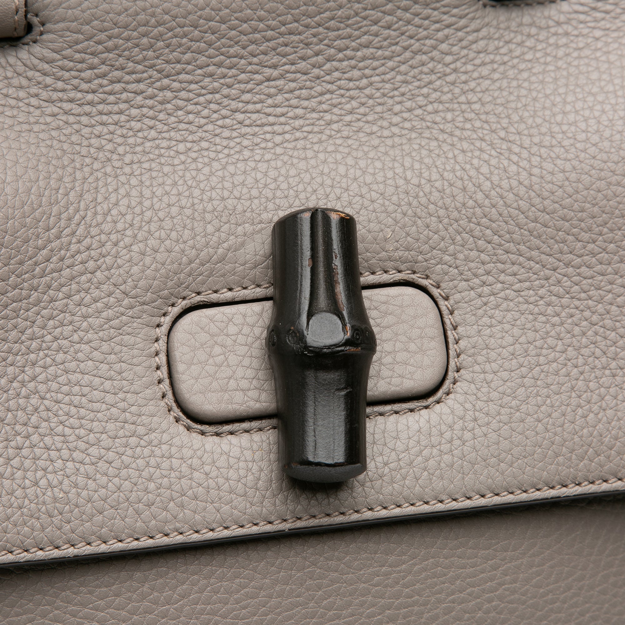 Product Details: Brown Gucci Medium Leather Bamboo Daily Satchel. The Daily satchel features a leather body, a flat leather top handle, a front flap with a bamboo bullet twist lock closure, and interior zip and slip pockets. 10.2" L x 13" W x 4.7" D, 3.5" drop. Serial number 392013 525040.
